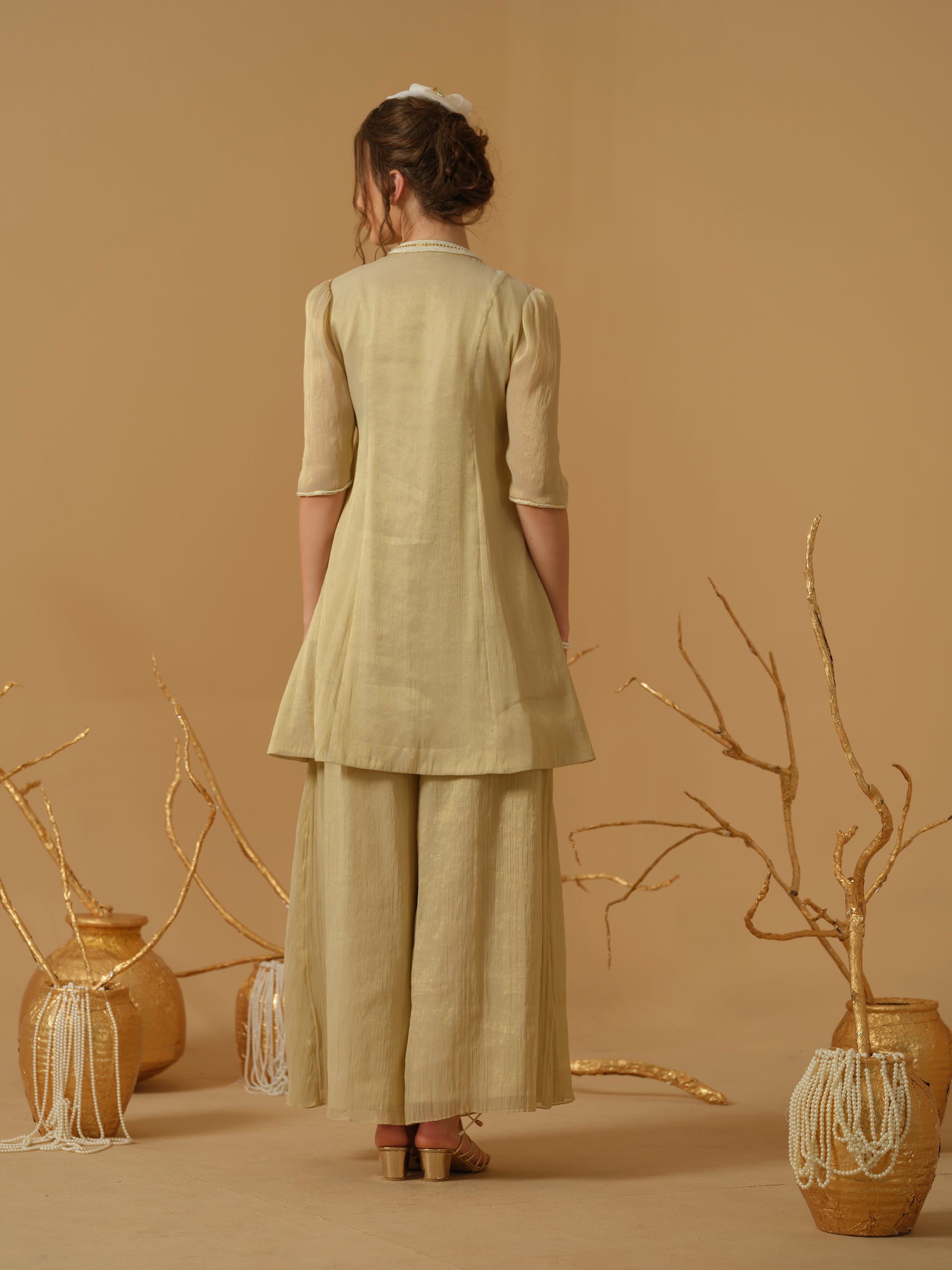 Featuring A Mandarin Collar, 3/4 Sleeves Gather Details, Knee-Length Kurta Having Floral Placement Embroidery On The Yoke And Border On The Sleeves, Paired With Culotte Pant.