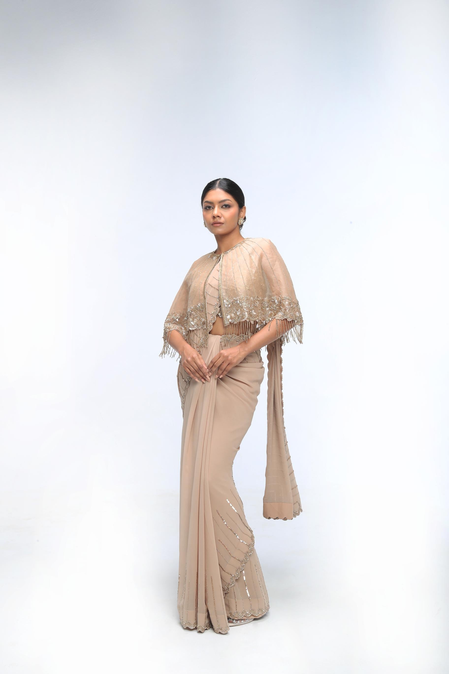 Champagne Gold Saree Embroidered With Scallop Detailing Along With Blouse And Cape.
