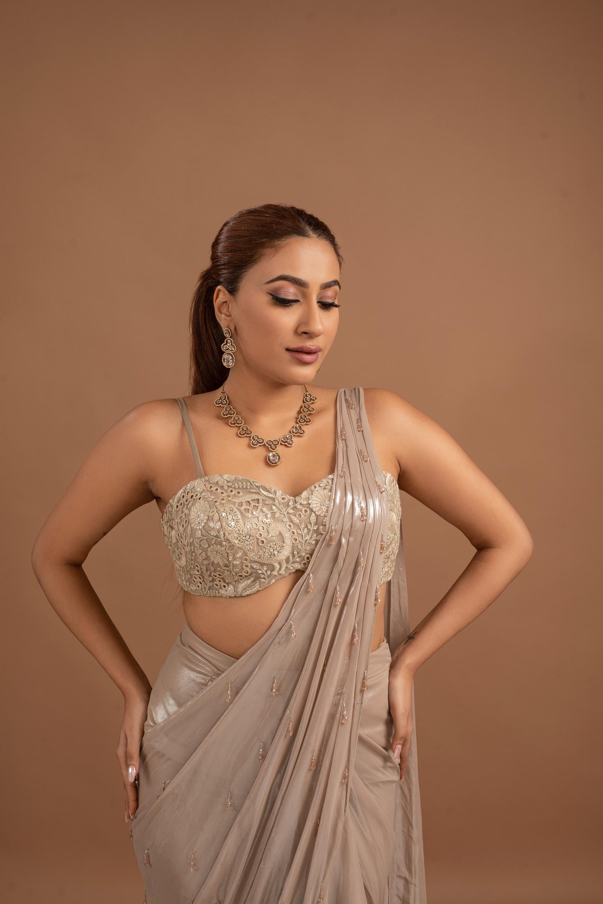 Golden Embroidered Blouse With Pre Drape Tassel Metallic Saree.