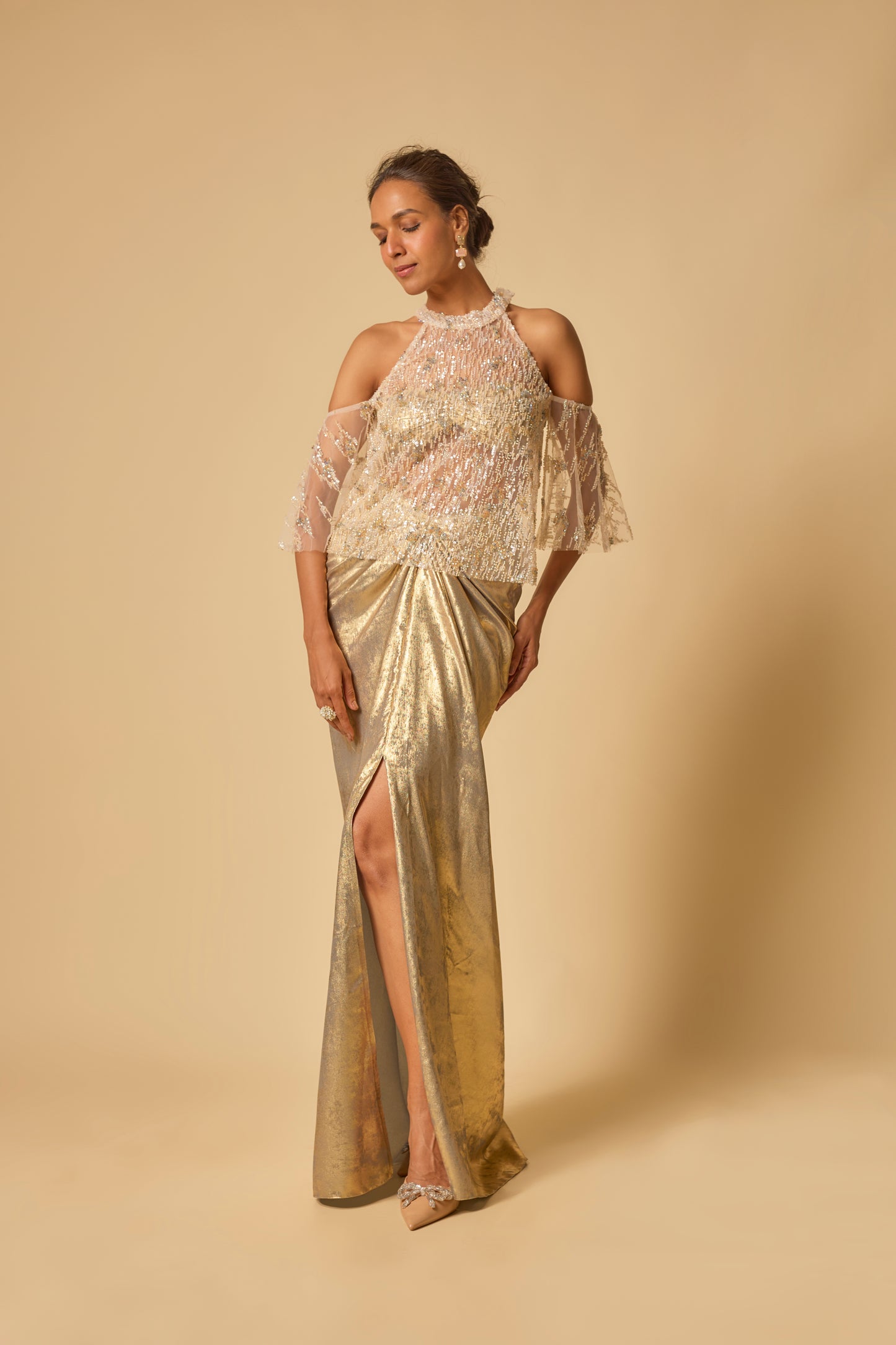 Featuring Gold Metallic Drape Skirt Set In Lycra With Embroidered Cape In Tulle.