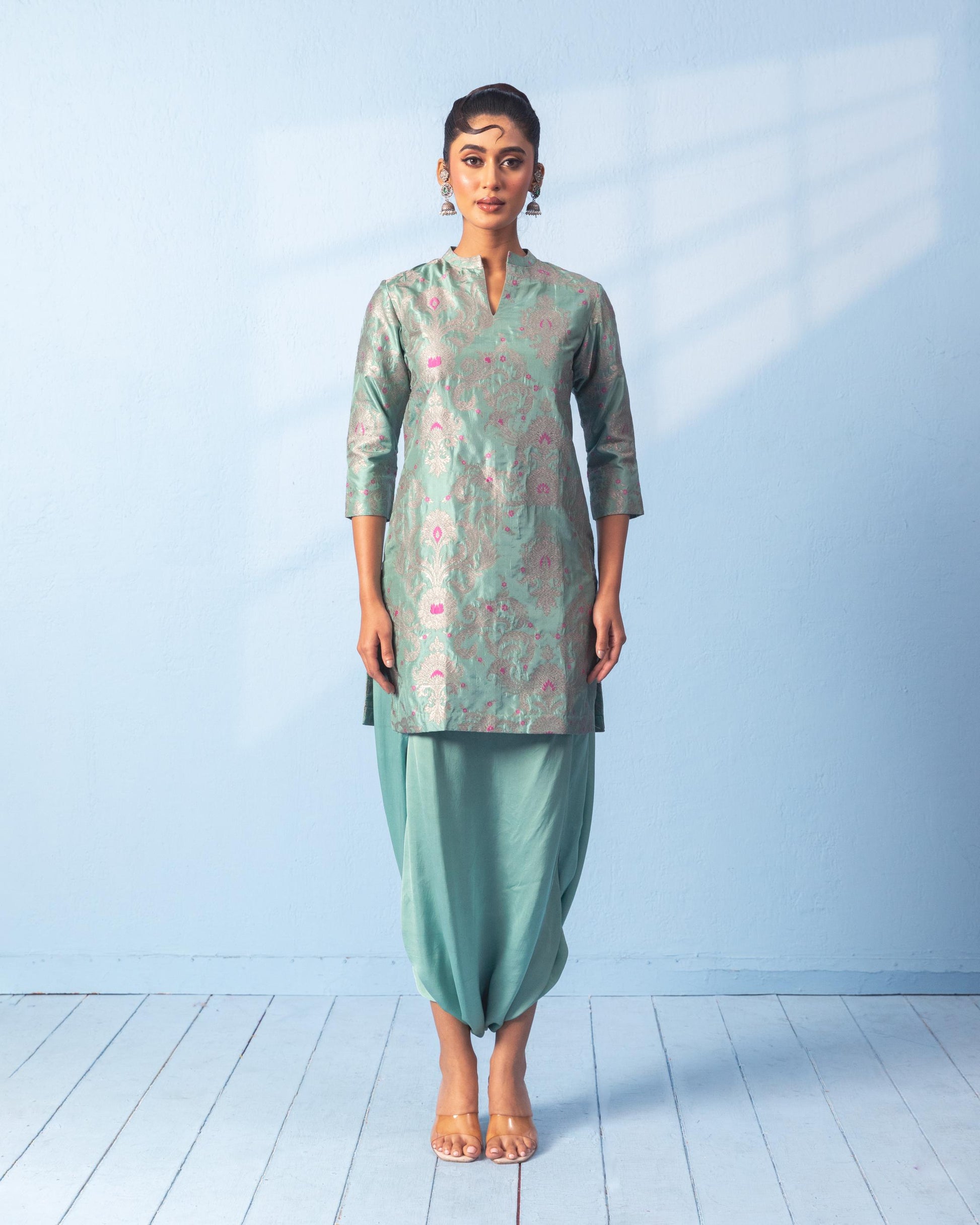 Sea Green Blue Dhoti With Banarsi Silk Kurta.