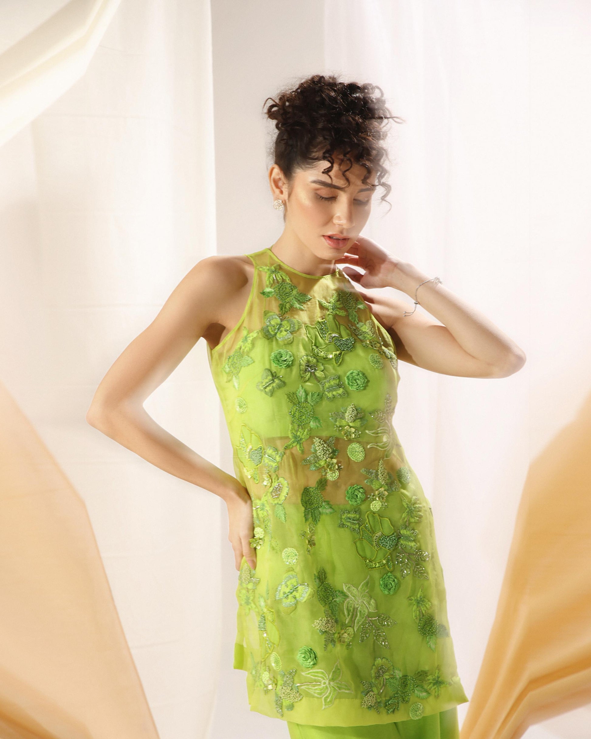 A Vibrant Colour Green Flash Tunic And Palazzo Set Teamed Up With Organza Dupatta. The Tunic Is In Organza Accentuated Using The World Of Techniques Including 3D Flowers, Appliqued Fabrics, Moti And Tiny Glass Beads. They Are All Brought Together By Using Artisan Techniques Such As Badla, Zardozi, And Pita Work. Palazzo Has Interesting Detail And Embroidery At The Hem. Dupatta Has All 4 Sides Hand Embroidered Floral Petal Cutwork Border.