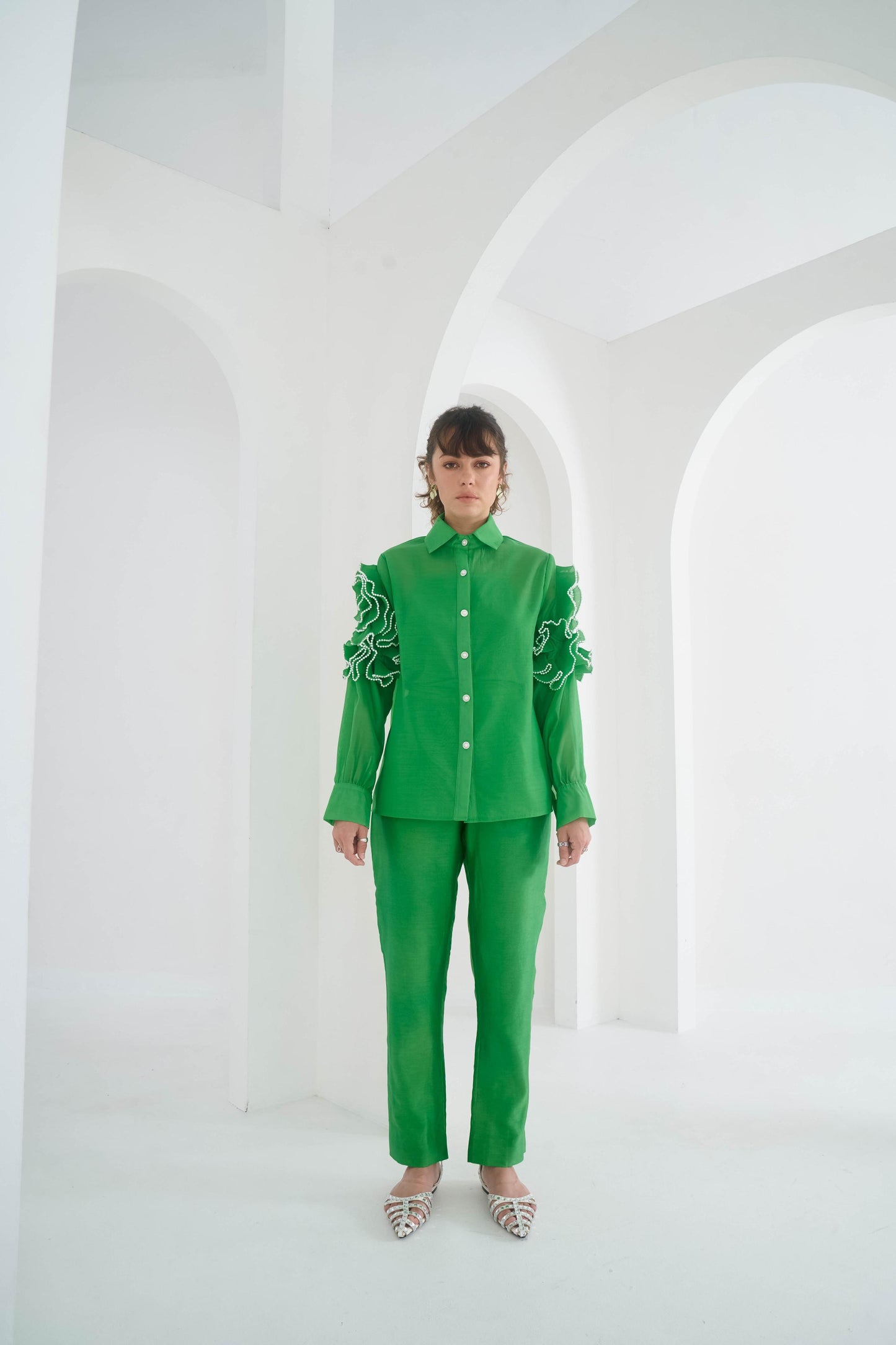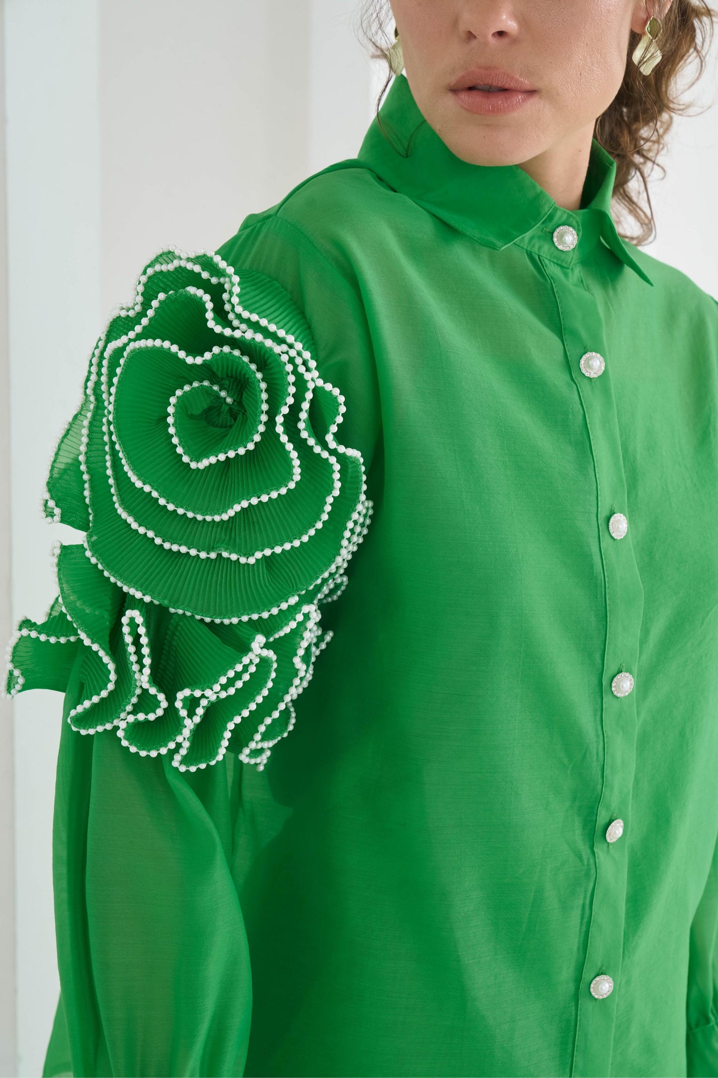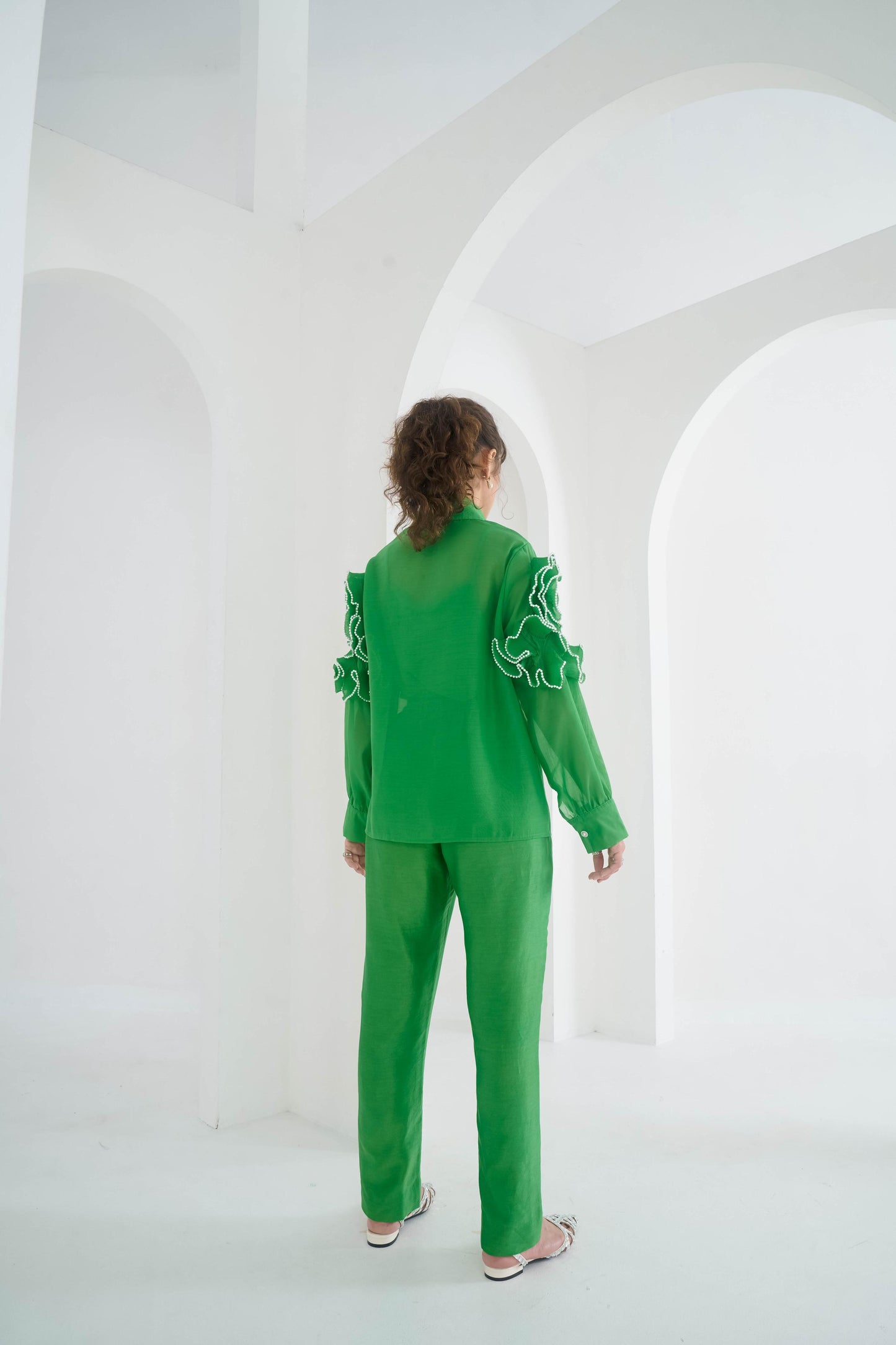 Featuring Green Shirt In Organdy Base With Pleated Detailing And Pearl Embellishment On Sleeves.