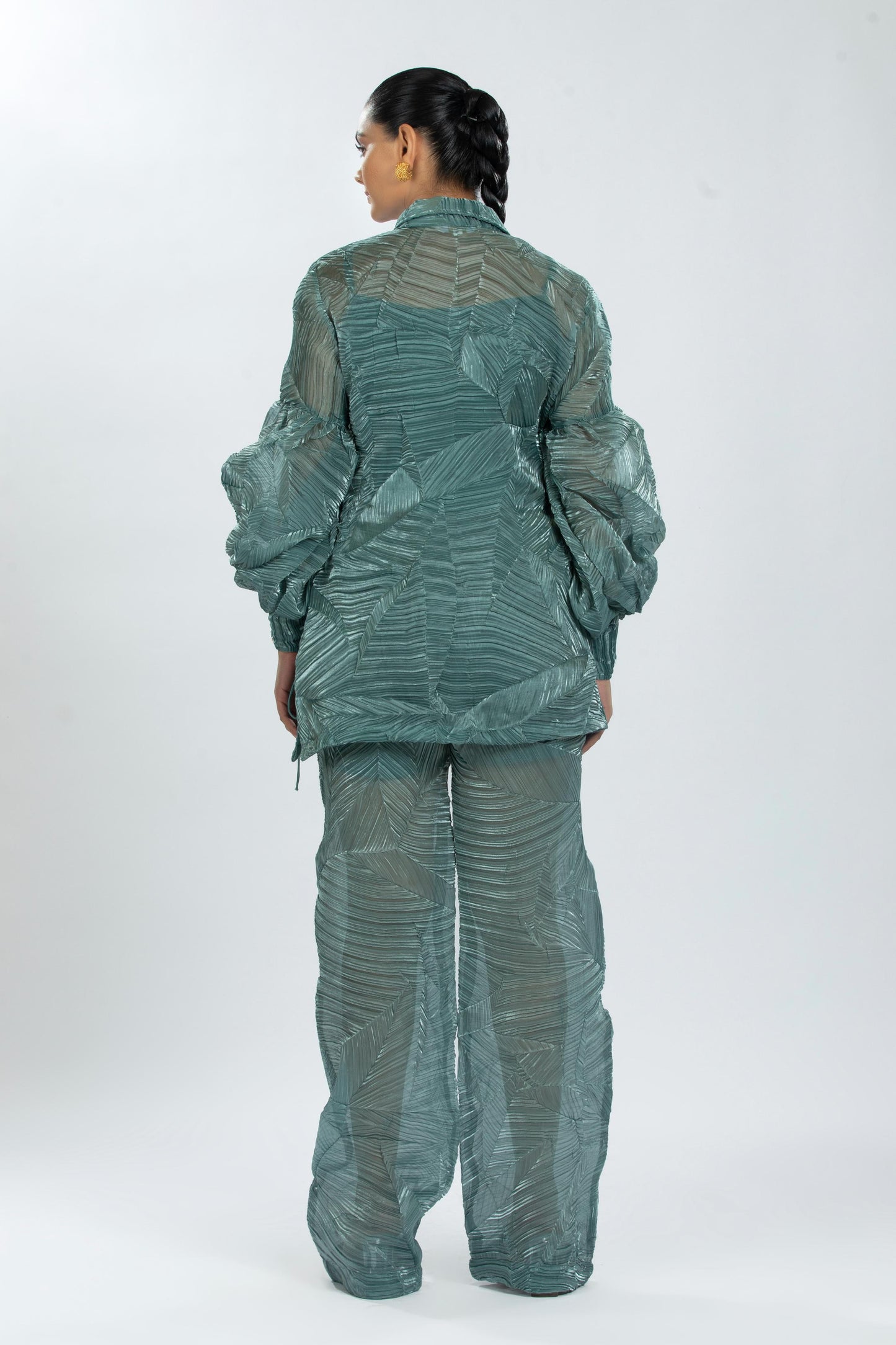 This Green Shirt In Crushed Organza Offers A Textured, Elegant Look With A Soft Green Hue, Classy Golden Buttons, And Side Knotted Details. Ideal For Upscale Events Or Special Occasions.