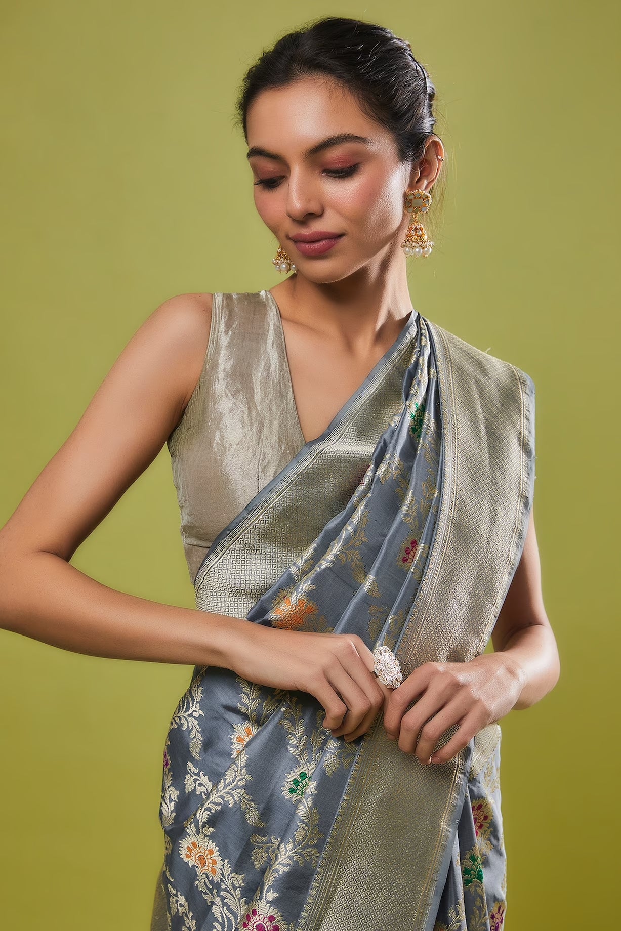 Handwoven Grey Katan Silk Saree & Floral Jaal With Hints Of Meenakari. It Is Paired With An Unstitched Blouse.