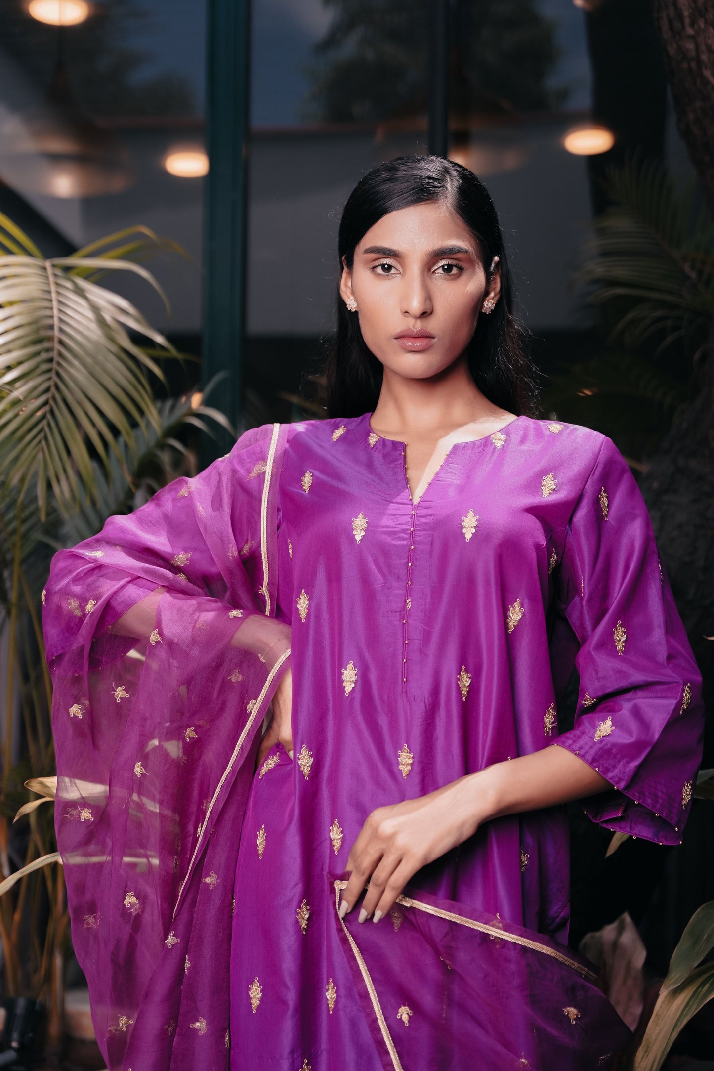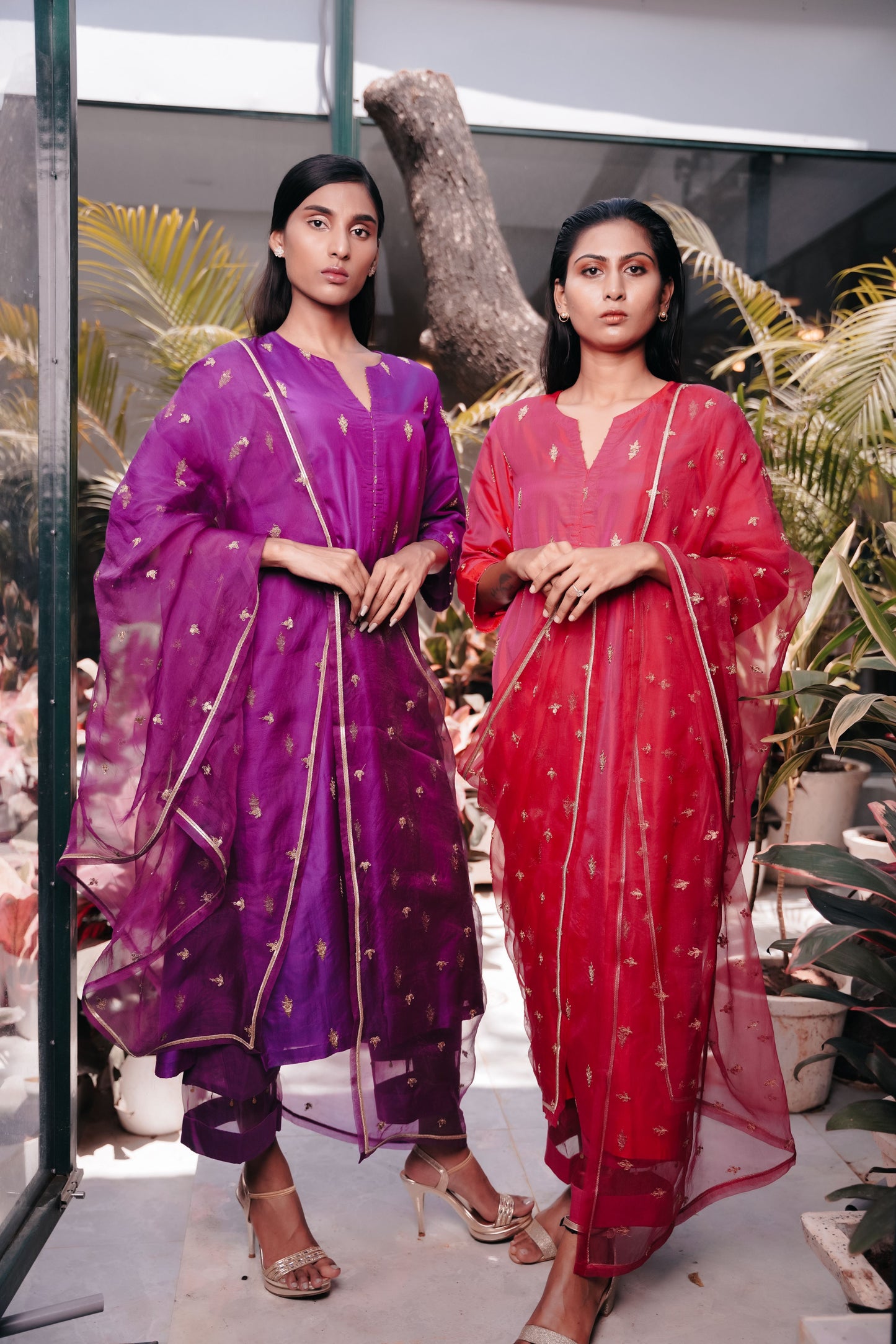 This Exquisite Ensemble Boasts Handwoven Patra Dori Embroidery That Adds An Artisanal Touch, Creating A Classic Straight Silhouette That Resonates With Elegance. The Ensemble Is Complete With Intricately Detailed Edging On The Pants And A Resplendent Embellished Organza Dupatta. From Lively Festive Events To Special Gatherings, This Ensemble Is Your Ticket To Making An Unforgettable Statement. Its Vibrant Colours, Exquisite Embroidery, And Luxurious Silk Come Together To Embody The Spirit Of Celebration.