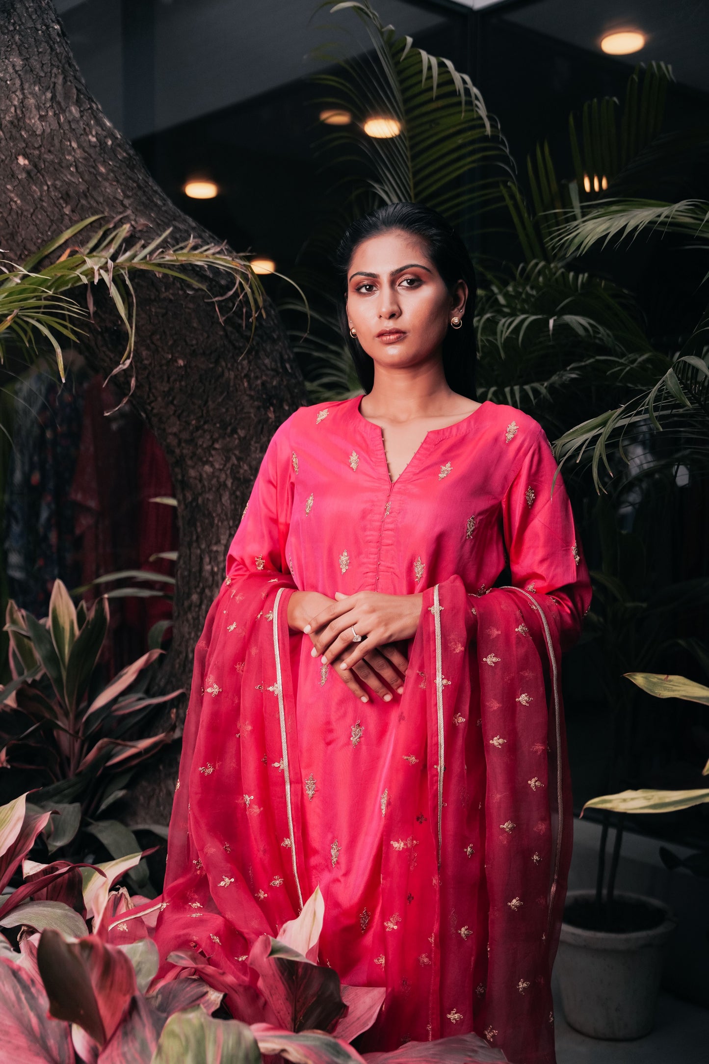 This Exquisite Ensemble Boasts Handwoven Patra Dori Embroidery That Adds An Artisanal Touch, Creating A Classic Straight Silhouette That Resonates With Elegance. The Ensemble Is Complete With Intricately Detailed Edging On The Pants And A Resplendent Embellished Organza Dupatta. From Lively Festive Events To Special Gatherings, This Ensemble Is Your Ticket To Making An Unforgettable Statement. Its Vibrant Colours, Exquisite Embroidery, And Luxurious Silk Come Together To Embody The Spirit Of Celebration.