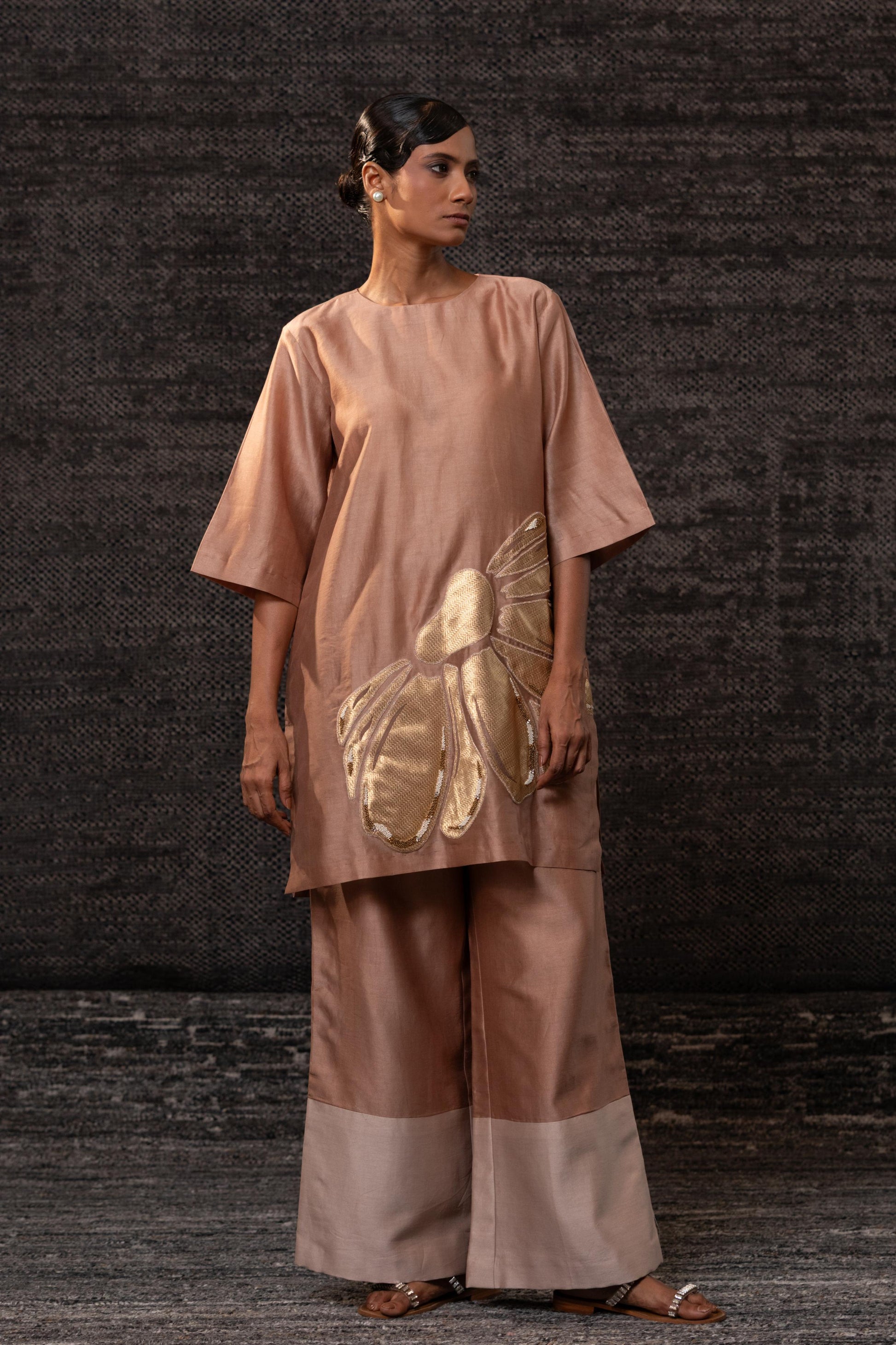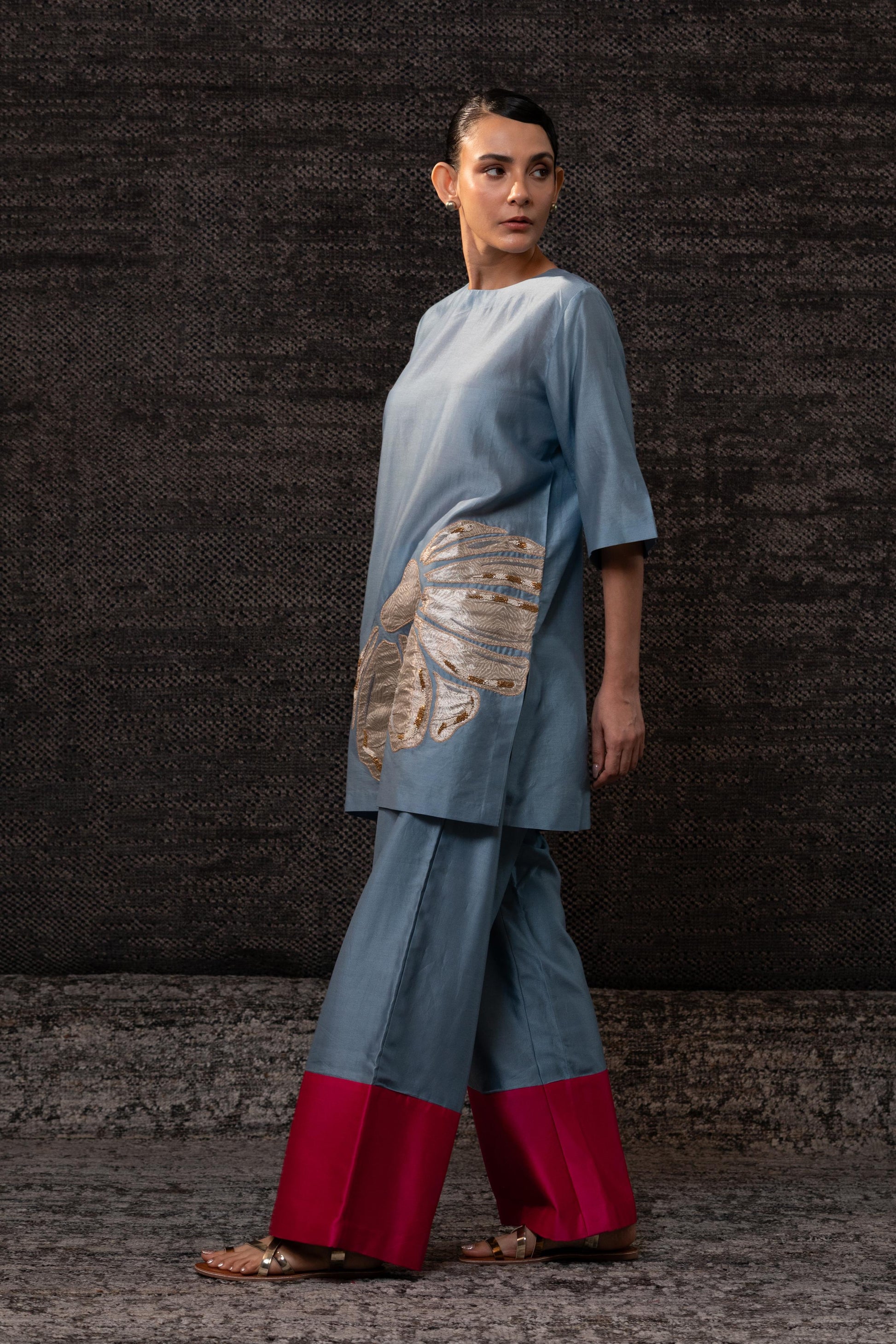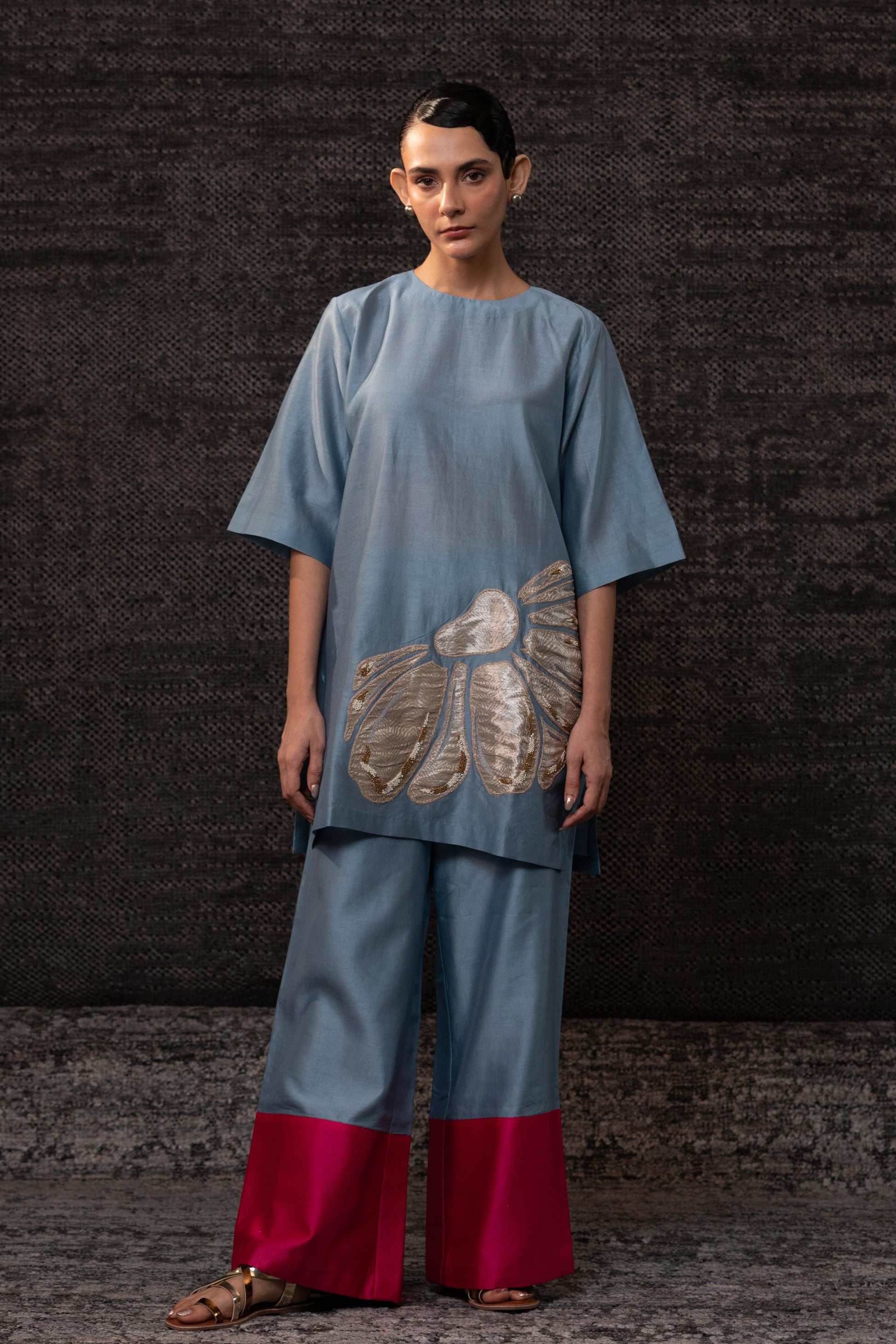 Relaxed Silk-Chanderi Set With A Relaxed Kurta Adorned With An Oversized Statement Patch—Bold And Instantly Elevating. Paired With Wide Palazzos With A Contrast Hem.