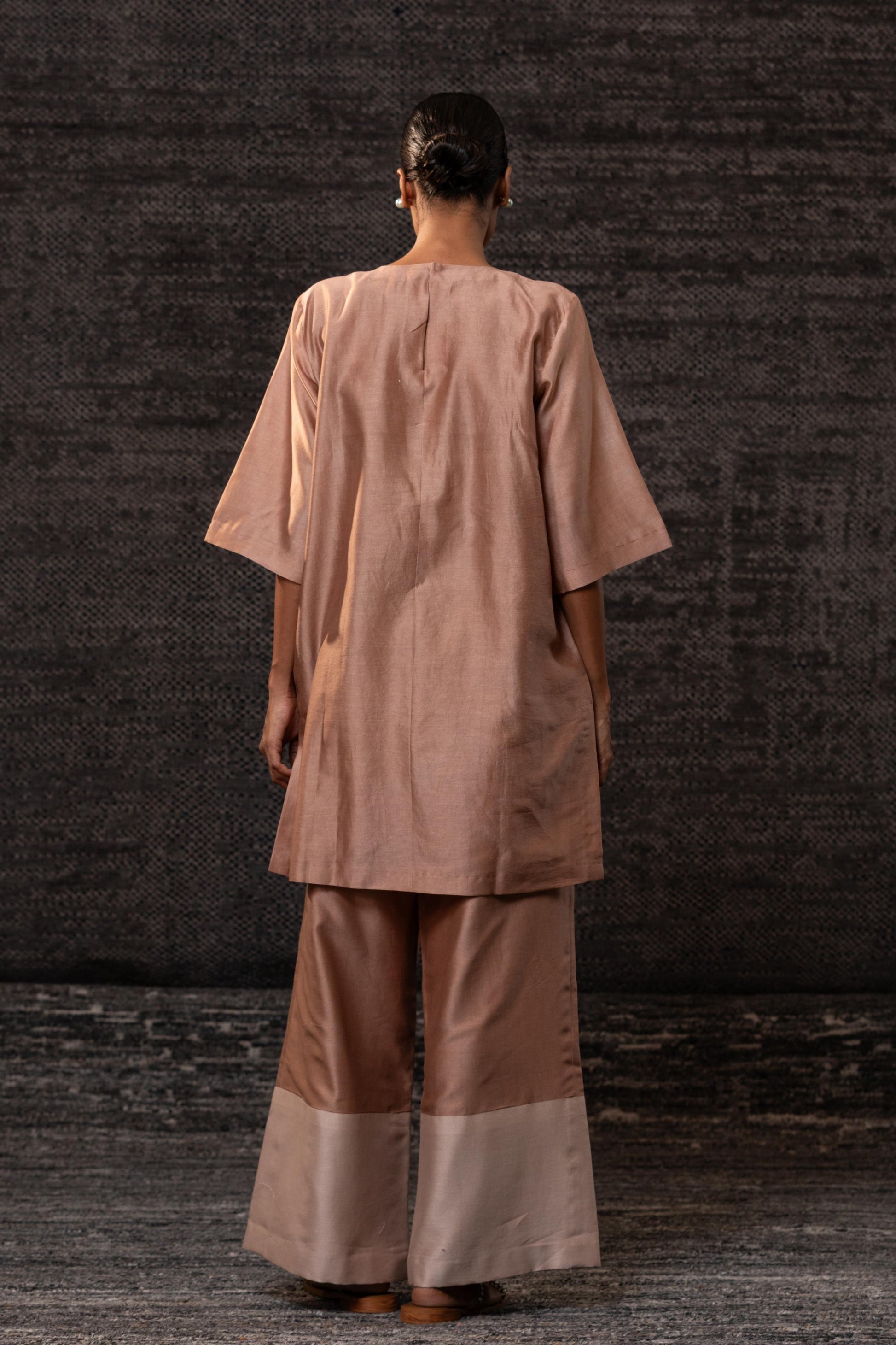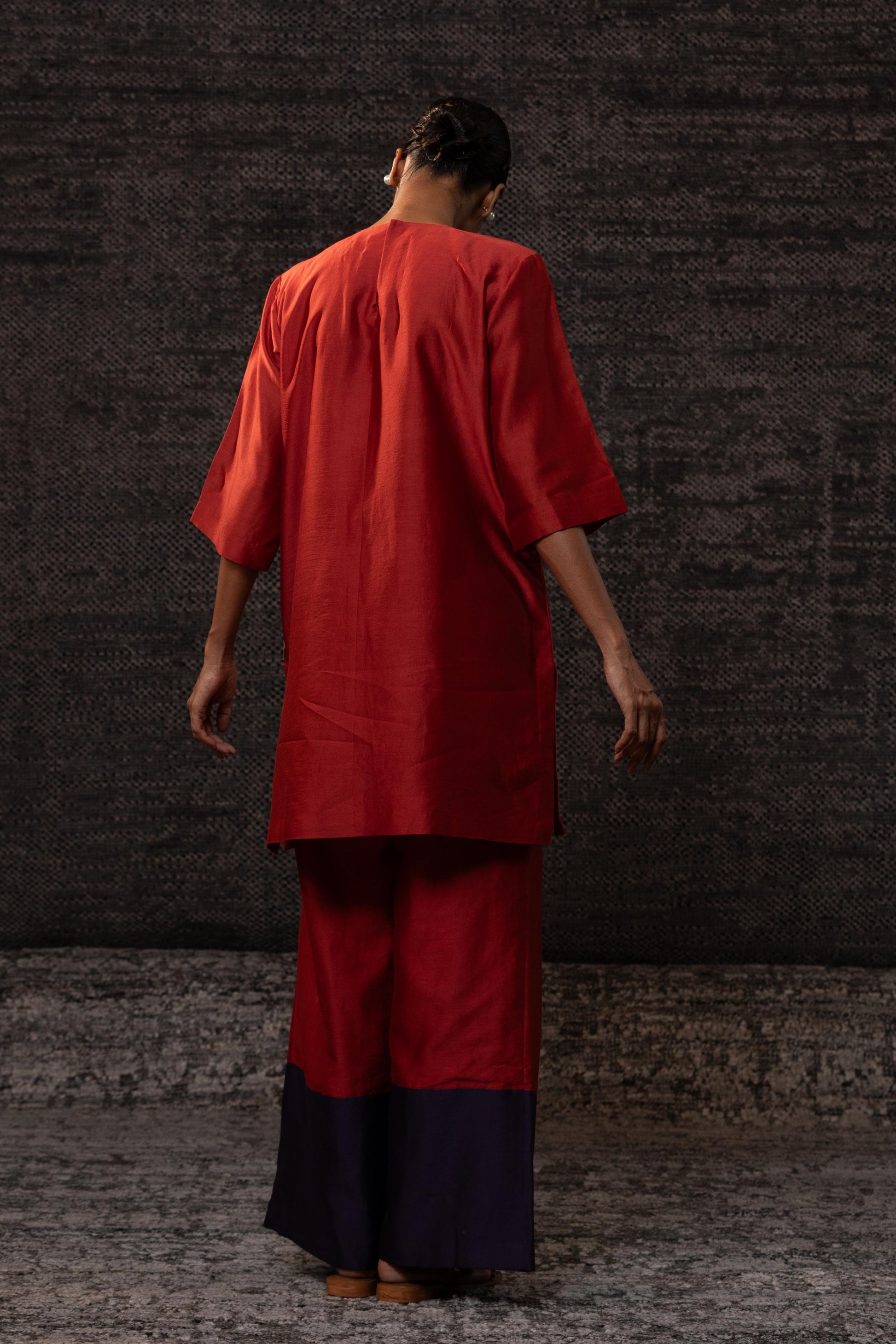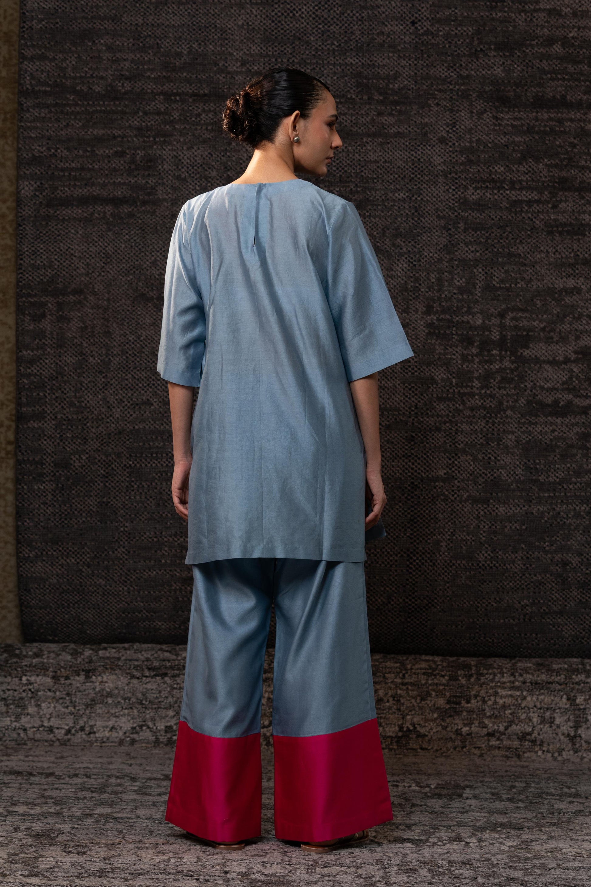 Relaxed Silk-Chanderi Set With A Relaxed Kurta Adorned With An Oversized Statement Patch—Bold And Instantly Elevating. Paired With Wide Palazzos With A Contrast Hem.