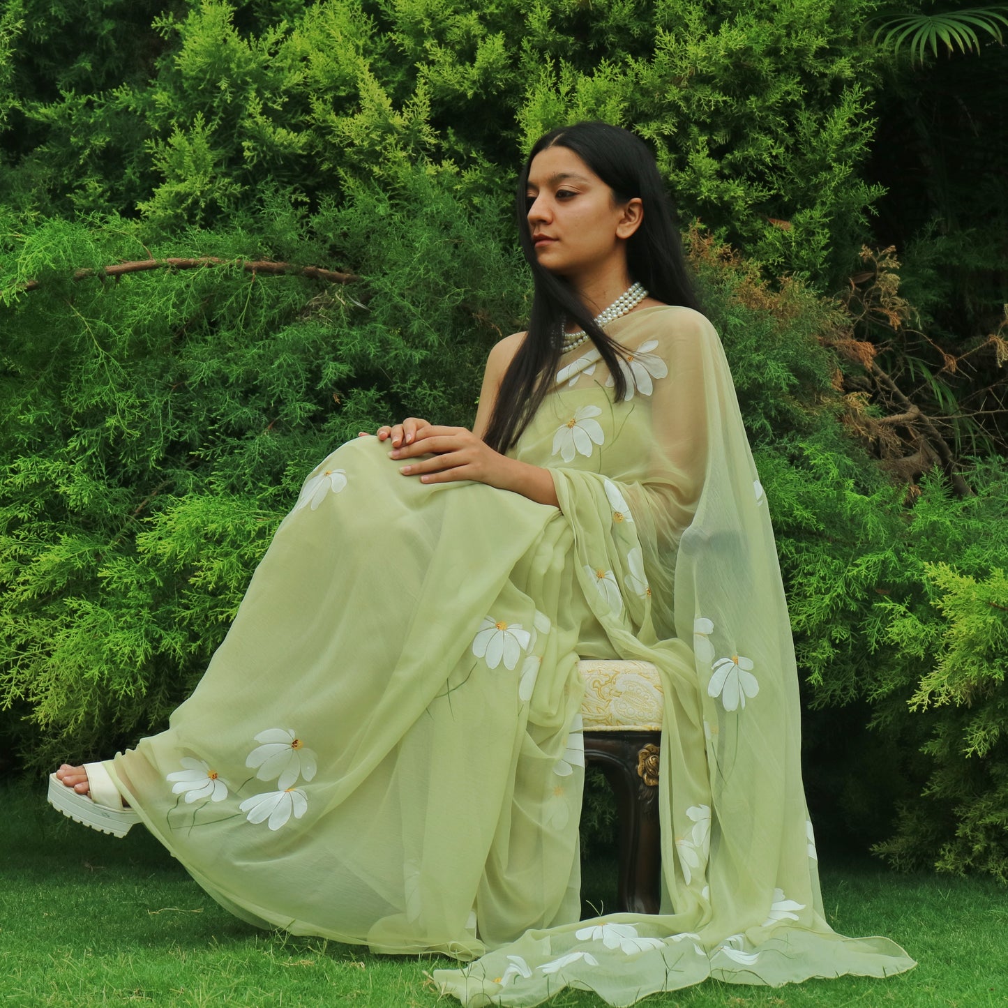 Olive Green Saree Based On Chiffon Features Hand Painted White Half Daisies. It Is Paired With An Unstitched Silk Blouse.