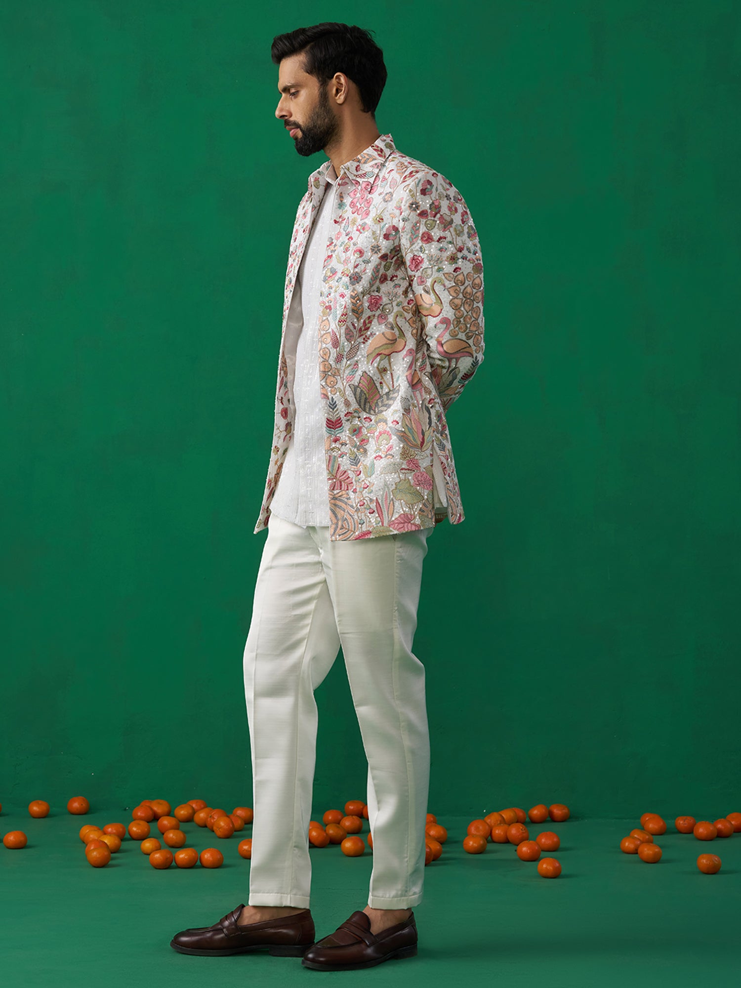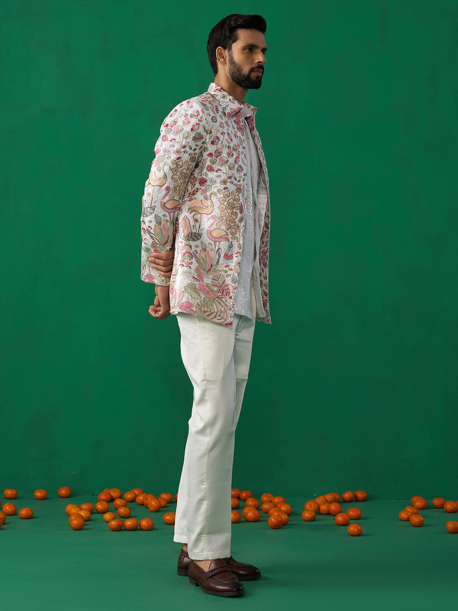 This Jodhpuri Set Features A Structured, Tailored Jacket With Intricate Embroidery And Detailed Floral-Inspired Motifs, Giving It A Refined And Artistic Appeal. It Is Styled Over A Shirt With Subtle Textural Detailing, Paired With Classic Trousers. The Ensemble Blends Traditional Craftsmanship With A Modern Silhouette, Making It Ideal For Festive Or Formal Occasions.