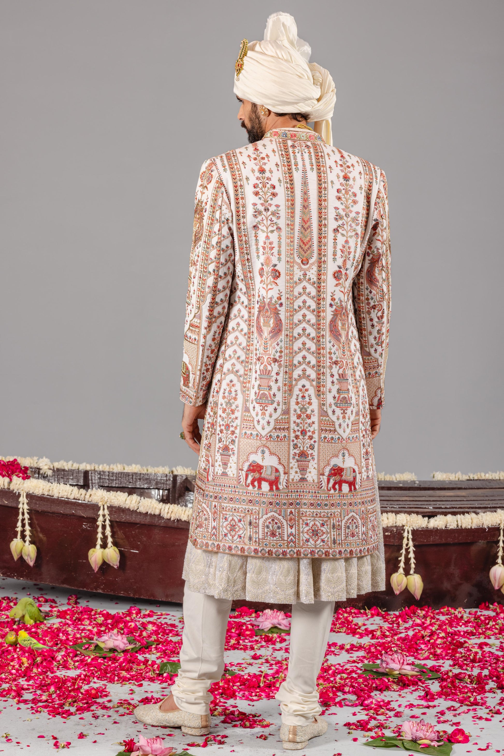 Inspired By Royal Processions And Palace Frescoes, Haathimahal Is An Ivory Sherwani Set Crowned With A Jacket Richly Embroidered With Intricate Elephants, Arches, And Heritage Florals..It Is Paired With Anarkali Inside,Which Is Also Beautifully Embroidered, Comes With Churidar Bottom And Ivory Safa (Turban) For A More Royal Look. Waist Is Cinched Using Embroidered Belt.