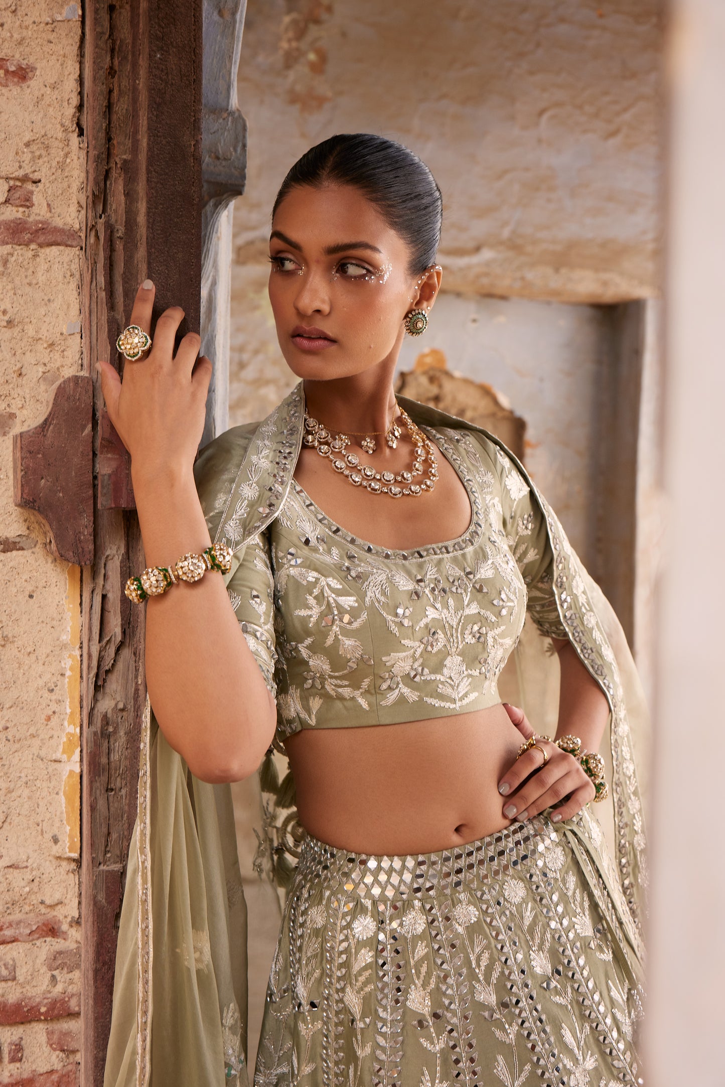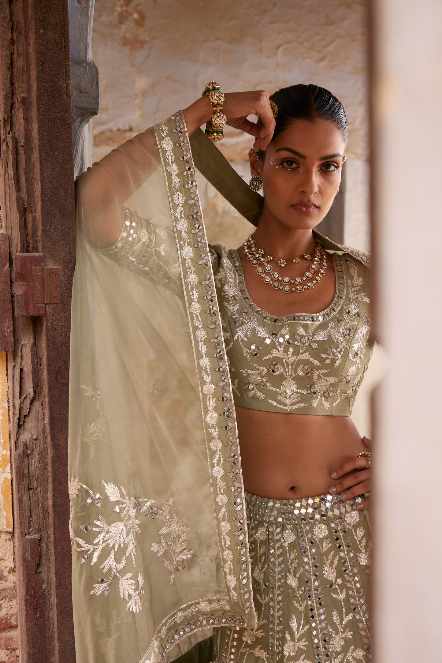 Crafted With Meticulous Attention To Detail, This Pista Green Ensemble By Label Mayaa Features A Blouse And Lehenga Made From Luxurious Dupion Silk, Known For Its Rich Texture And Sheen, While The Accompanying Dupatta Is Made From Delicate Organza. The Lehenga Boasts A Kali Style, Characterized By Its Cascading Panels That Create A Graceful Silhouette, Perfect For Twirling On The Dance Floor. The Highlight Of This Ensemble Lies In Its Intricate Thread And Mirror Embroidery, Which Adorns The Entire Outfit, Adding A Touch Of Opulence And Sophistication.