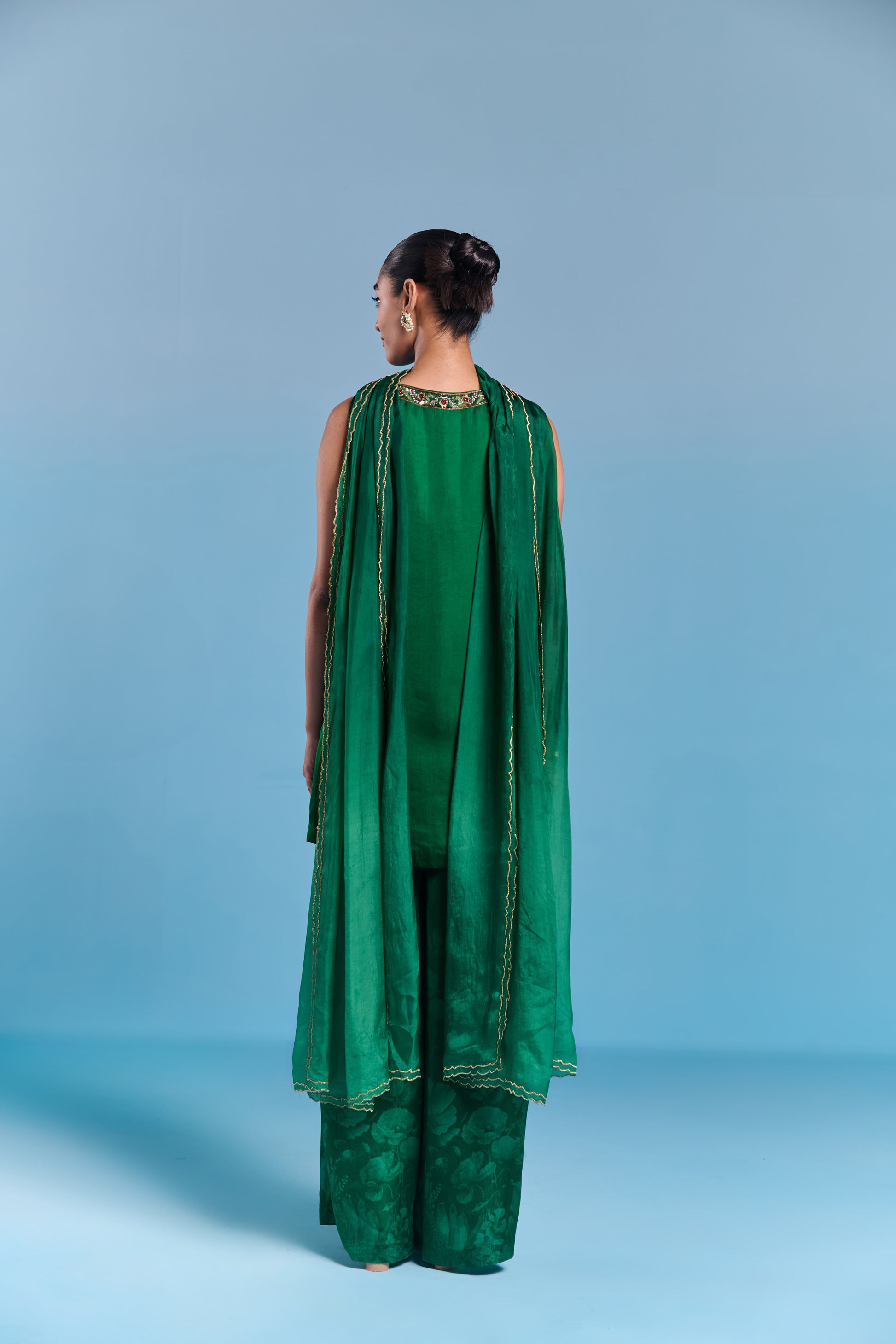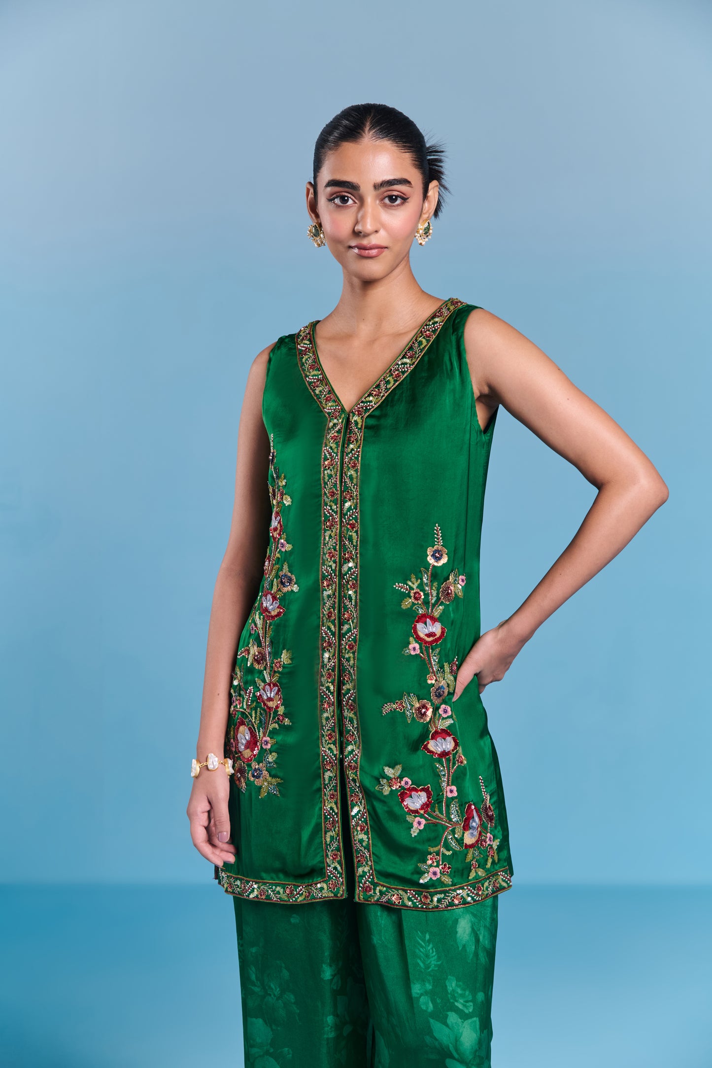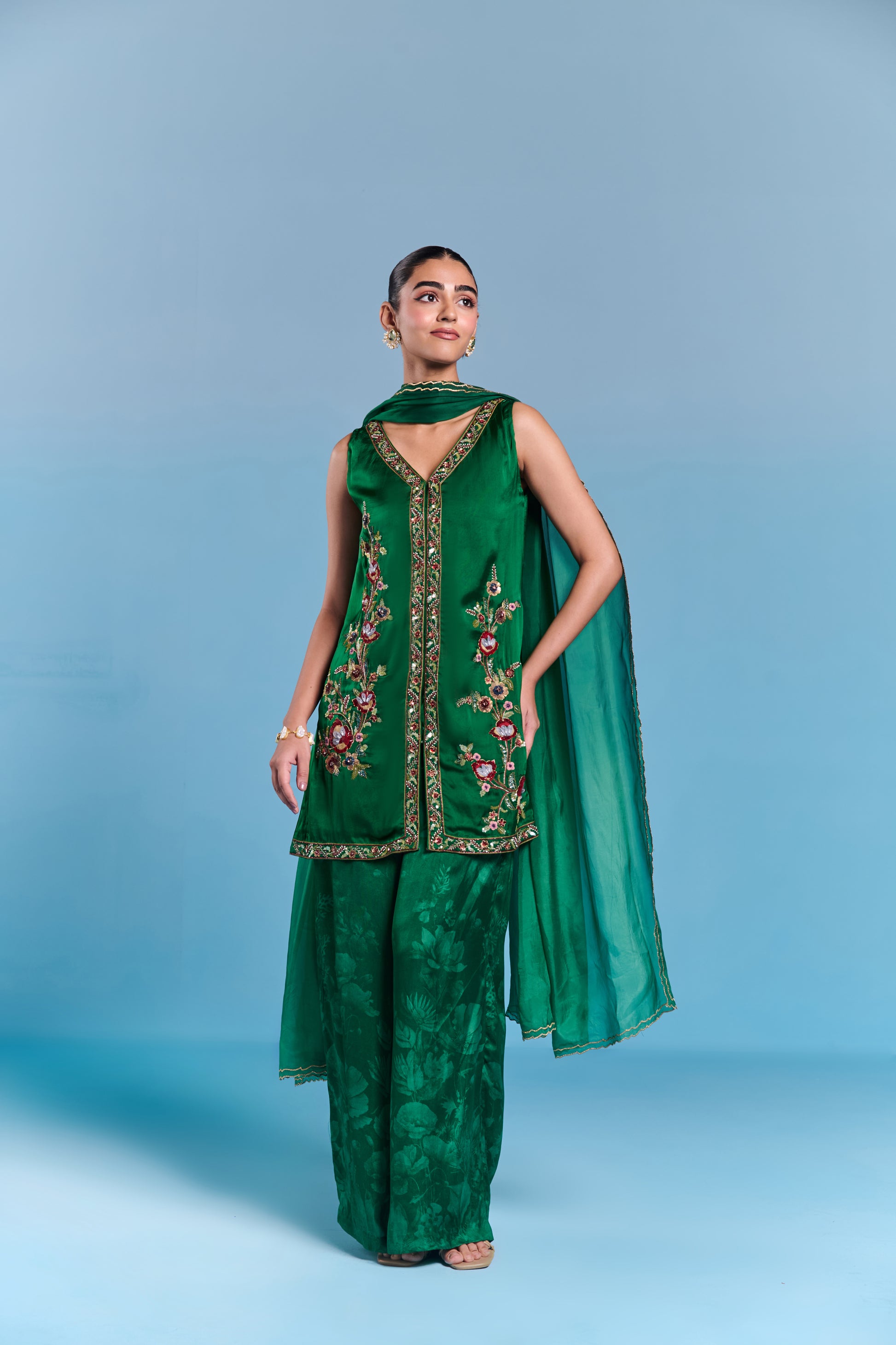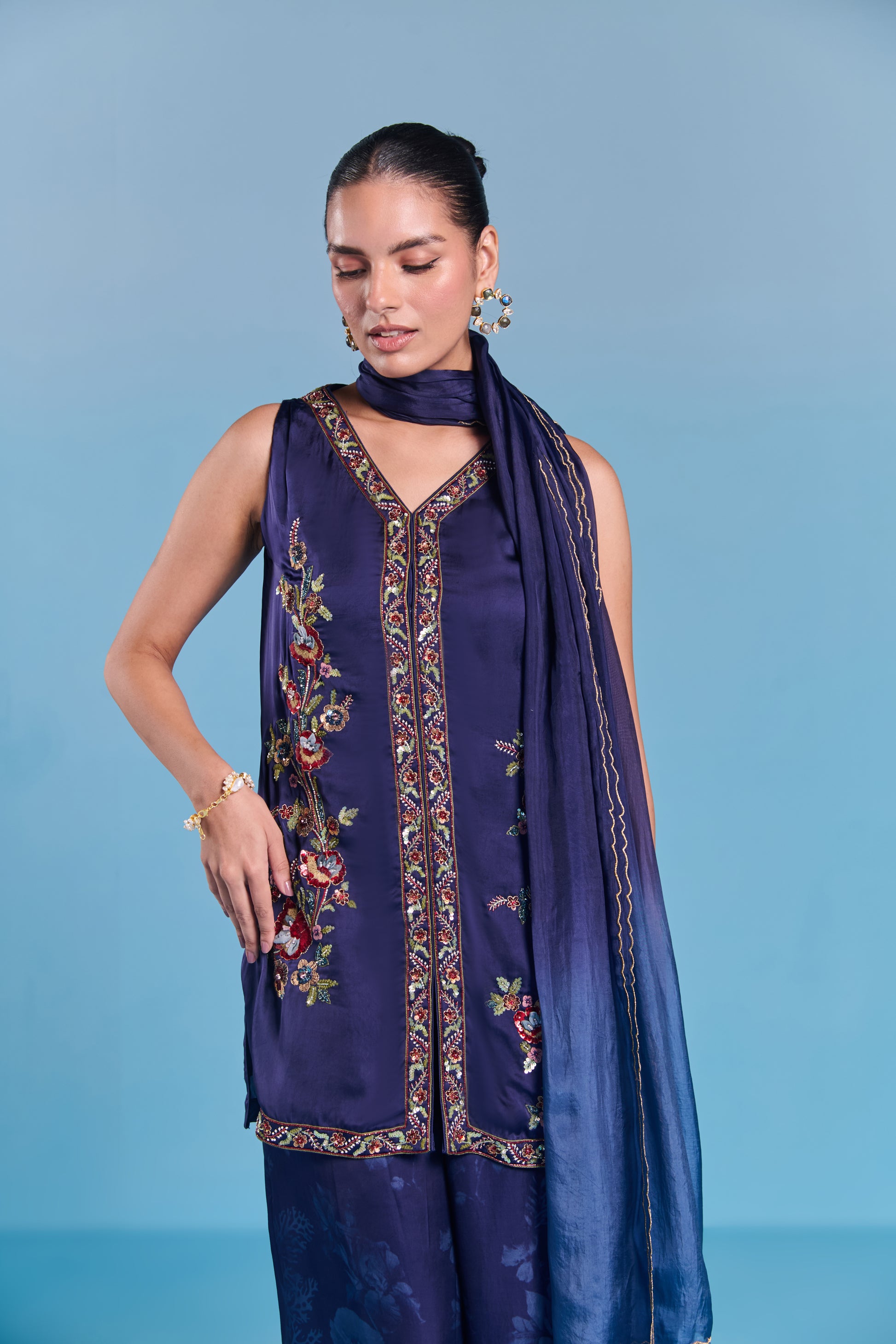 Step Into Sophistication With Our Kurta Set . Adorned With Intricate Embroidery On Kurta In Dazzling Sequin Work And Beautiful Mughal Floral Inspired Motifs. It Is Paired With Coordinated Printed Pants. Perfect For Festivities And Evening Parties.