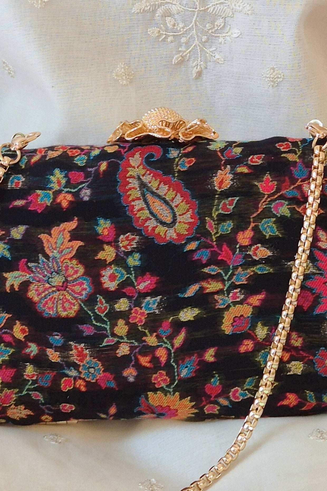 A Luxurious Pashmina Cashmere Clutch, Featuring A Deep Dark Black Base Adorned With Intricate Multicolor Paisley Work That Reflects Rich Cultural Artistry. Accented With A Beautiful Flower Lock, This Piece Combines Heritage With Elegance, Making It A Statement Accessory For Any Special Occasion.