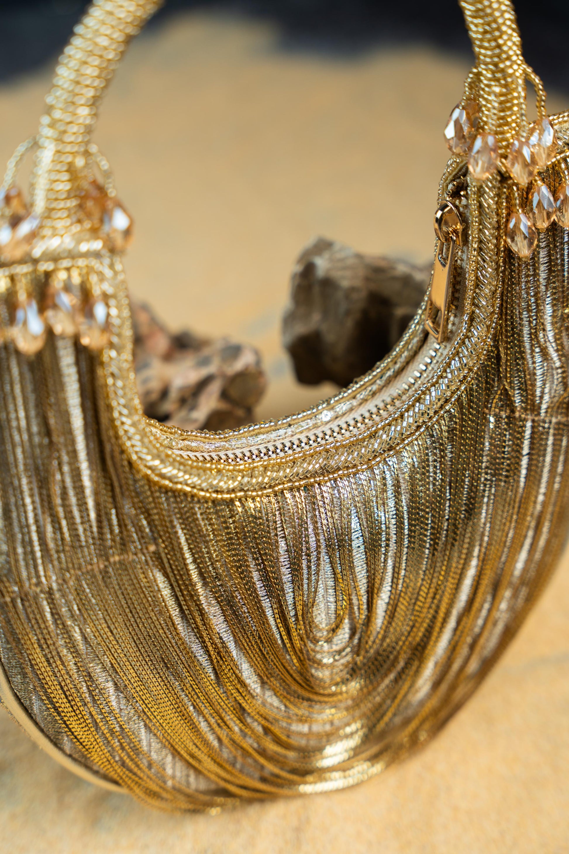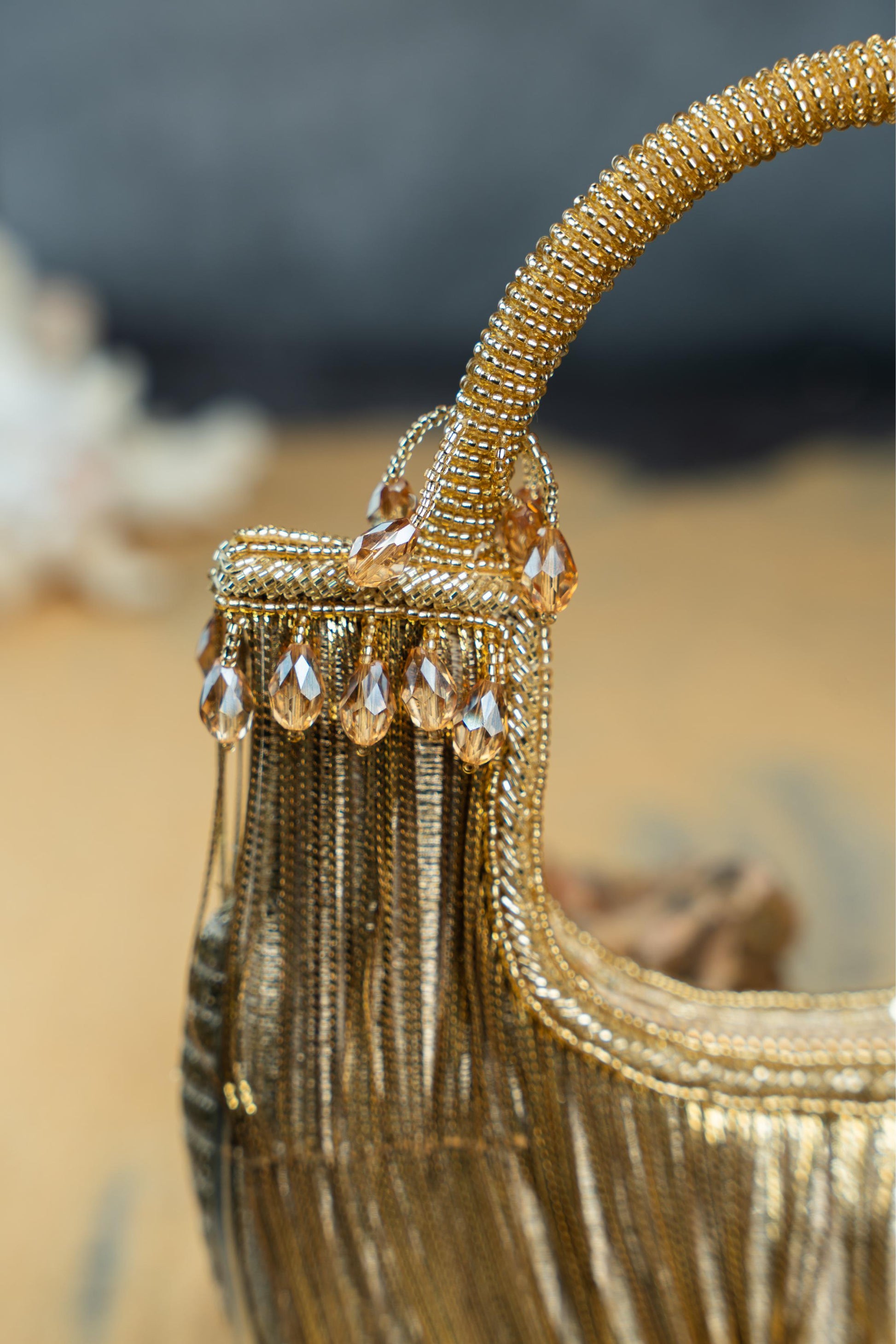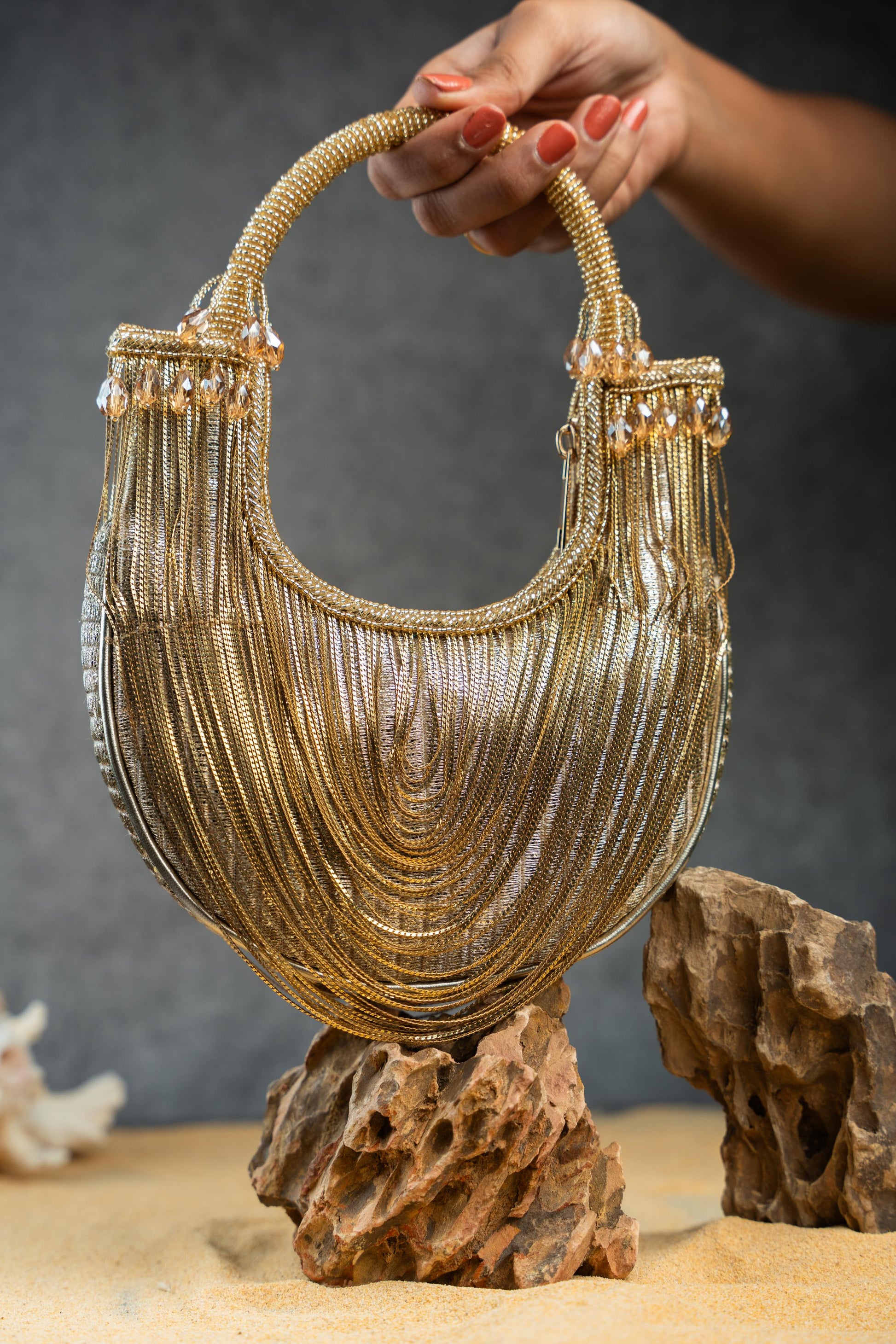 It Doesn't Get More Modish Than This Gold Tasseled Boat Shaped Bag Accompanied With Metallic Chains Throughout Making It An "Oh La La" Addition To Any Contemporary Fit. It Works Like A Mini Bag And Comes With A Dazzling Beaded Handle Finish Making It A Convenient And Fashionable Addition. Whether You're Dressing For A Wedding, Festive Celebration, Or A Formal Evening, This Potli Adds Just The Right Amount Of Glamour—Proof That Sometimes, Less Truly Is More.