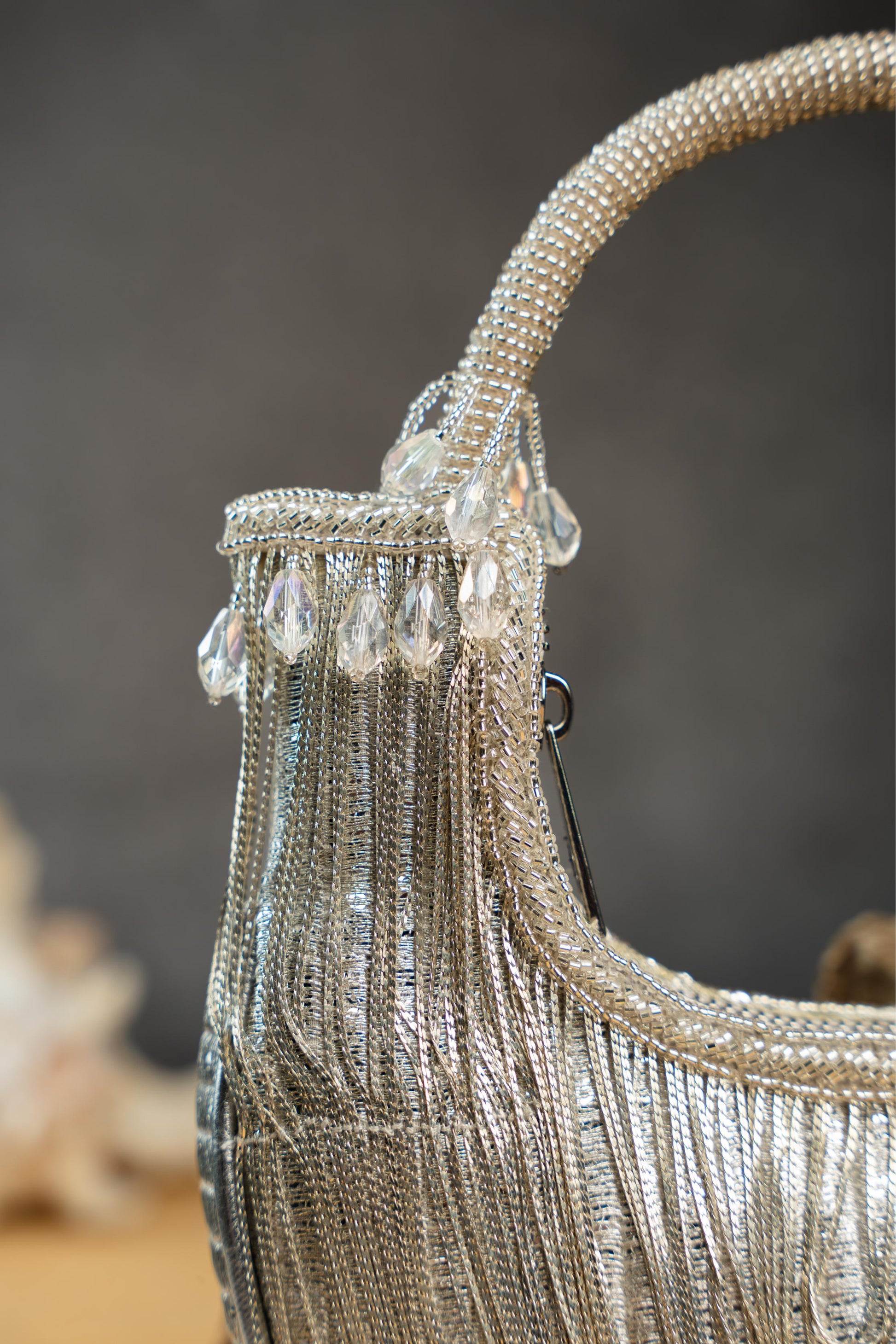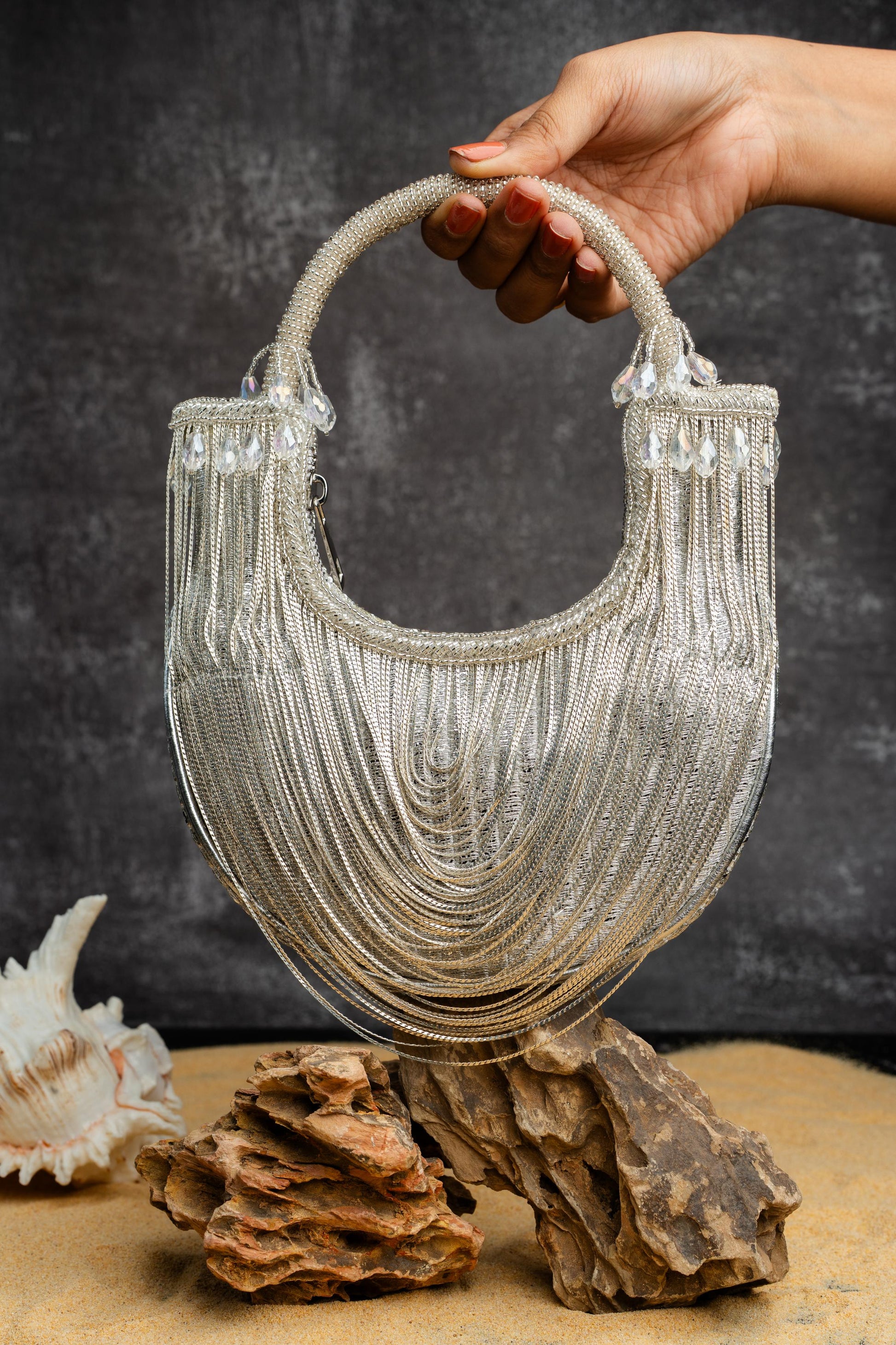 It Doesn't Get More Modish Than This Silver Tasseled Boat Shaped Bag Accompanied With Metallic Chains Throughout Making It An ""Oh La La"" Addition To Any Contemporary Fit. It Works Like A Mini Bag And Comes With A Dazzling Beaded Handle Finish Making It A Convenient And Fashionable Addition. Whether You're Dressing For A Wedding, Festive Celebration, Or A Formal Evening, This Potli Adds Just The Right Amount Of Glamour—Proof That Sometimes, Less Truly Is More.