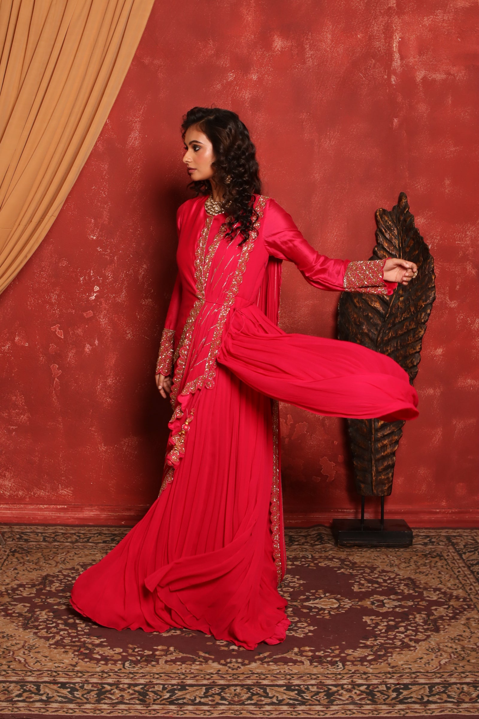Radiating Grace & Style! This Indo-Western Drape Anarkali Features A Jacket-Style Silhouette On One Side And A Flowing Drape On The Other. The Katdana And Thread Embroidery Add A Touch Of Timeless Charm.