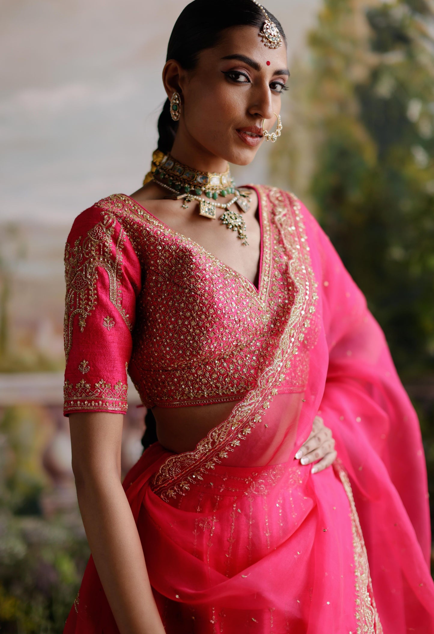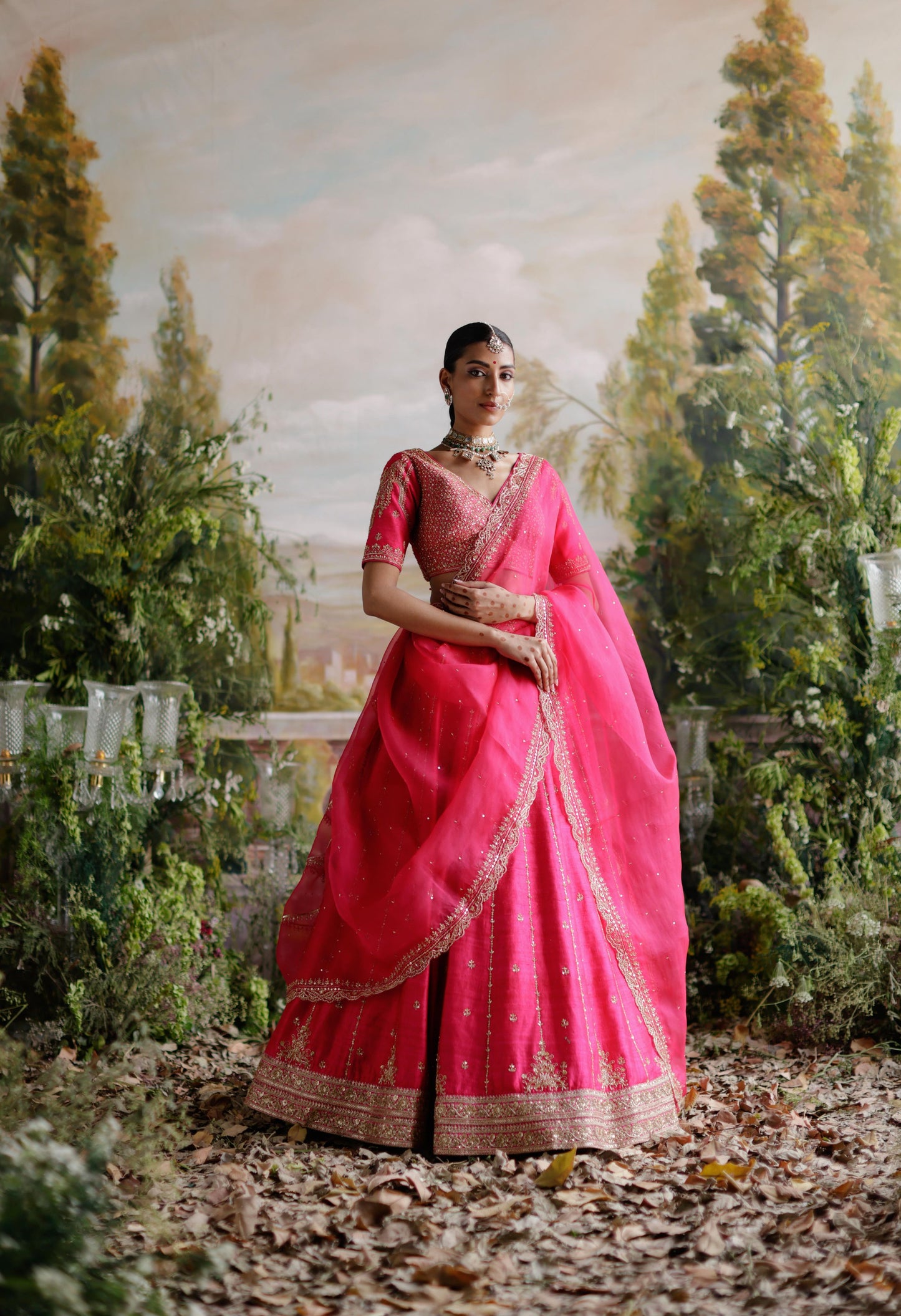 This Ensemble Captures The Essence Of Vivacity And Traditional Grace, Perfect For Making A Striking Statement On Special Occasions. Embellished With Delicate Hand Embroidery And Antique Gold Dori, The Raw Silk Lehenga And Organza Dupatta Exude The Richness Of Indian Craftsmanship. The Vibrant Hot Pink Hue Radiates Energy And Charm, Making It A Perfect Choice For A Variety Of Celebrations. Whether You'Re Attending A Wedding, A Cultural Event, Or A Special Celebration, The Hot Pink Lehenga Set Will Ensure You Glow With A Burst Of Vibrant Elegance And Timeless Grace.