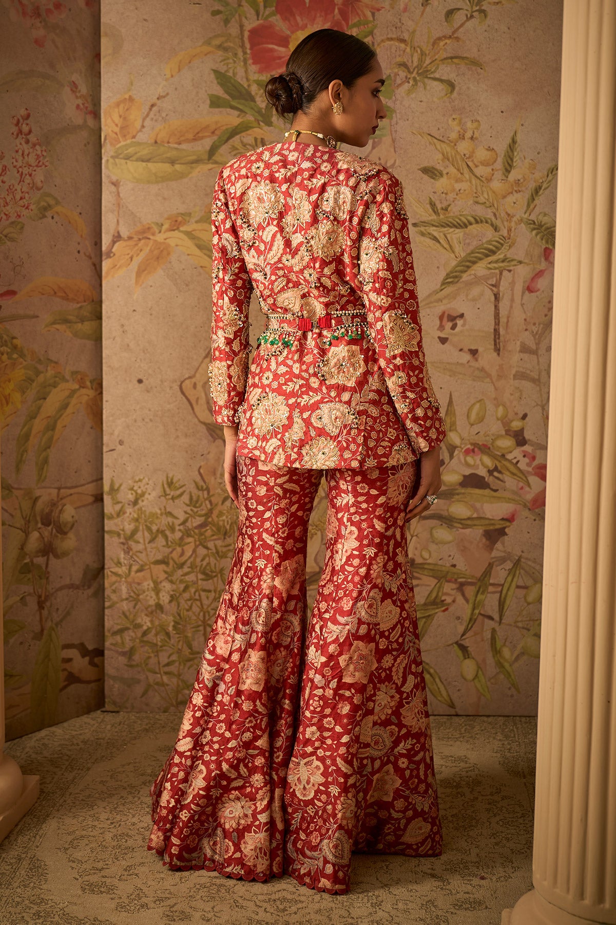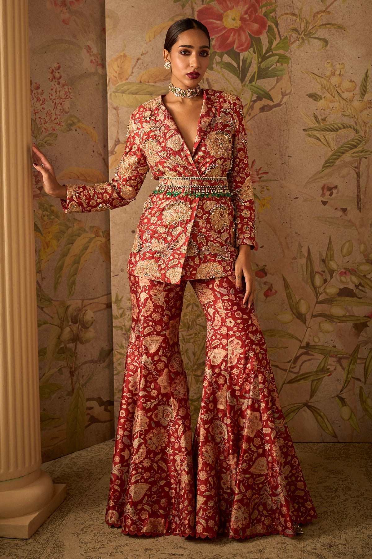 Elevate Your Style With The Red Ochre Printed Raw Silk Embroidered Jacket Paired With Printed Flared Pants And An Embroidered Belt. This Ensemble Effortlessly Combines Traditional Craftsmanship With Contemporary Design. The Embroidered Jacket In Printed Raw Silk Adds A Touch Of Sophistication, While The Flared Pants And Embroidered Belt Complete The Look With Modern Flair. Perfect For Special Occasions, This Ensemble Is A Harmonious Blend Of Timeless Elegance And Contemporary Fashion.