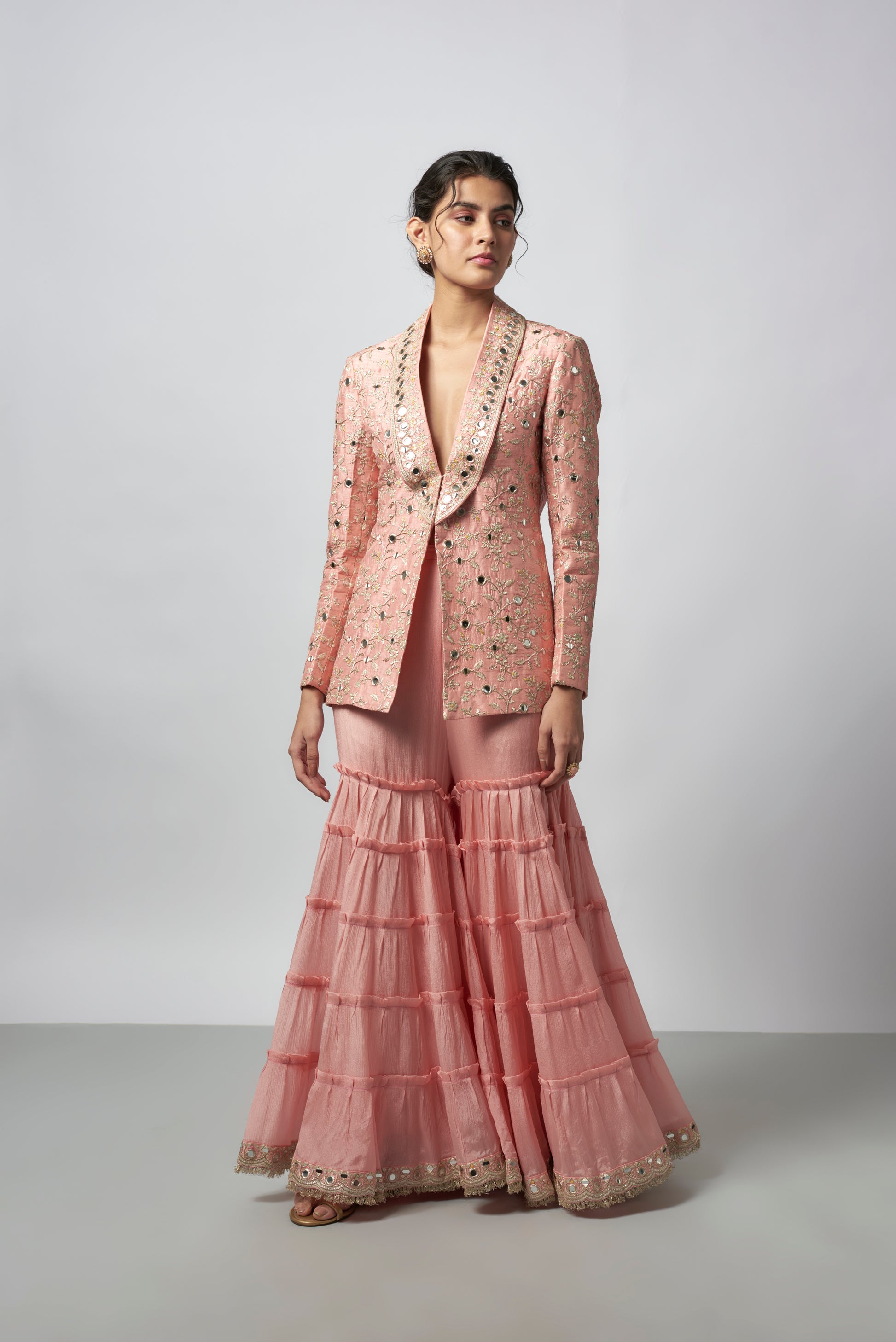 The Outfit Features A Tailored Blazer With Floral Jaal And Mirror Work. The Deep Neckline And Structured Silhouette Exude Sophistication. Paired With Tiered Sharara Pants, The Outfit Creates A Breezy Aesthetic, Enhanced By Delicate Ruffle Details And A Scalloped Mirror-Work Hemline.
