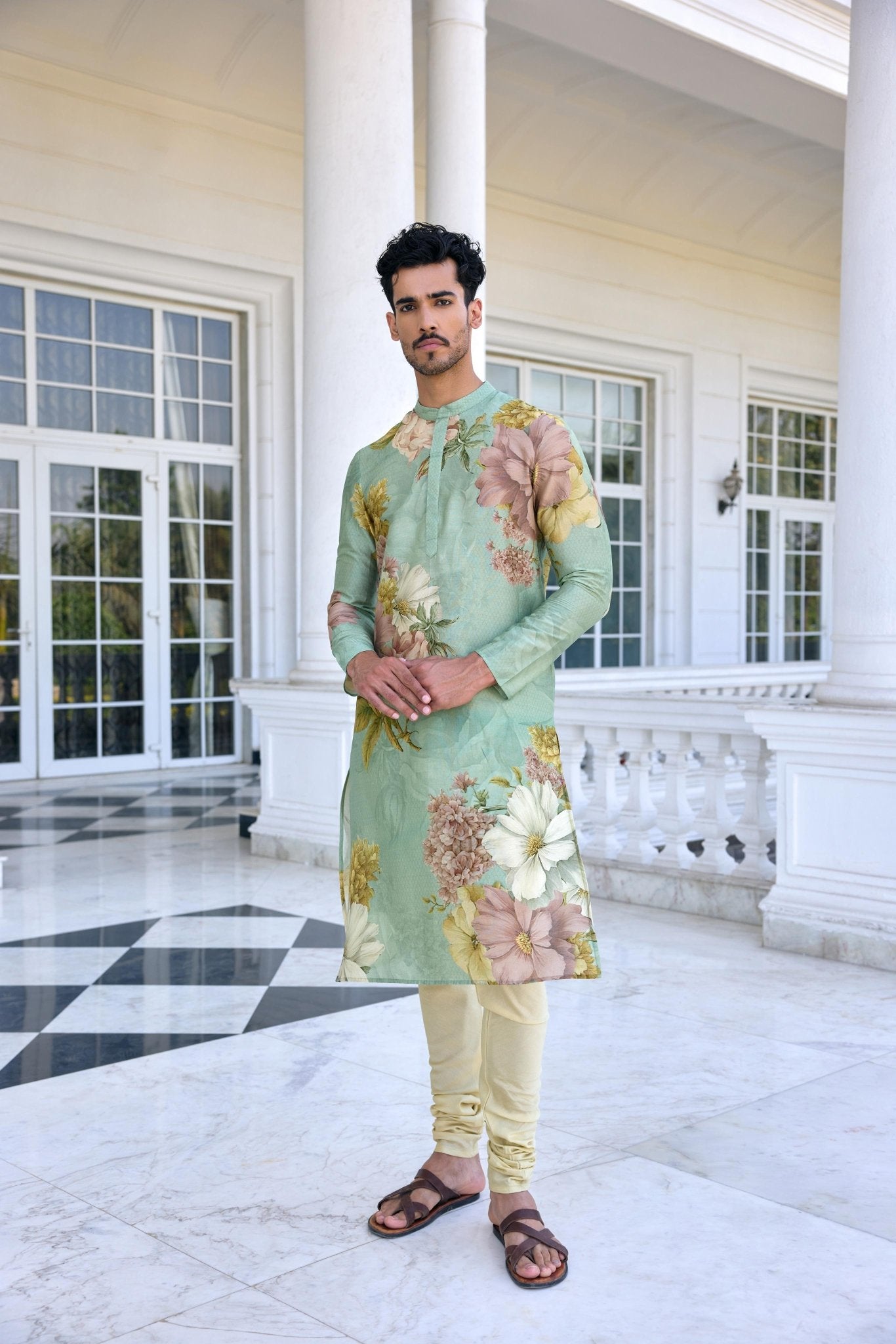 Look Daper In Ilyaz Kurta Set Designed In Vintage Floral Motifs Styled With A Coordinated Churidar In A Contrasting Solid Shade .A Perfect Outfit For Wedding And Festive Occasion.