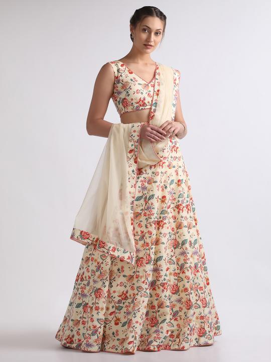 Beige Linen Print Lehenga Set With Silk Organza Dupatta. Whether You'Re The Bride, A Bridesmaid, Or A Guest, This Ensemble Effortlessly Adds A Contemporary Touch To Your Traditional Look. The Ensemble Is Embellished With A Delicate Print That Adds A Modern Twist To Traditional Design.