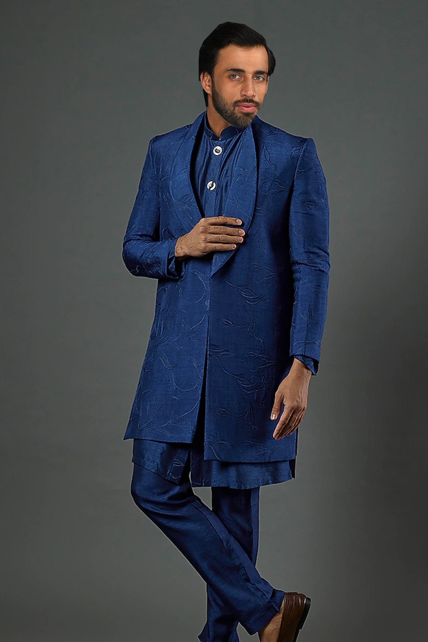 A Dark Blue Front Open Textured Jacket Based On Viscose Silk And Spun Cotton Is Paired With A Plain Matching Kurta And Slim Pants.