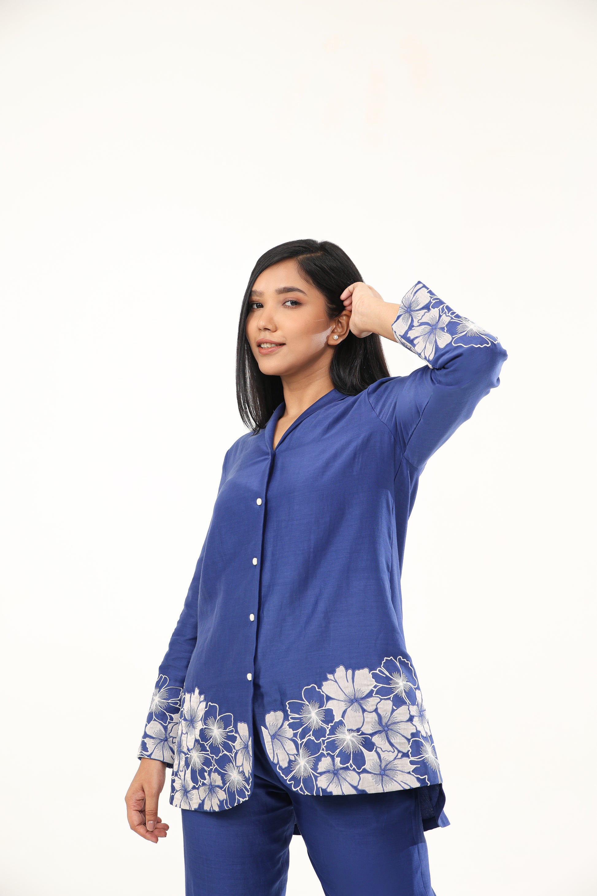 This Chic Co-Ord Set Features Elegant Threadwork And Appliqué Work Detailing On Both Front Panels And Sleeves, Adding A Sophisticated Touch To Its Modern Design. Paired With Tailored Pants, It Offers A Smart And Polished Look, Perfect For Any Occasion.