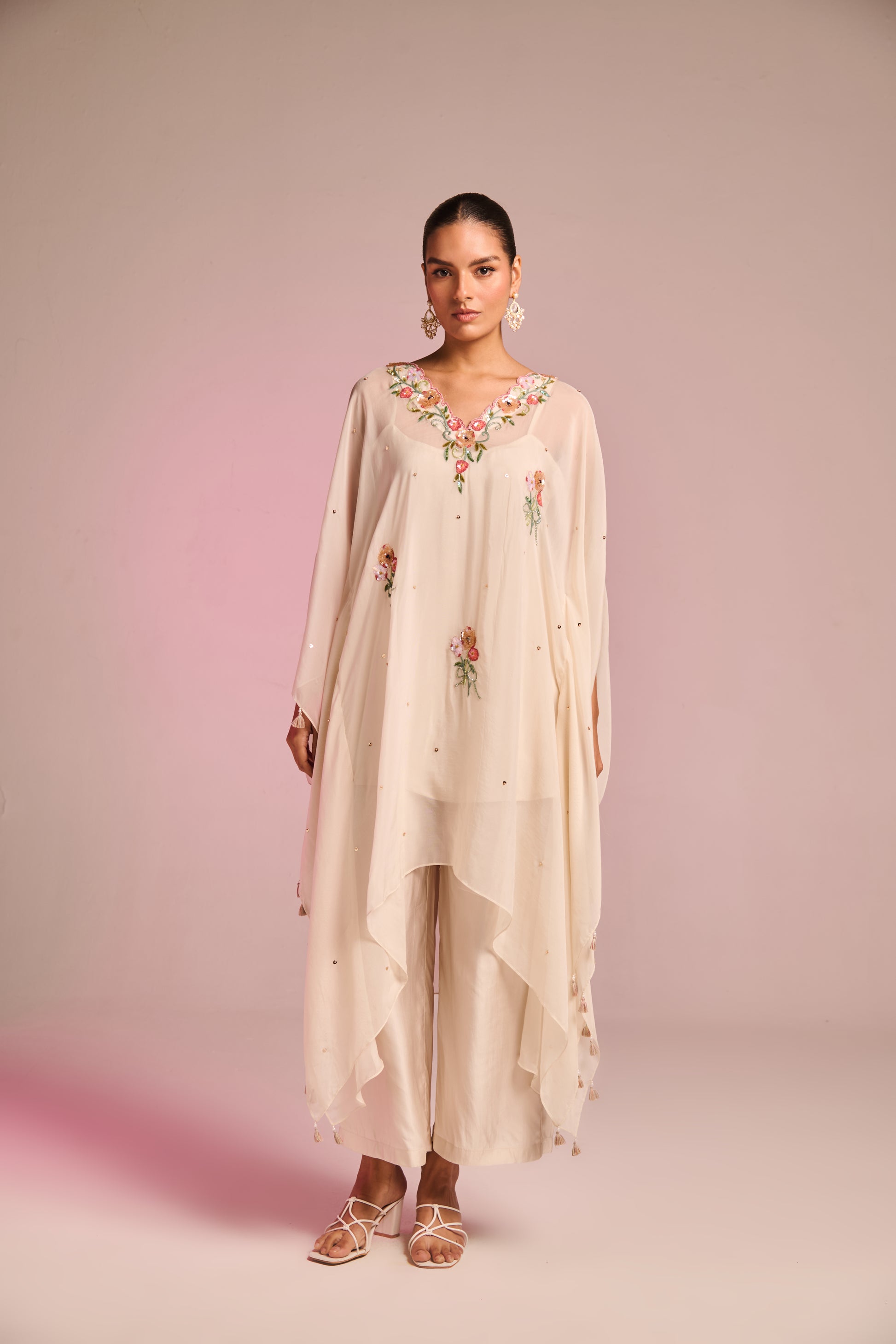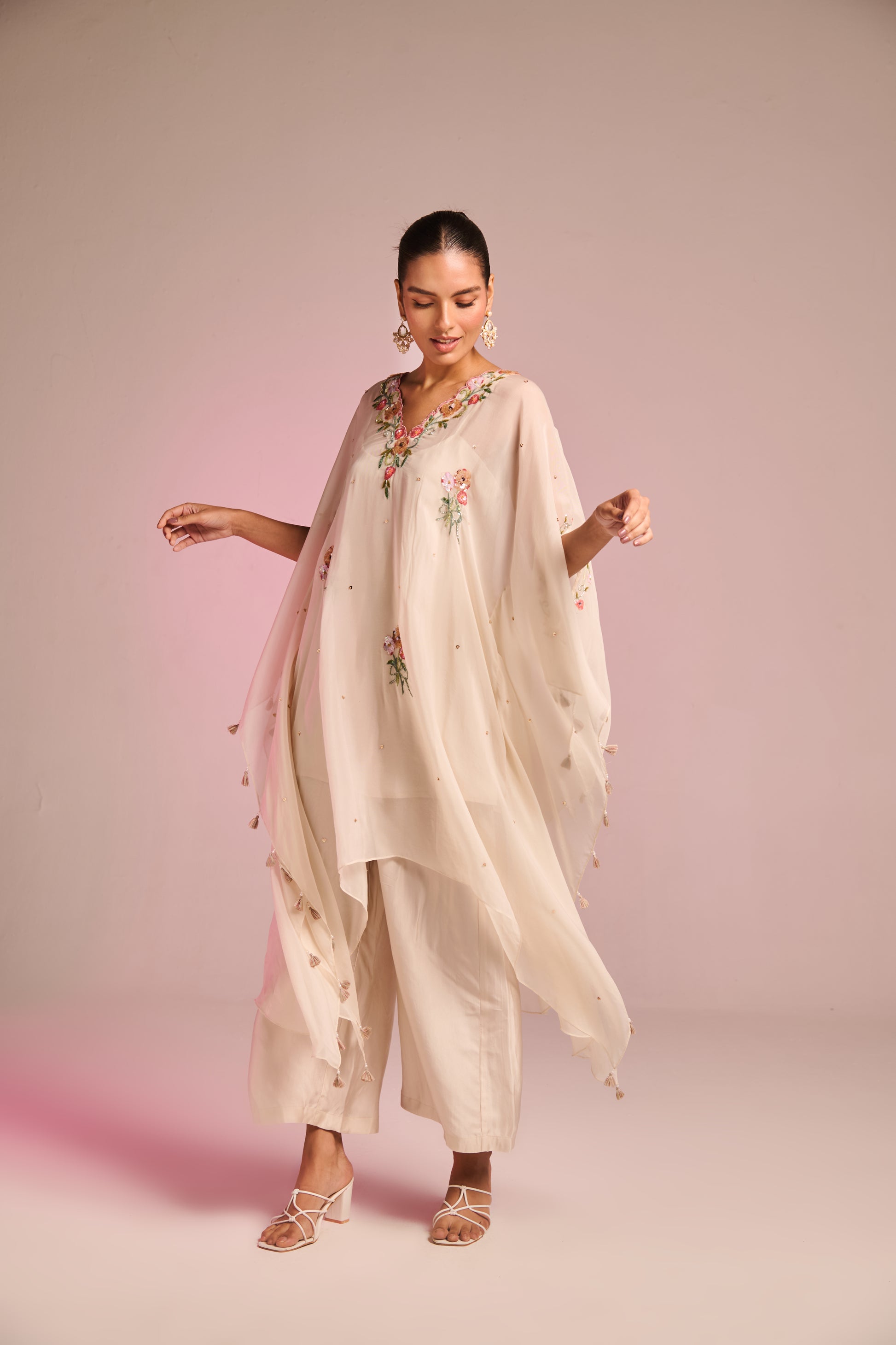 Carry The Essence Of Comfort This Summer In Beautifully Crafted Breathable Organza Fabric, This Statement Piece Is Adorned With The Captivating Floral Hand-Embroidery In A Stunning Blend Of Thread And Sequin Work With Small Motifs And Tassels Detailing. The Flowy Silhouette, Paired With A Pants Brings A Modern Twist To Classic Tailoring. Whether Styled For A Formal Affair Or A Leisurely Day Out, This Offers Versatility With A Refreshing, Nature-Infused Charm.