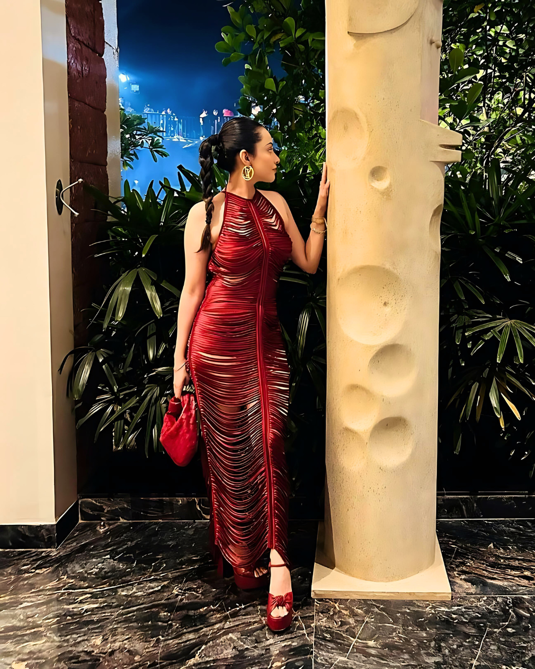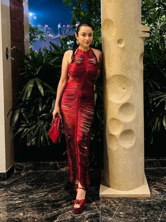 This Statement Piece Is Meticulously Crafted With Satin Strips, Woven Into A Slim Column Silhouette For A Striking, Sophisticated Look. Ideal For Upscale Resort Events And Poolside Soirã©Es, The Design Offers Both Elegance And Modern Edge.