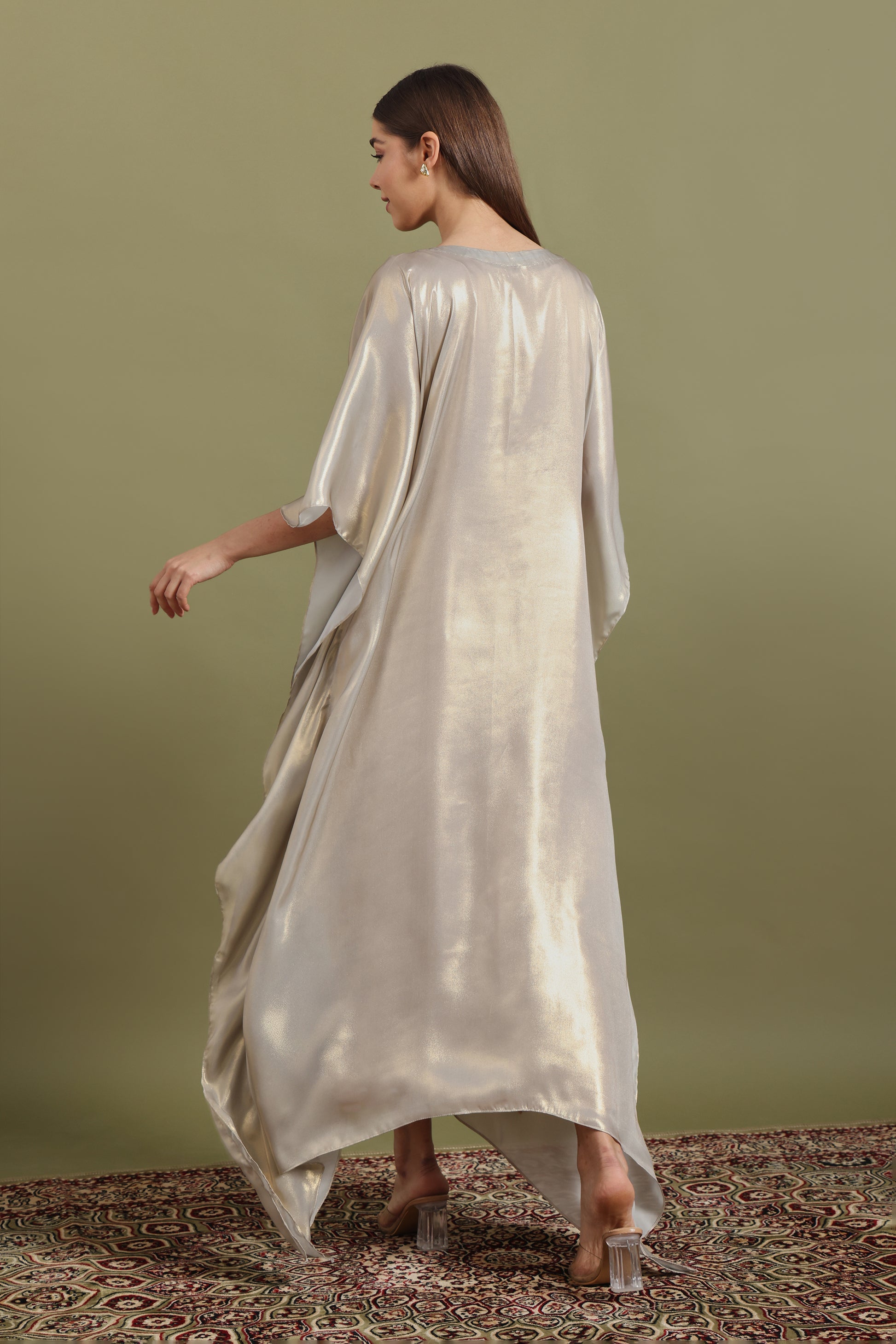 Elegant Ivory-Gold Kaftan With Bold Temple Jewelry-Inspired Neckline Detailing. Statement Yet Minimal — Ideal For Bridal Haldi, Rakhi, Or Pooja Mornings. Flowy, Festive, And Free-Size Comfort.