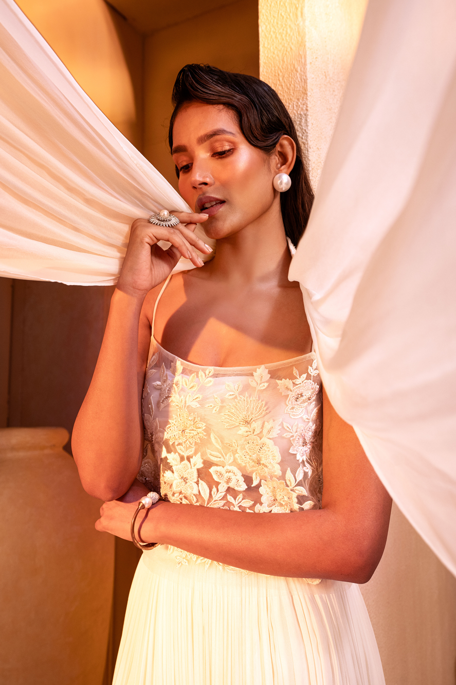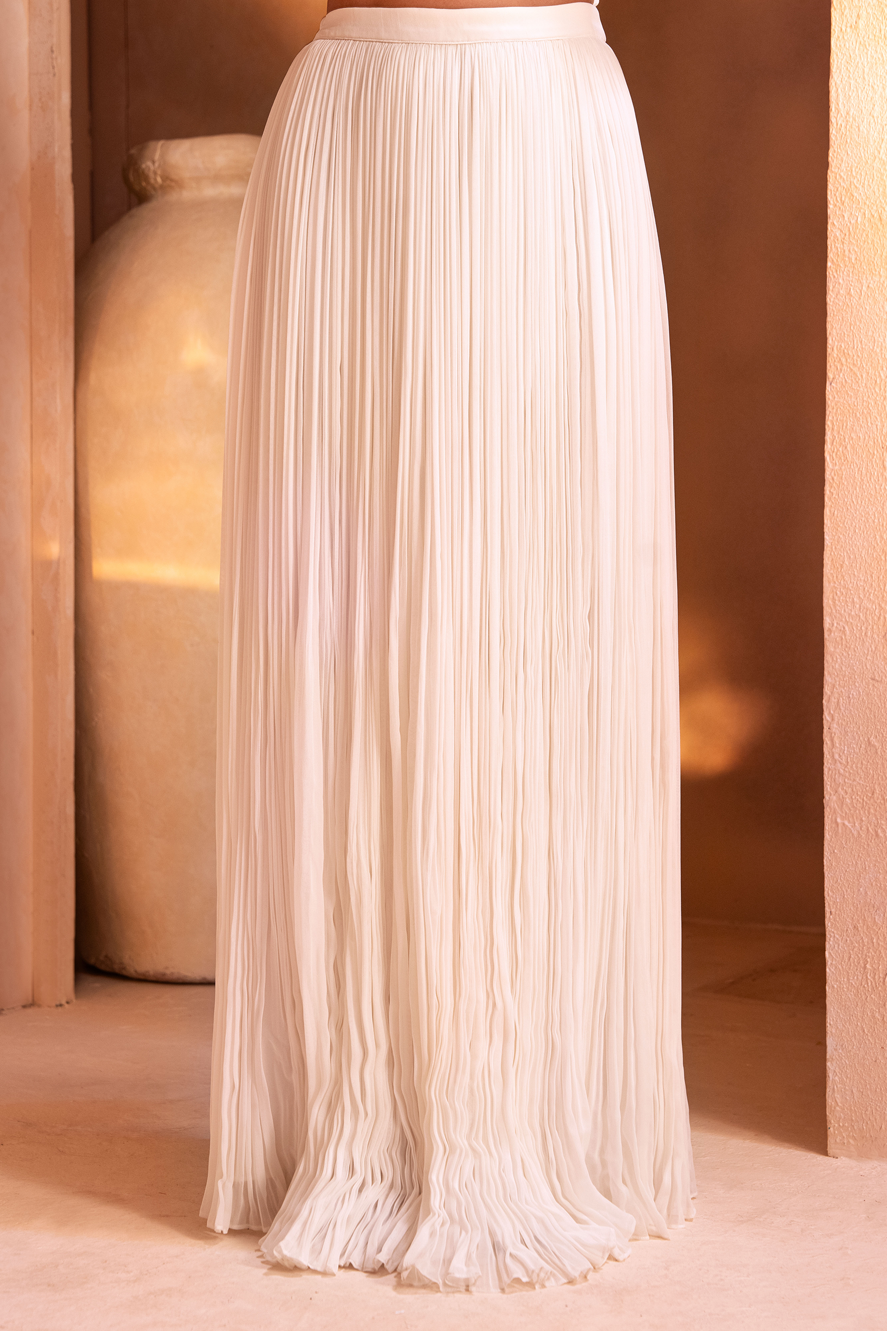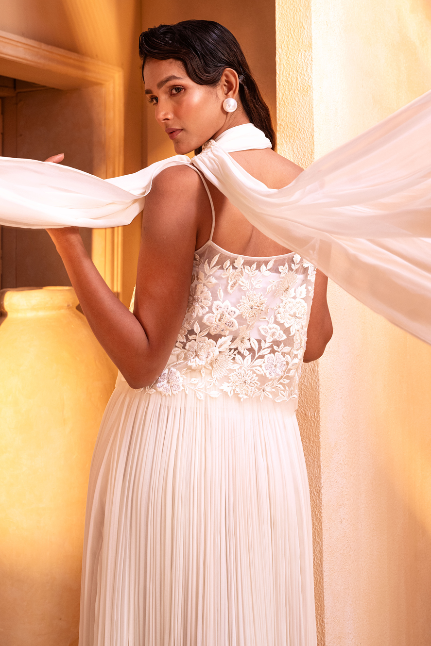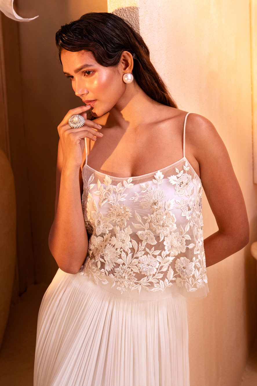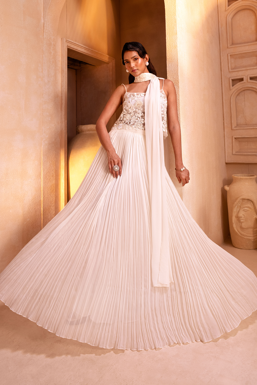 Ivory Embroidered Crop Top With Gathered Skirt And Stole.