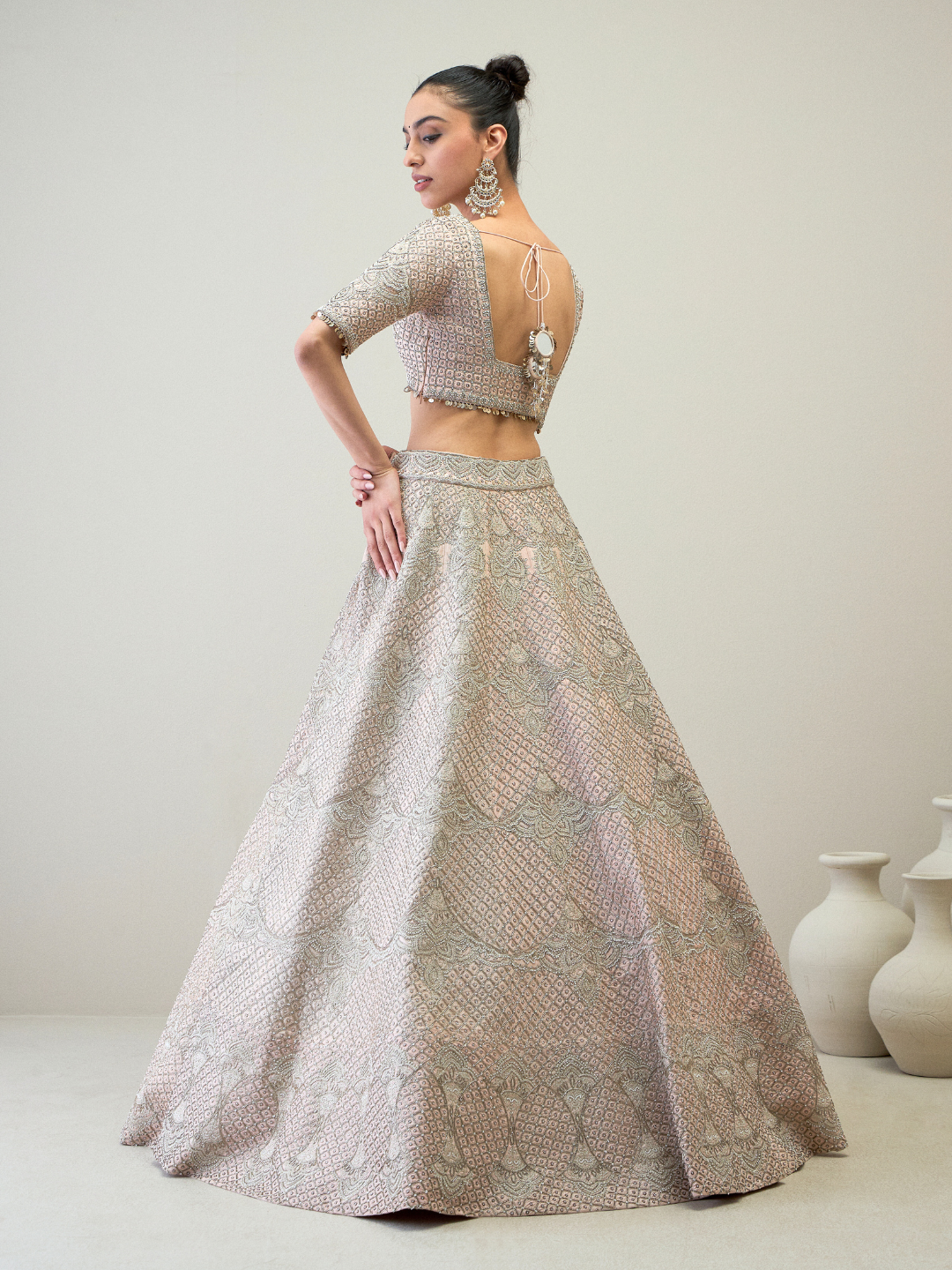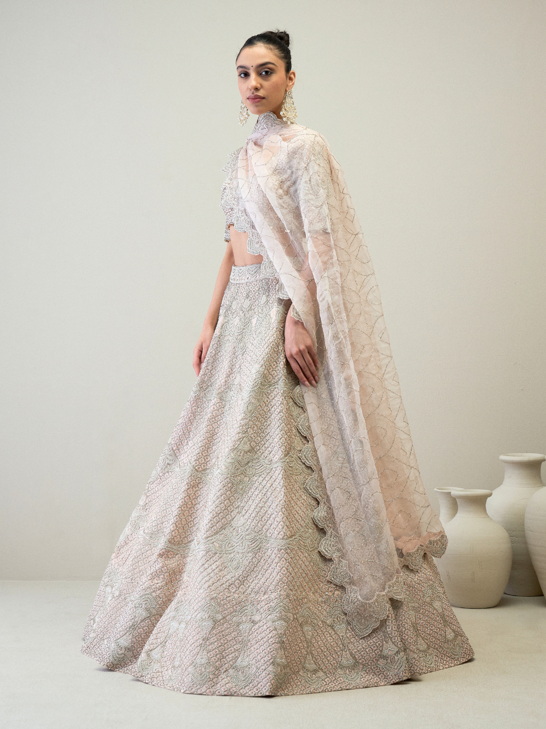 Adorned With Intricate Pink Embroidery, The Lehenga Boasts A Harmonious Blend Of Subtle And Traditional Motifs That Create A Captivating Visual Appeal. Paired With The Lehenga Is A Chic V-Neck Blouse Featuring Half Sleeves. The V-Neck Design Adds A Modern Touch While The Half Sleeves Provide A Comfortable And Stylish Fit. This Beautifully Crafted Dupatta Adds An Ethereal Touch To The Outfit, Perfect For Draping Gracefully Over Your Shoulders Or Styling In Various Sophisticated Ways.
