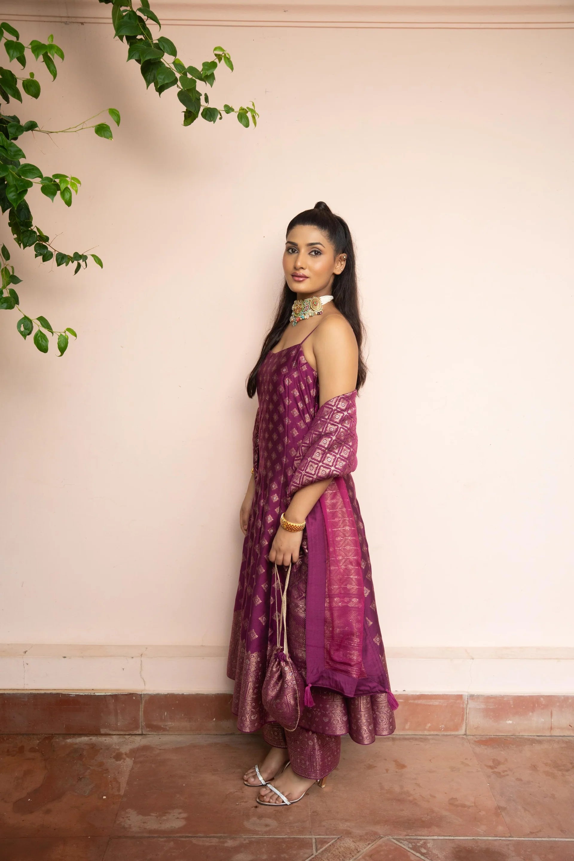 Jugnu Raat Berry Anarkali In Vegan Silk. Illuminate Every Celebration With The Jugnu Raat Anarkali, A Captivating Piece In A Rich Berry / Dark Magenta Tone Crafted From Luxurious Vegan Silk. Embellished With Intricate Zari Gota Weaving, The Fabric Comes Alive With Diamond-Inspired Motifs, Reflecting Timeless Artistry And Modern Refinement. The Mid-Length Anarkali, Paired With Sleek Pants, Strikes The Perfect Balance Between Tradition And Contemporary Flair—Making It A Versatile Choice For Festive Evenings, Weddings, And Elegant Soirées.