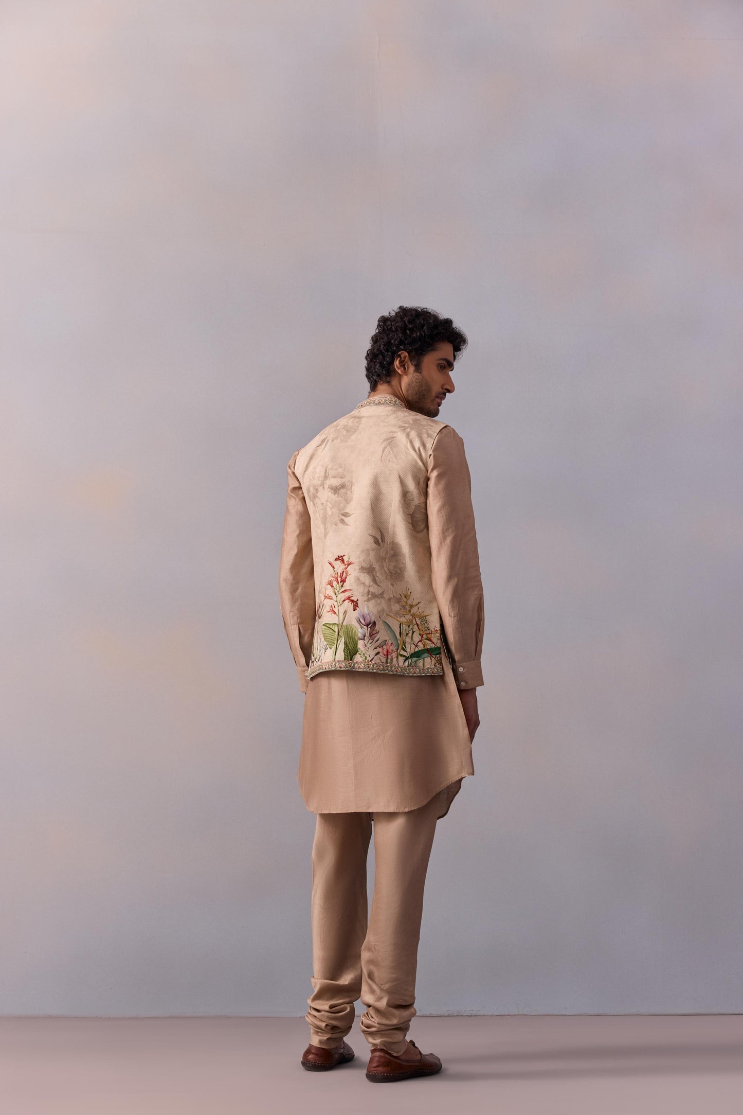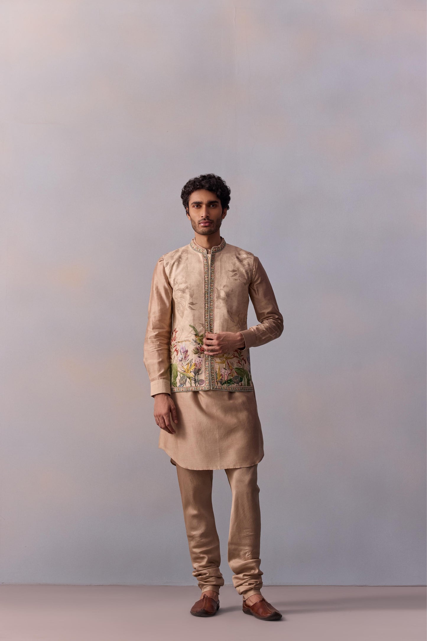 Featuring A Festive Bandi Set In Nature Inspired Print. Adorned With Detailing On Neck, Placket And Border. It Comes With Plain Kurta And Churidar. Perfect Outfit For That Effortlessly Elegant Look.