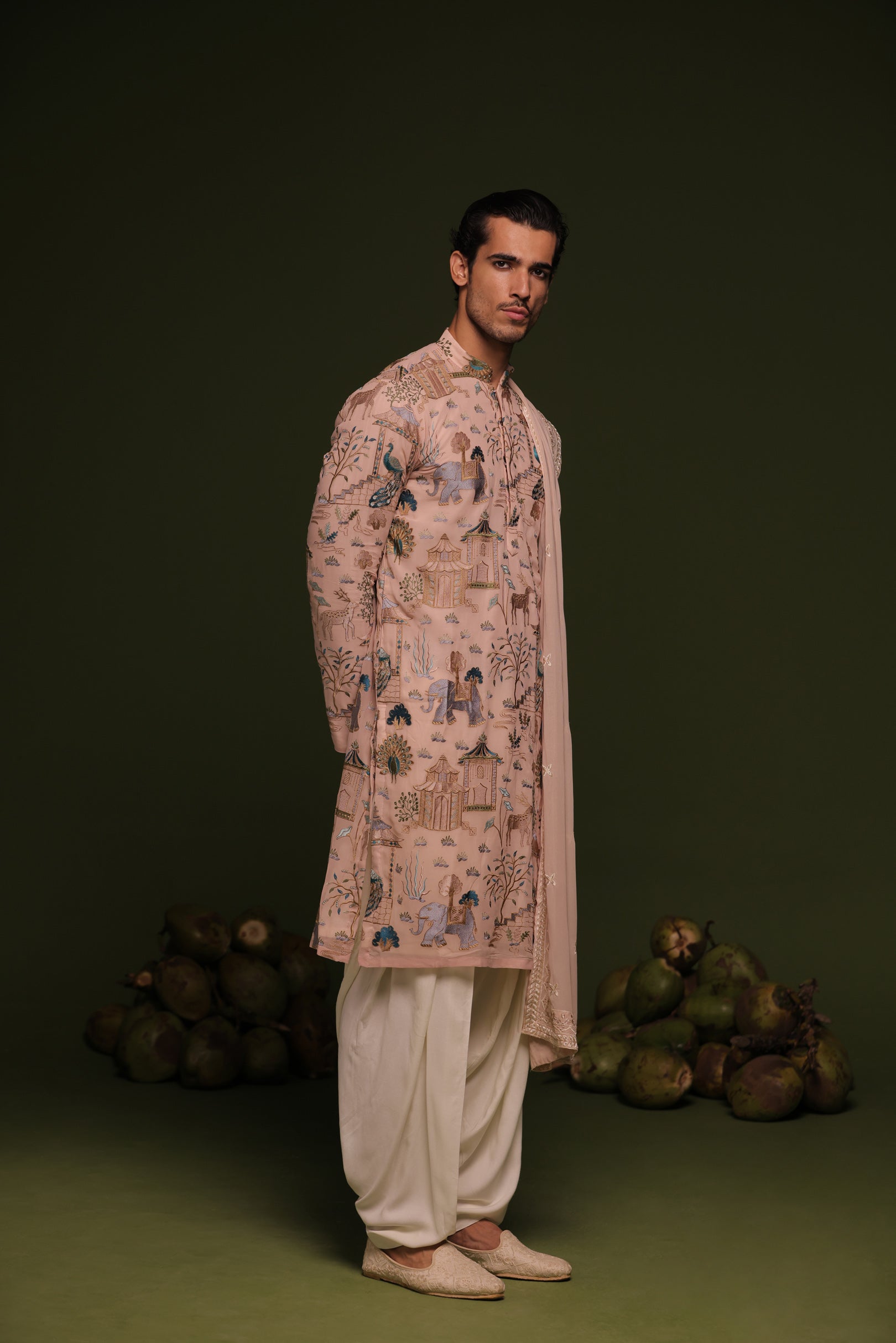 This Sophisticated Ensemble Showcases Reshom And Sequined Embroidery On The Kurta, With Detailed Embroidery On The Collar, Cuffs, And Daaman. Paired With A Heavily Embroidered Dupatta And Ivory Patiyala Trousers, The Kurta Also Features A Viscose Lining And Two Pockets For Added Comfort.