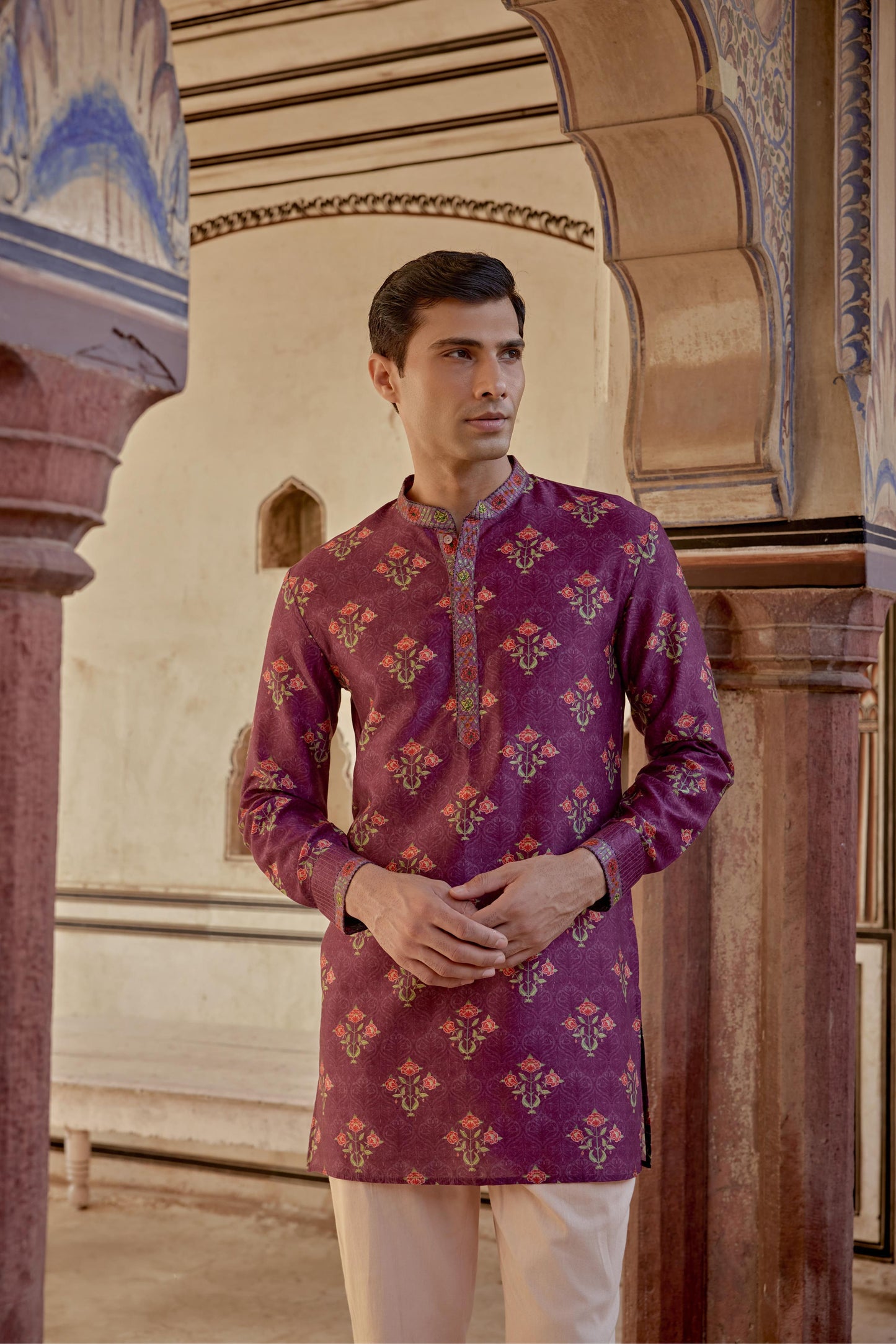 Indulge In Elegance In Our Classic Karam Kurta Set. Classic Vintage Floral Design All Over. Embraced With Embroidered Neck Band And Placket Perfect For That Contemporary Indian Look.