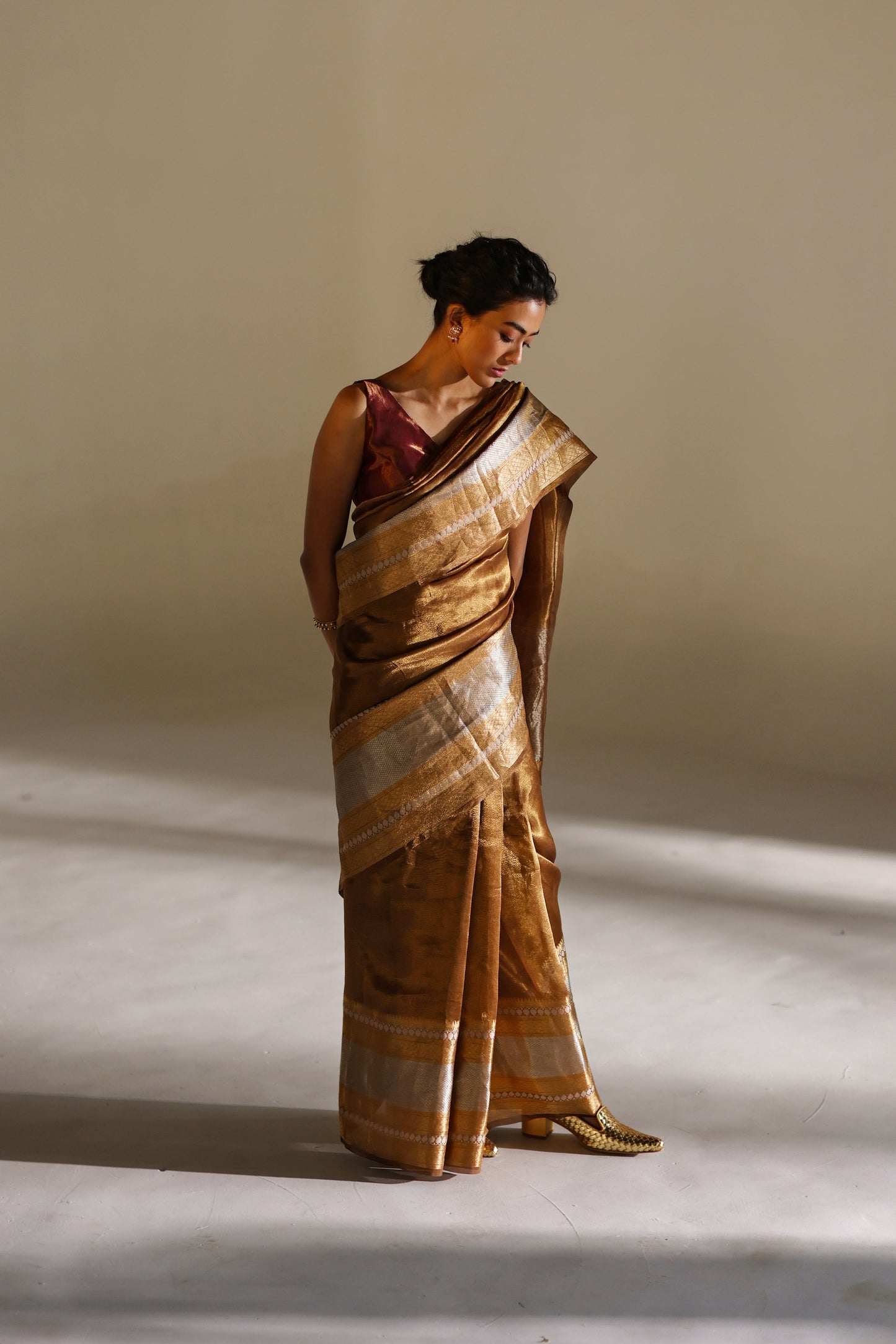 Woven In Tissue Silk, A Grey Saree Paired With A Contrasting Bronze Unstitched Blouse Epitomizes An Intricately Detailed Broad Border.