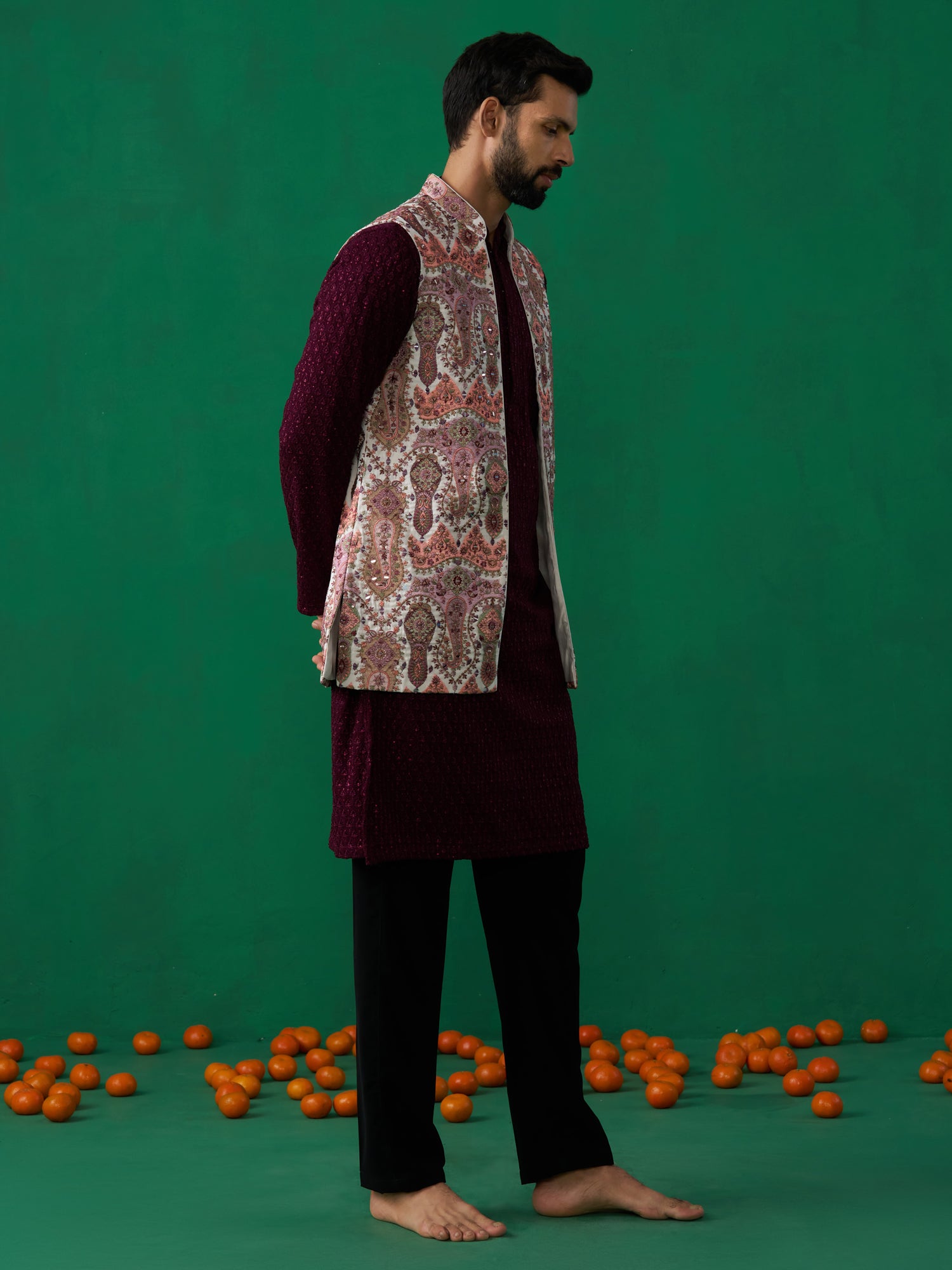 This Sophisticated Ensemble Is Perfect For Festive, Wedding, And Sufi Night Wear. It Features A Long-Sleeved, Dark Kurta With A Subtle, All-Over Embroidered Texture. This Is Paired With Straight-Cut Trousers. The Standout Piece Is A Vibrant, Sleeveless Jacket Worn Over The Kurta, Which Showcases A Dense, Detailed, Kashmiri-Inspired Embroidery Pattern. The Intricate Motifs And Rich Detailing Of The Jacket Create A Bold Contrast Against The Dark Base, Making For A Striking And Stylish Look.