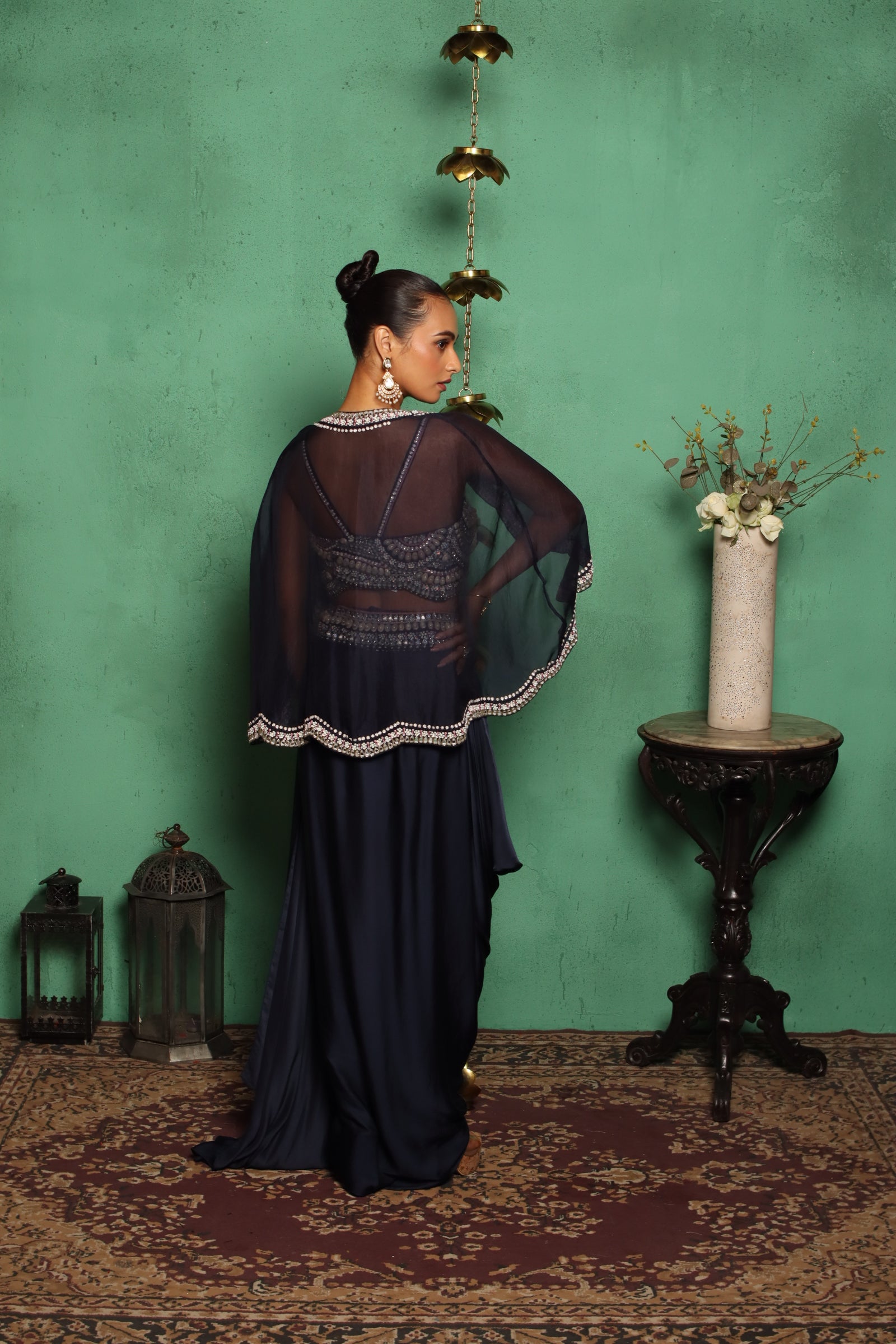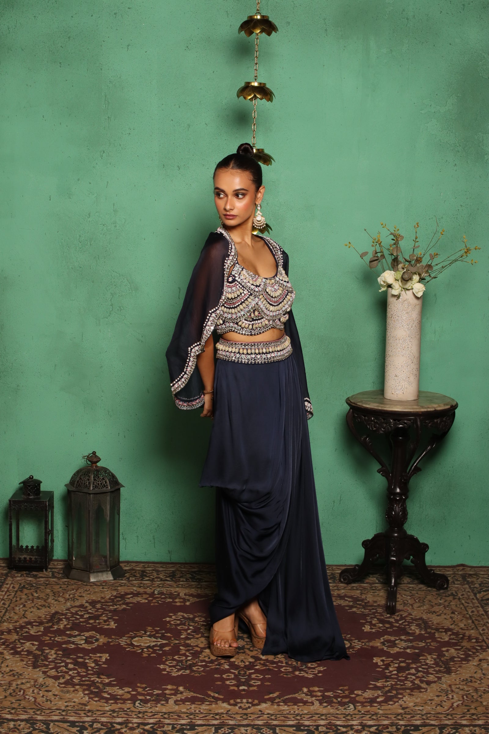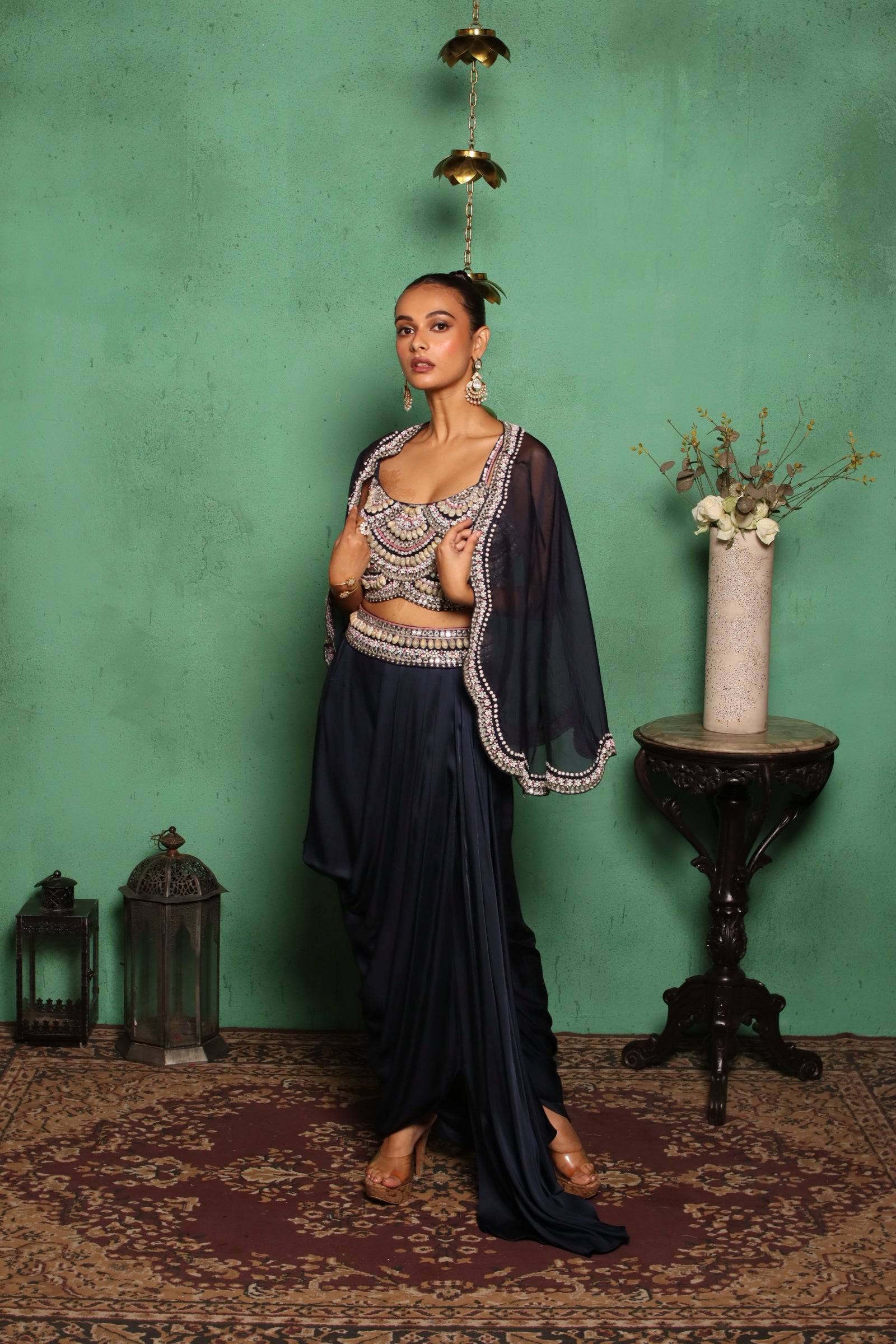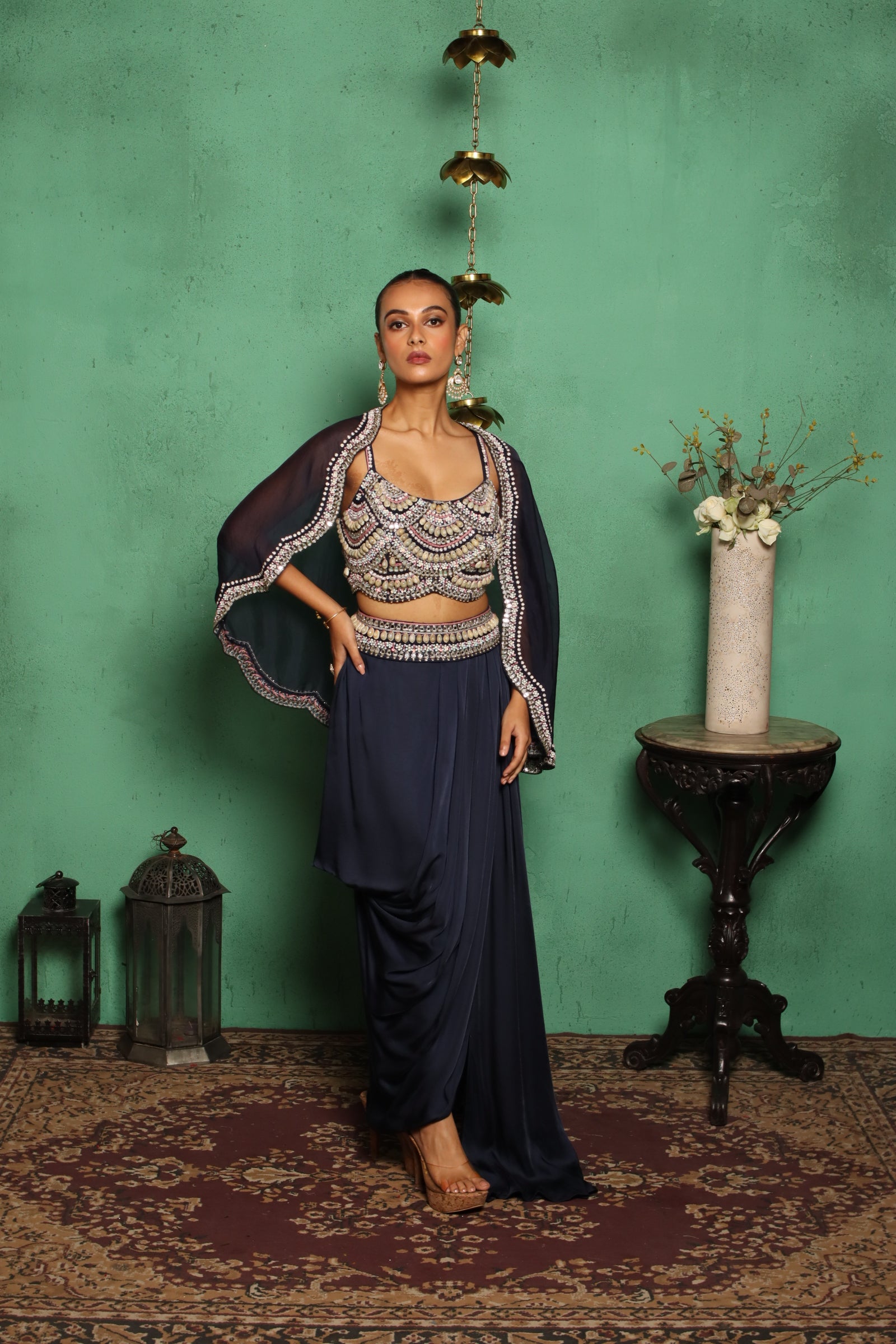 Make A Statement! This Show-Stopping Kodi-Worked Bustier & Belt Set Paired With A Flowing Dhoti Skirt & Cape Is Your Perfect Mehendi Or Carnival Look.