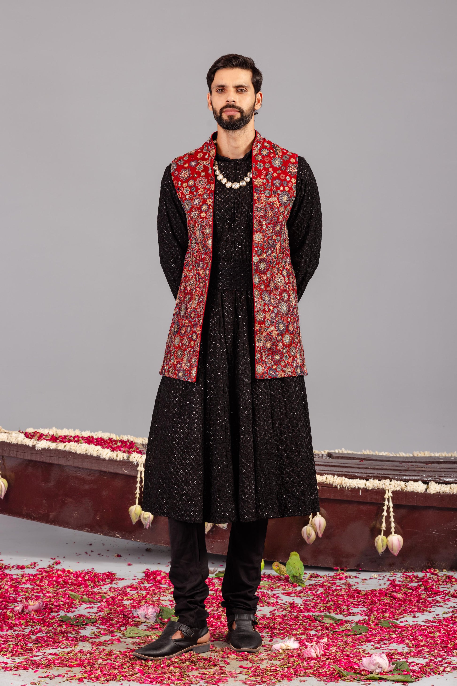 This Outfit Blends Classic Tradition With A Bold Contemporary Edge. It Features A Flowing Black Anarkali, Subtly Embellished With Tone-On-Tone Embroidery, Creating A Rich, Textured Base. Layered Over It Is A Striking Red Jacket, Densely Embroidered With Intricate Floral And Circular Motifs Reminiscent Of Regional Craft Traditions Like Mirror Work Or Zari. The Jacket’s Vibrant Color Contrasts Beautifully Against The Black, Making It The Focal Point. Paired With Black Churidar Bottom. Anarkali Is Cinched Using Embroidered Belt. The Look Feels Festive, Regal, And Perfect For Weddings Or Evening Occasions.