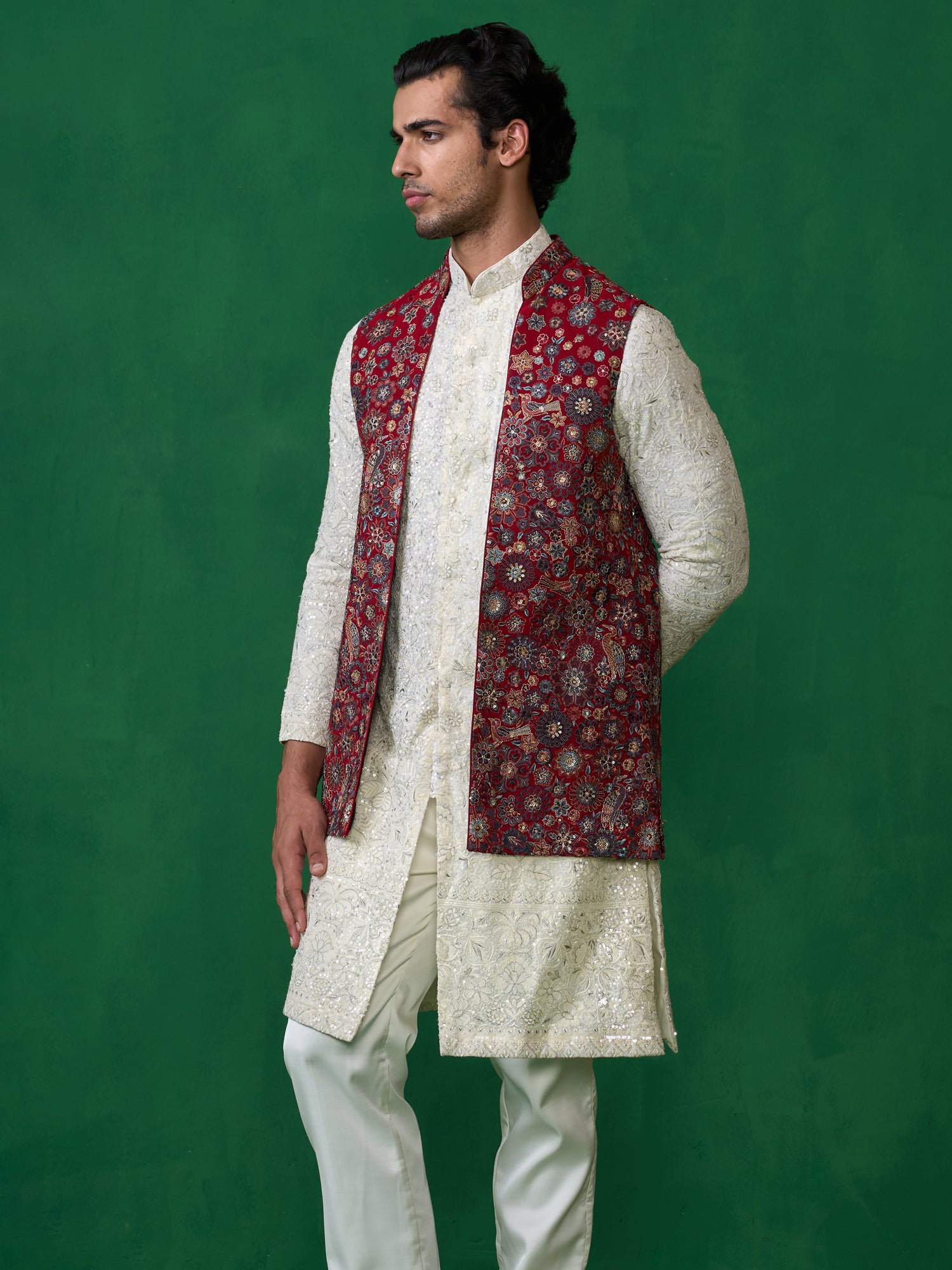 This Striking Ensemble Is An Excellent Choice For Festivals And Day Wedding. It Features A Long-Sleeved Kurta With A Textured, Repeating Pattern. The Kurta Is Paired With Narrow-Cut Trousers. The Most Notable Element Is The Sleeveless Jacket Worn Over The Kurta, Which Is Adorned With Elaborate Rose And Floral Embroidery. The Intricate And Ornate Detailing Of The Jacket Creates A Bold Contrast Against The Textured Base, Offering A Sophisticated And Visually Rich Look.