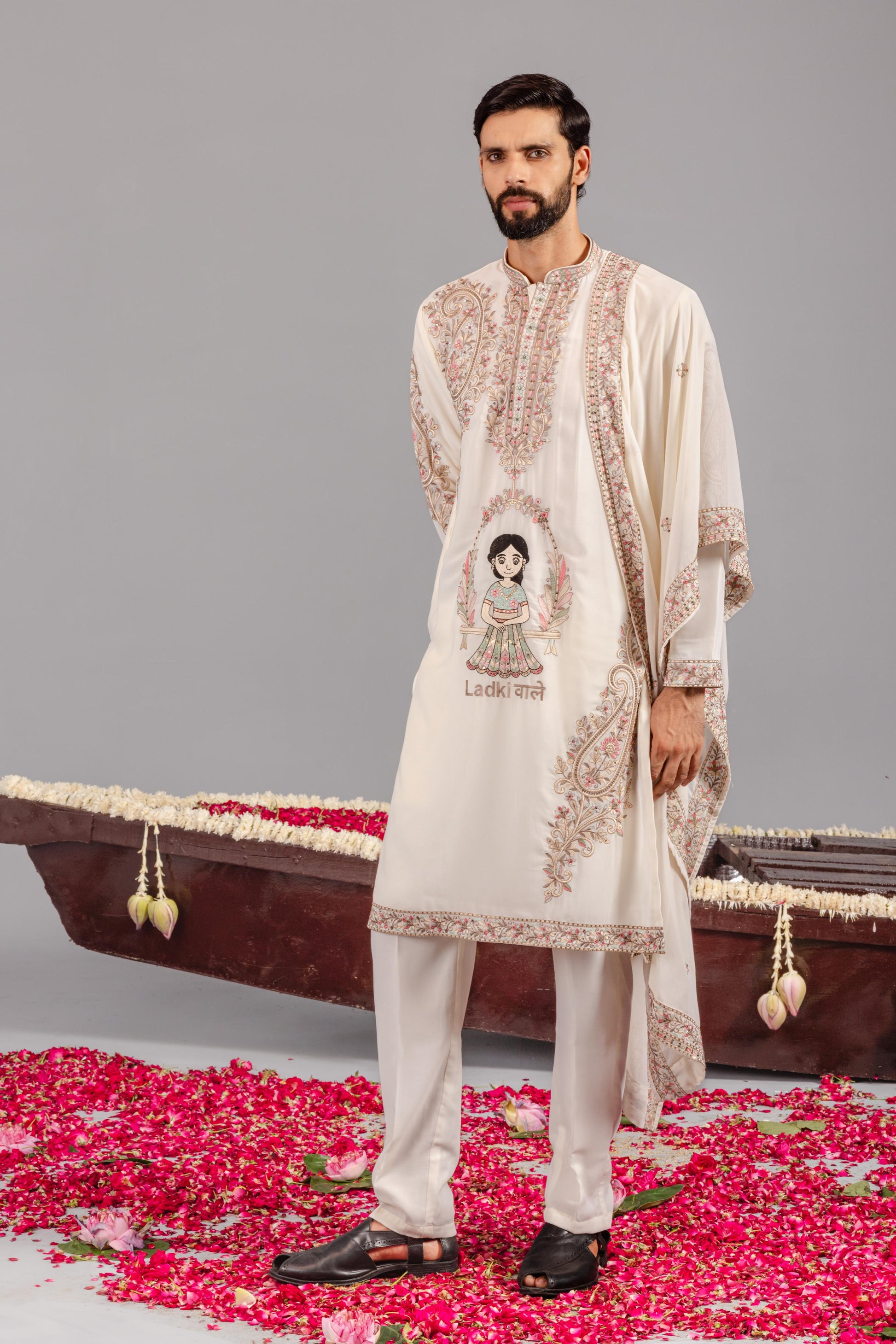A Poetic Fusion Of Tradition And Quirk, Celebrating The Modern Male Family Member From The Bride’s Side A Regal Cream Kurta Set Adorned With Heritage Embroidery And A Whimsical ""Ladki Wale"" Motif.