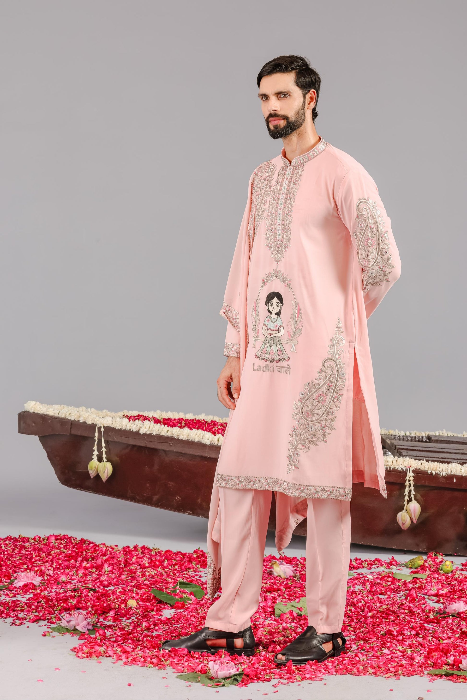 A Poetic Fusion Of Tradition And Quirk, Celebrating The Modern Male Family Member From The Bride’s Side A Regal Blush Pink Kurta Set Adorned With Heritage Embroidery And A Whimsical ""Ladki Wale"" Motif.