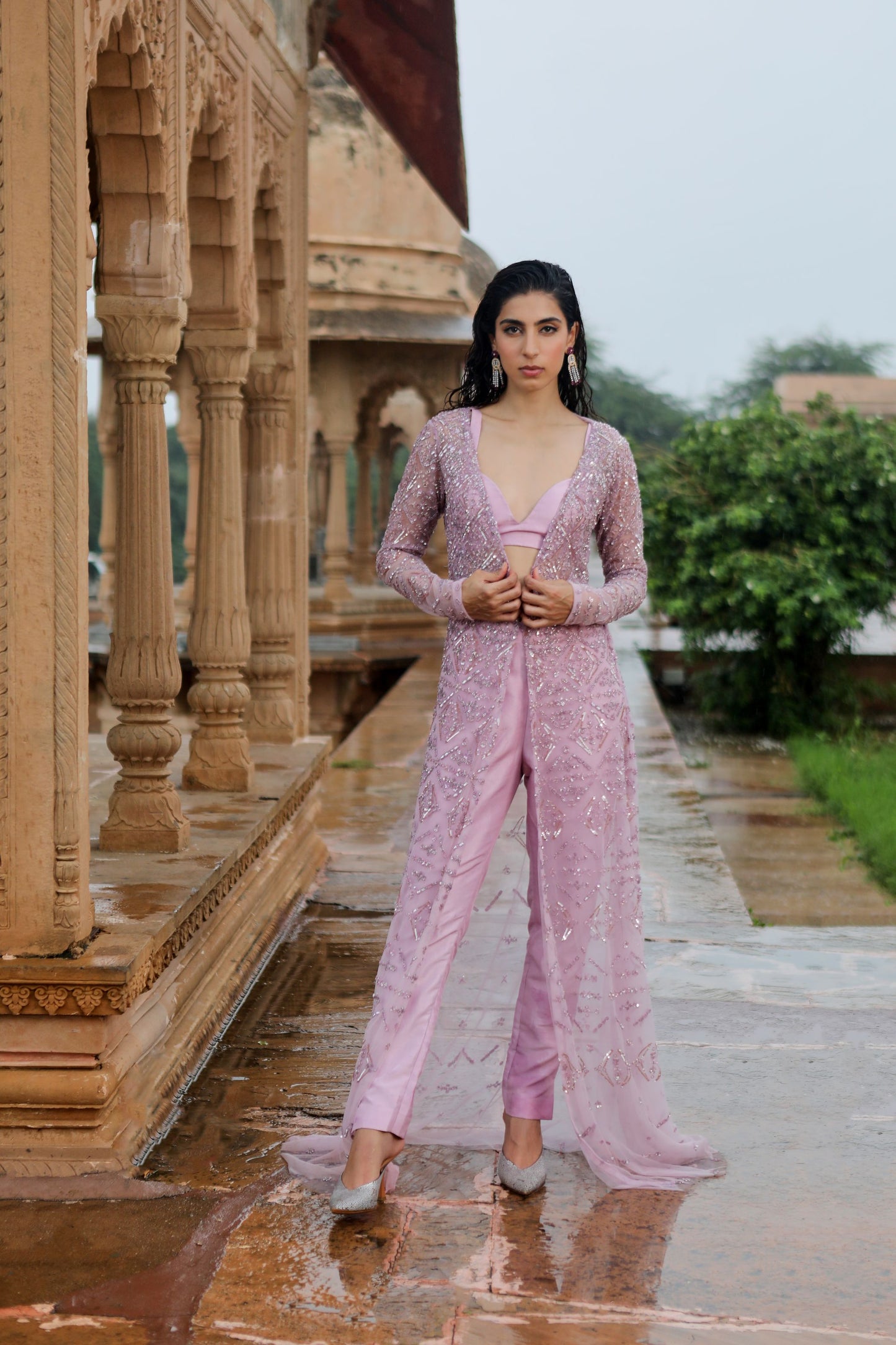 The Lavender Bustier And Pants Based On Satin Is Paired With An Embellished Jacket Based On A Butterfly Net. Adorned With Tonal Sequin Embroidery, This Jacket Set Adds A Touch Of Beauty To Your Look.