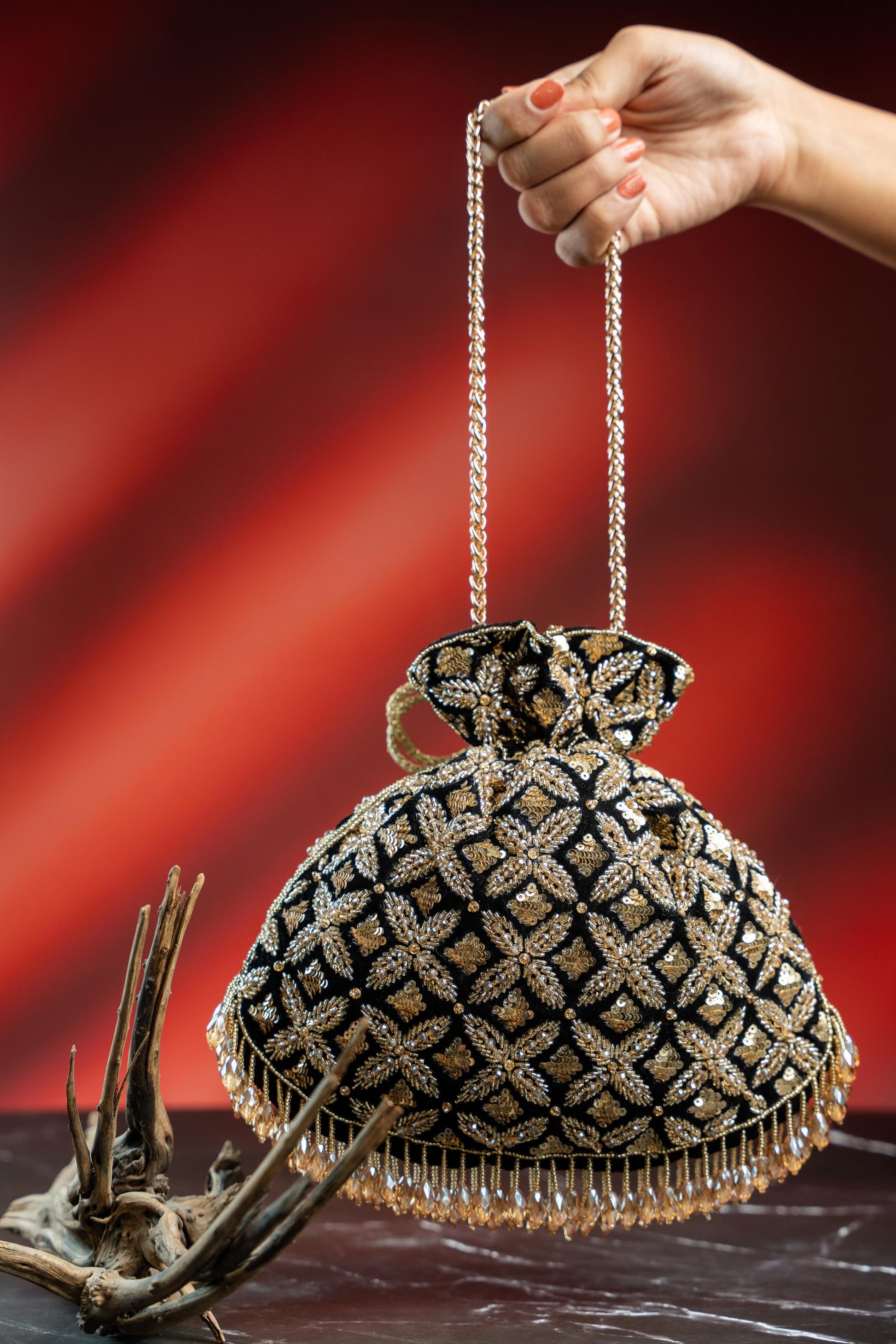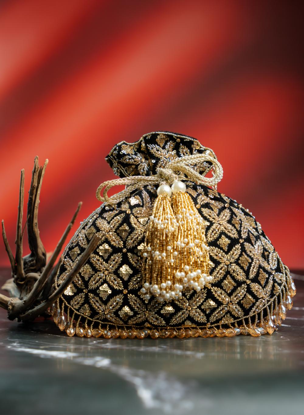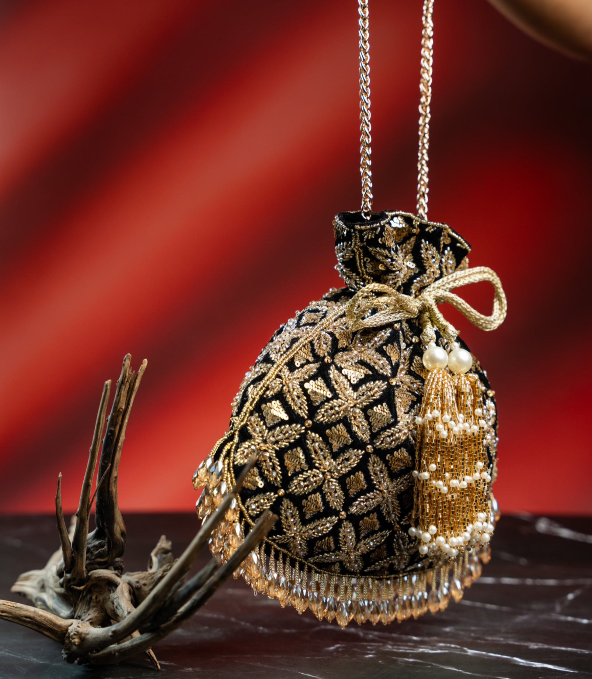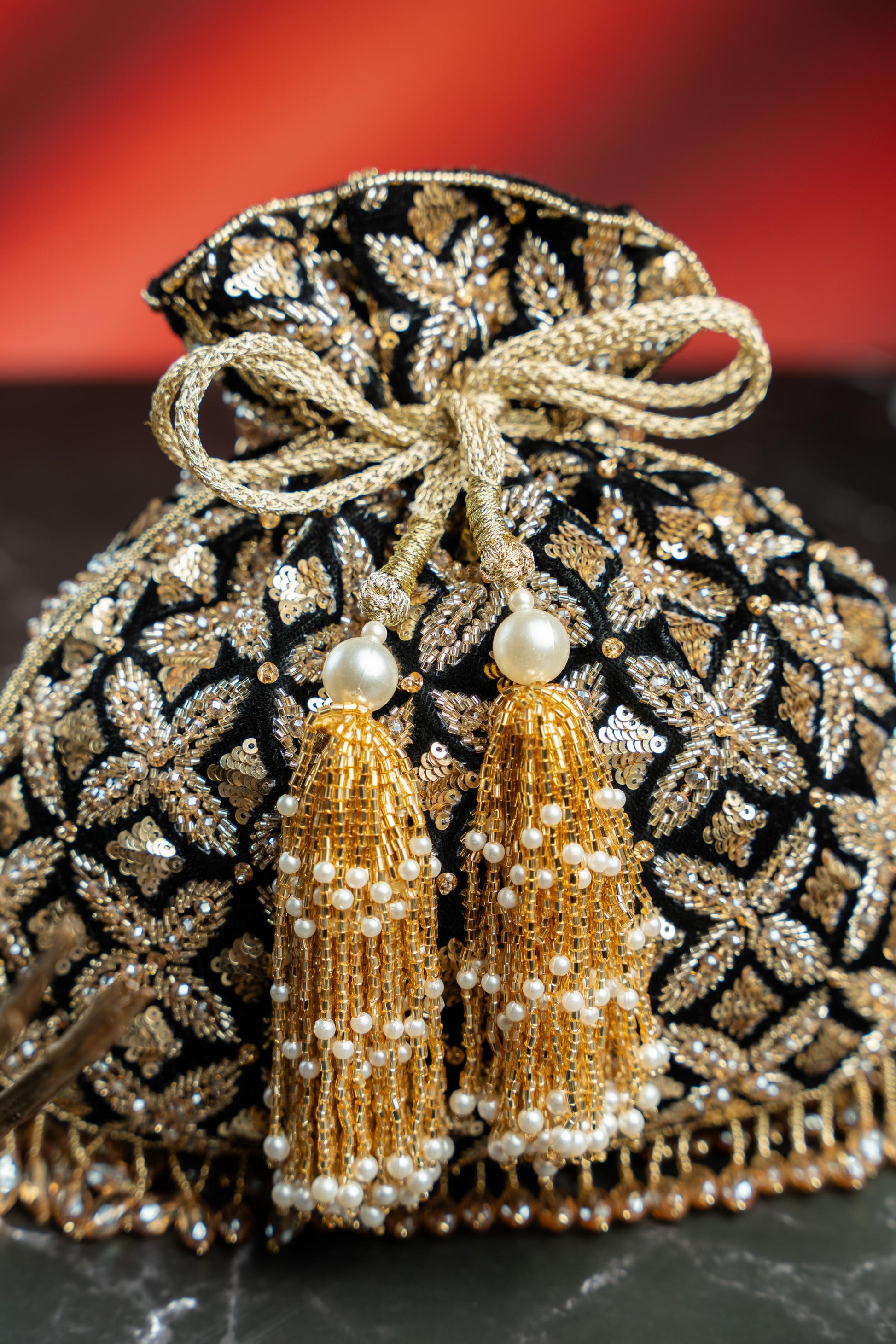 A Perfect Blend Of Old-World Charm And Modern Glam, This Black & Antique Gold Potli Is Crafted To Make A Statement. The Rich Velvet Base Is Intricately Hand-Embroidered With Traditional Motifs In Metallic Thread, Creating A Regal Lattice Of Gold That Catches The Light Beautifully. It Features Opulent Handcrafted Tassels Adorned With Pearls And Golden Beads, A Glimmering Drawstring Tie, And A Crystal Drop Fringe That Adds A Playful Sparkle With Every Move. Elegant Yet Striking, It’s Ideal For Wedding Soirées, Sangeet Nights, Or Festive Evenings When You Want Your Accessory To Do The Talking.