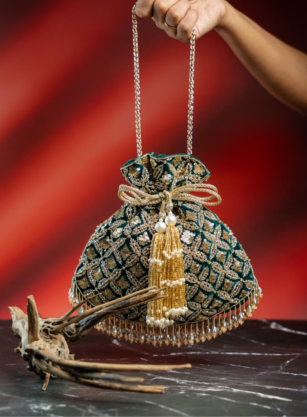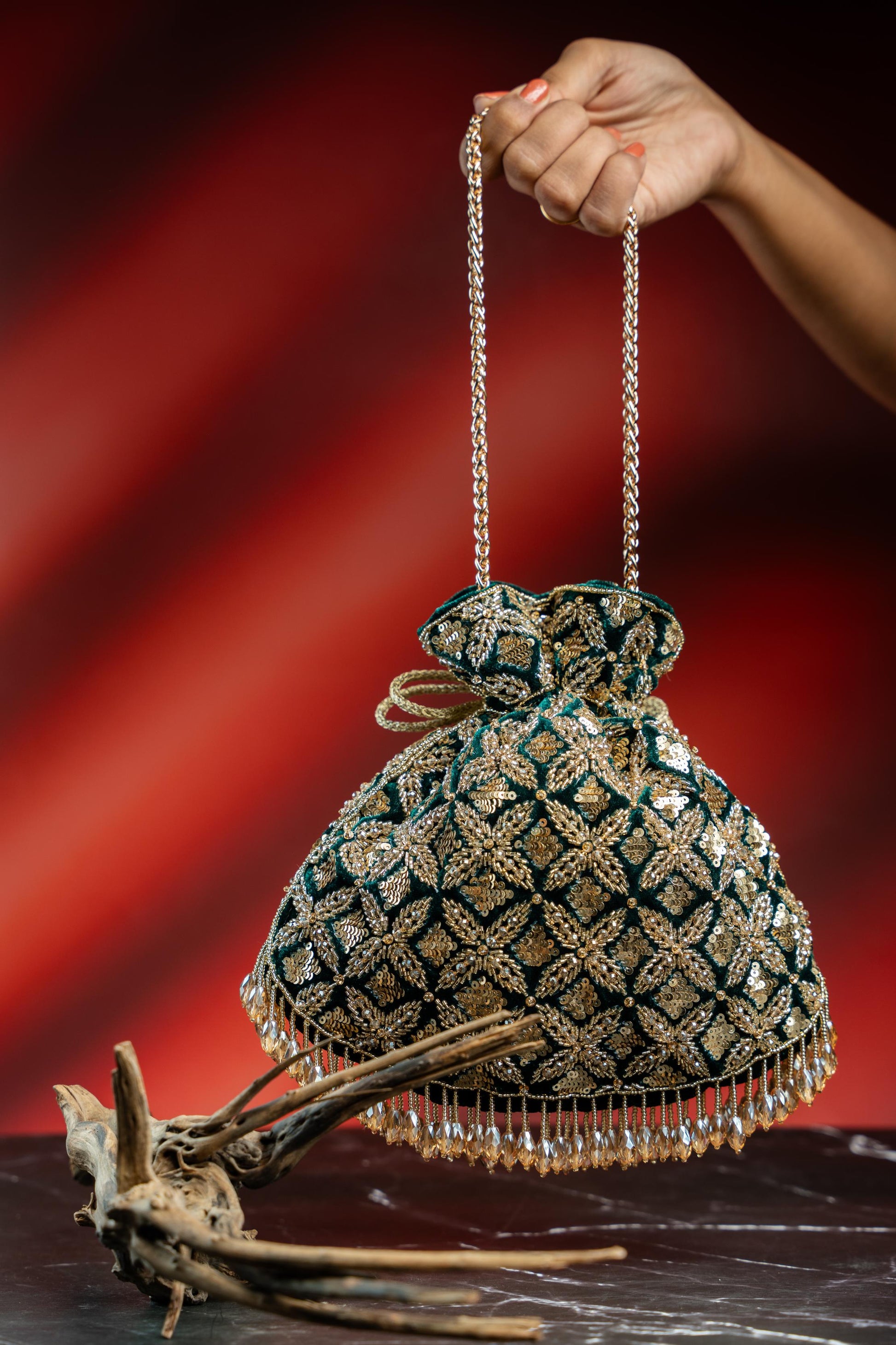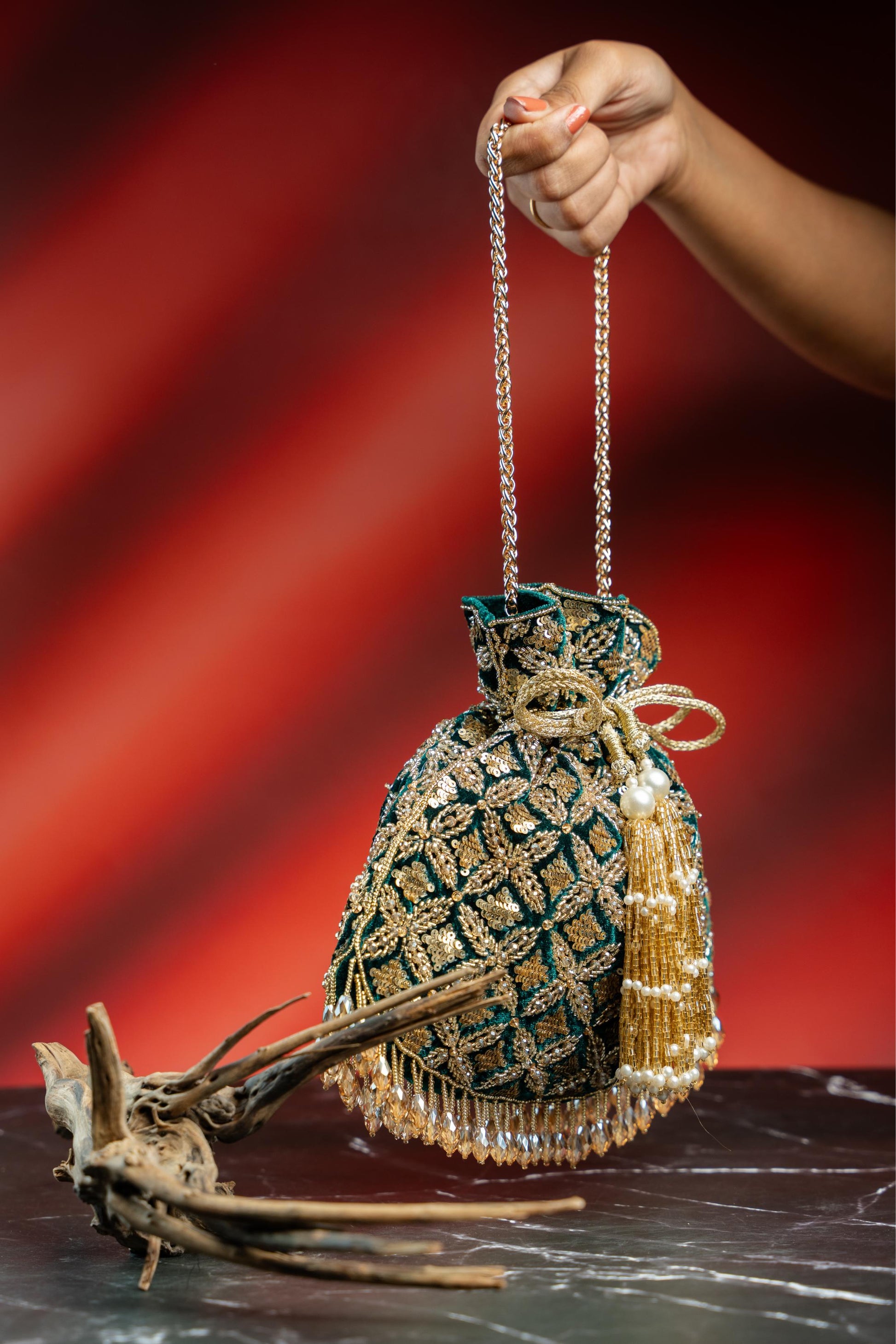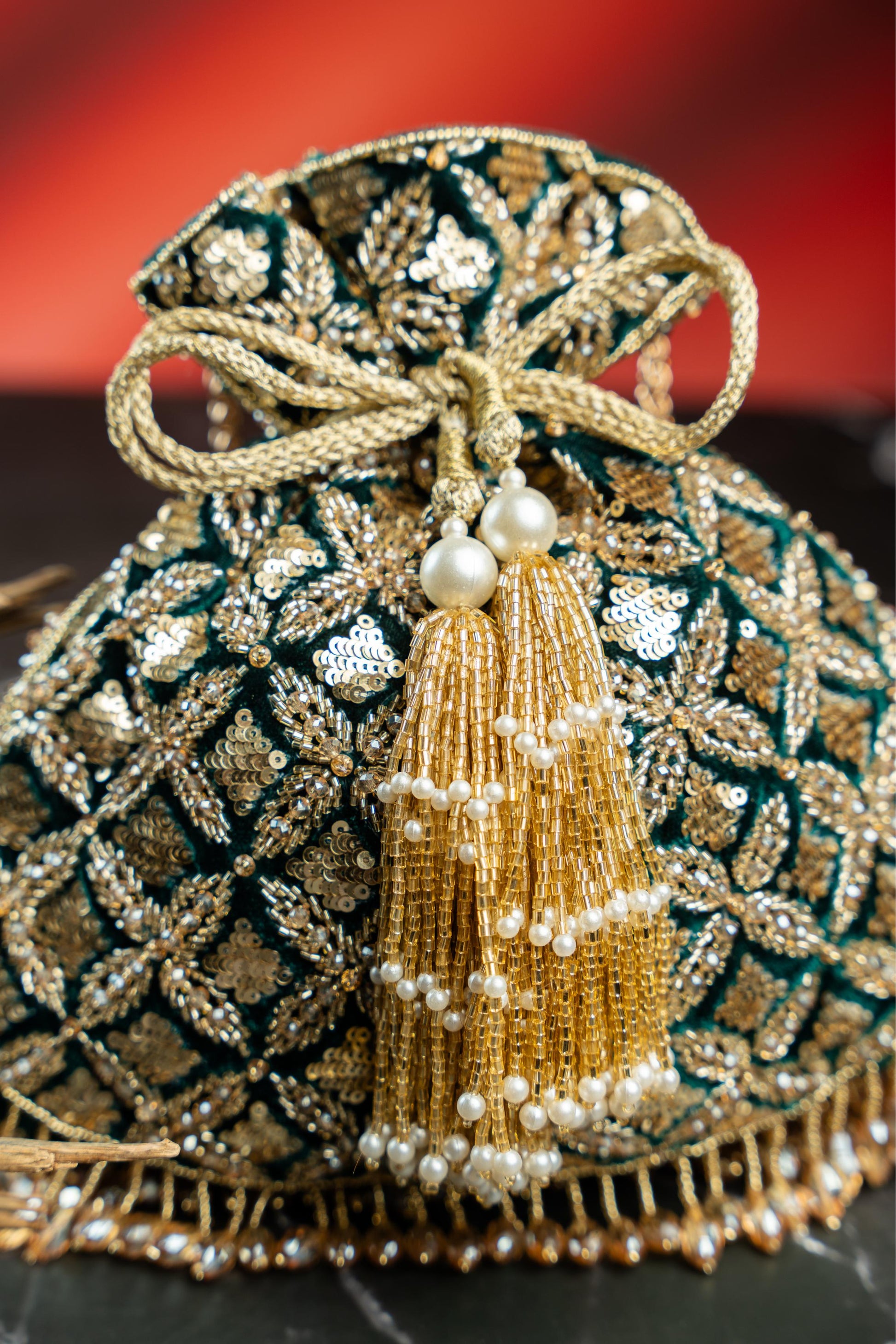 A Perfect Blend Of Old-World Charm And Modern Glam, This Emerald Green & Antique Gold Potli Is Crafted To Make A Statement. The Rich Velvet Base Is Intricately Hand-Embroidered With Traditional Motifs In Metallic Thread, Creating A Regal Lattice Of Gold That Catches The Light Beautifully. It Features Opulent Handcrafted Tassels Adorned With Pearls And Golden Beads, A Glimmering Drawstring Tie, And A Crystal Drop Fringe That Adds A Playful Sparkle With Every Move. Elegant Yet Striking, It’s Ideal For Wedding Soirées, Sangeet Nights, Or Festive Evenings When You Want Your Accessory To Do The Talking.