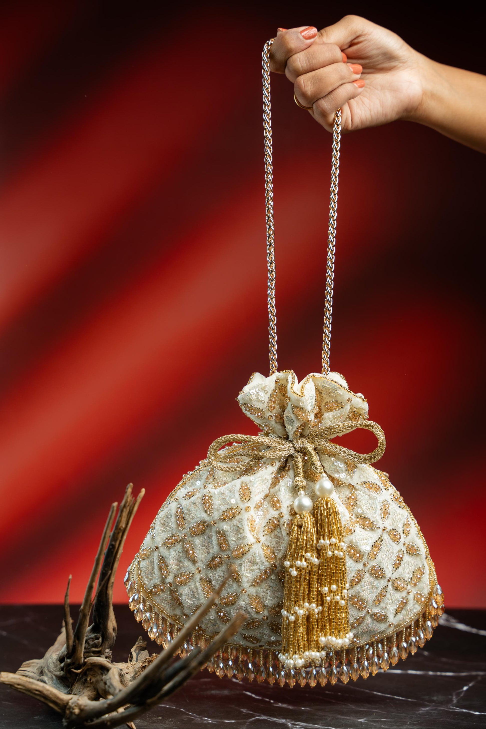 Elegant And Ethereal, This Ivory & Gold Potli Is The Epitome Of Understated Glamour. Crafted On A Rich Velvet Base, It Features Intricate Gold Thread Embroidery And Shimmering Sequin Work That Lends It A Soft, Luminous Glow. The Round Silhouette Is Complemented By Handcrafted Tassels With Pearls And Golden Beads, While A Scalloped Crystal Fringe Adds A Sparkling Finish. With Its Dreamy Palette And Luxe Detailing, This Potli Is Perfect For Bridal Looks, Reception Nights, Or Any Occasion That Calls For A Hint Of Sophistication.