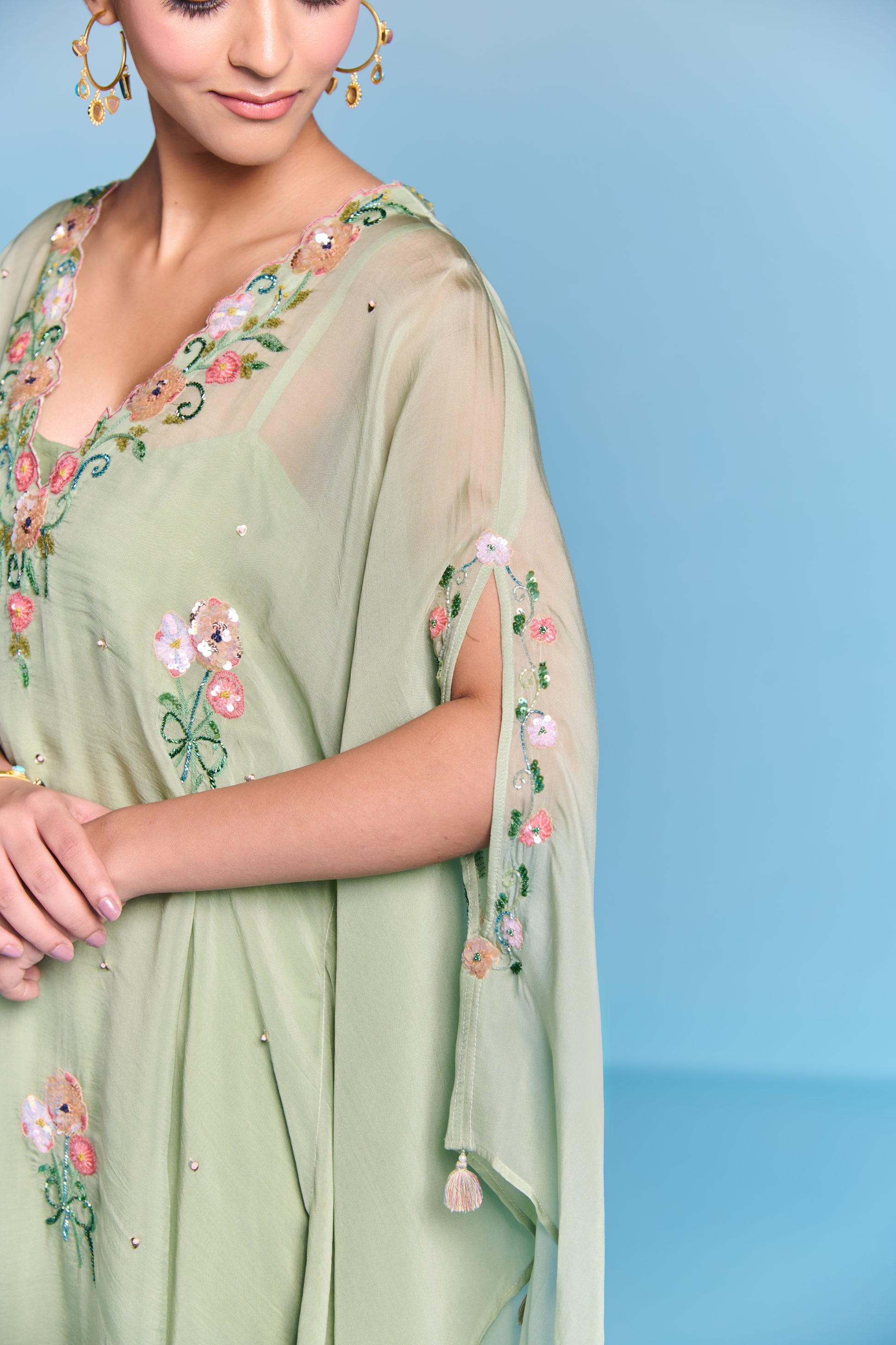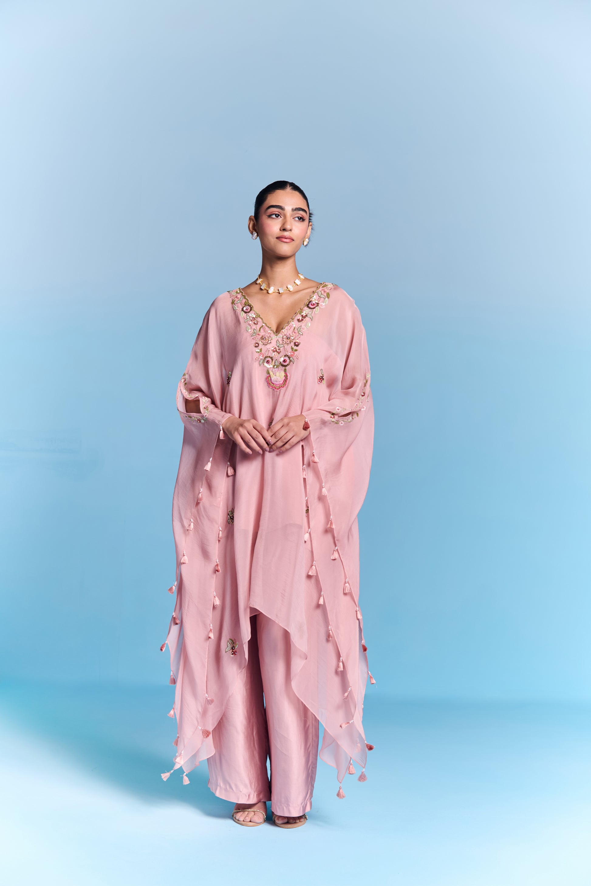 Immerse Yourself In The Ethereal Beauty Of Hand Embroidered Kaftan Set. Detailing Floral Of Sequin And Threadwork On Neckline And Sleeves Cuffs. Paired With Coordinated Pants For Lightweight And Effortlessly Graceful Look. Perfect To Create Your Summer Style Statement.